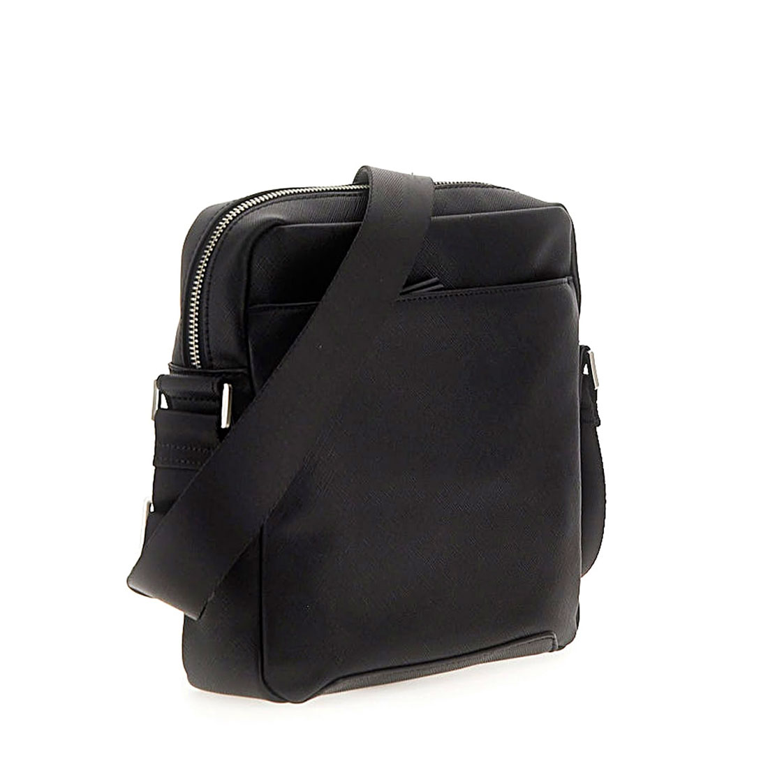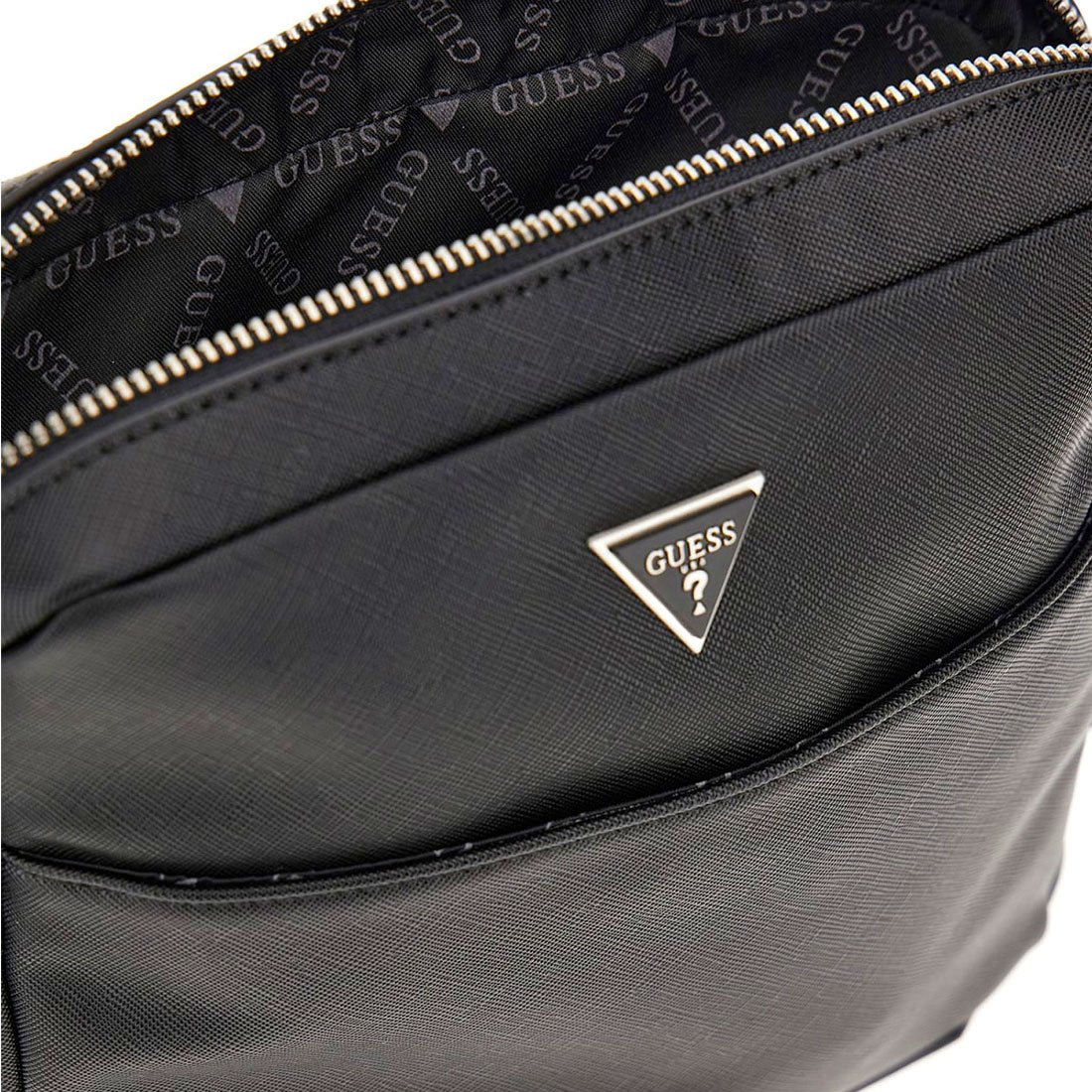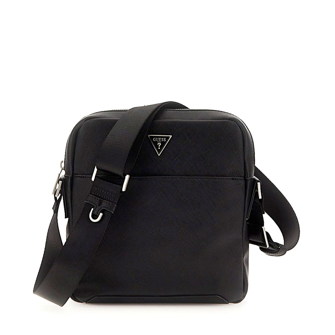 Ανδρική τσάντα Guess. Αυτό το ανδρικό χιαστί τσαντάκι από την νέα συλλογή της Guess μπορείτε να το συνδιάσετε με όλα σας τα ρούχα από το πρωί μέχρι το βράδυ. Διαθέσιμο σε μαύρο χρώμα με μεταλλικό τρίγωνο με το λογότυπο στο μπροστά μέρος. Κλείσιμο με φερμουάρ. Ρυθμιζόμενο λουράκι ώστε να την φορέσετε χιαστί ή στον ώμο. Συνθετικό δέρμα εξαιρετκής ποιότητας.