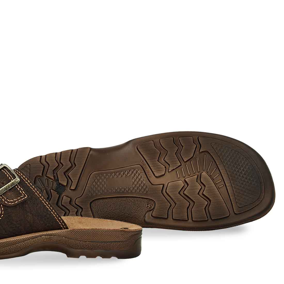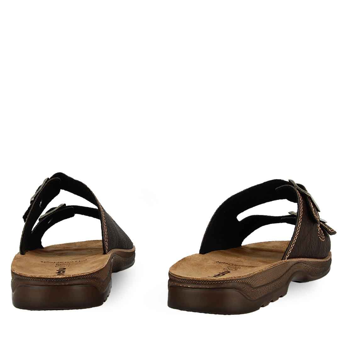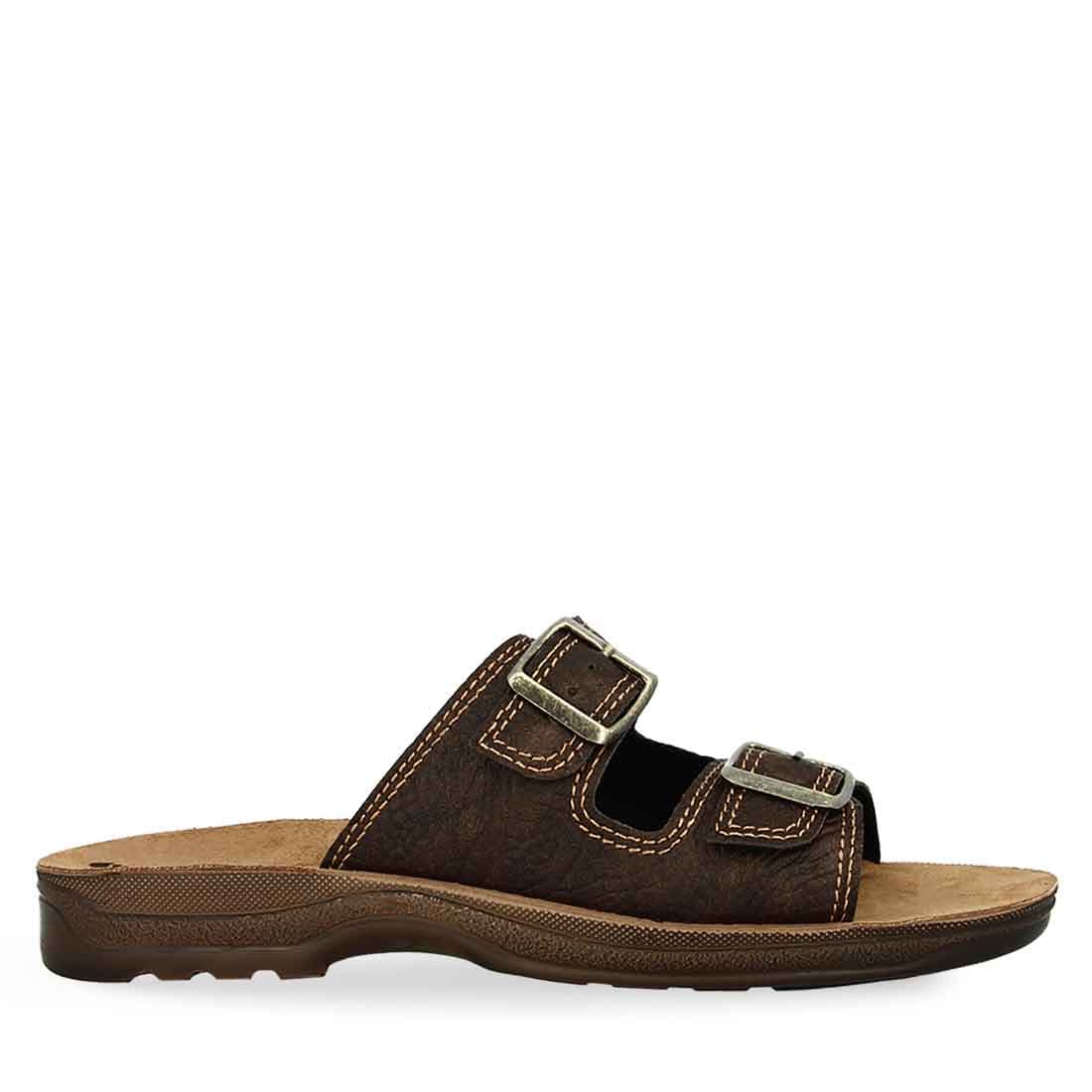 Παντόφλες ανδρικές σε καφέ χρώμα από συνθετικό δέρμα με δύο αγκράφες που αυξομειώνονται. Έντονες εξωτερικές ραφές. Δερμάτινος, αναπαυικός πάτος με σόλα που δεν γλιστράει.