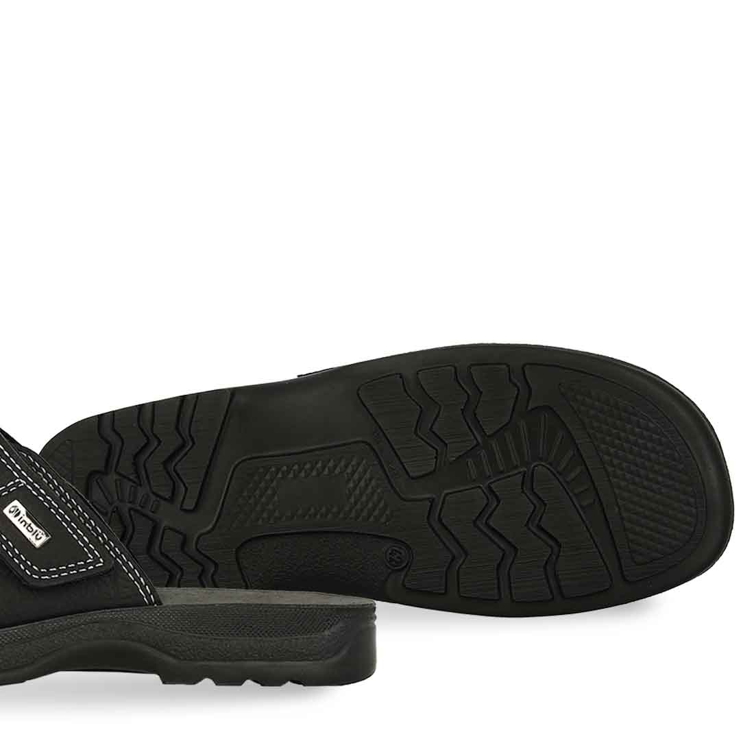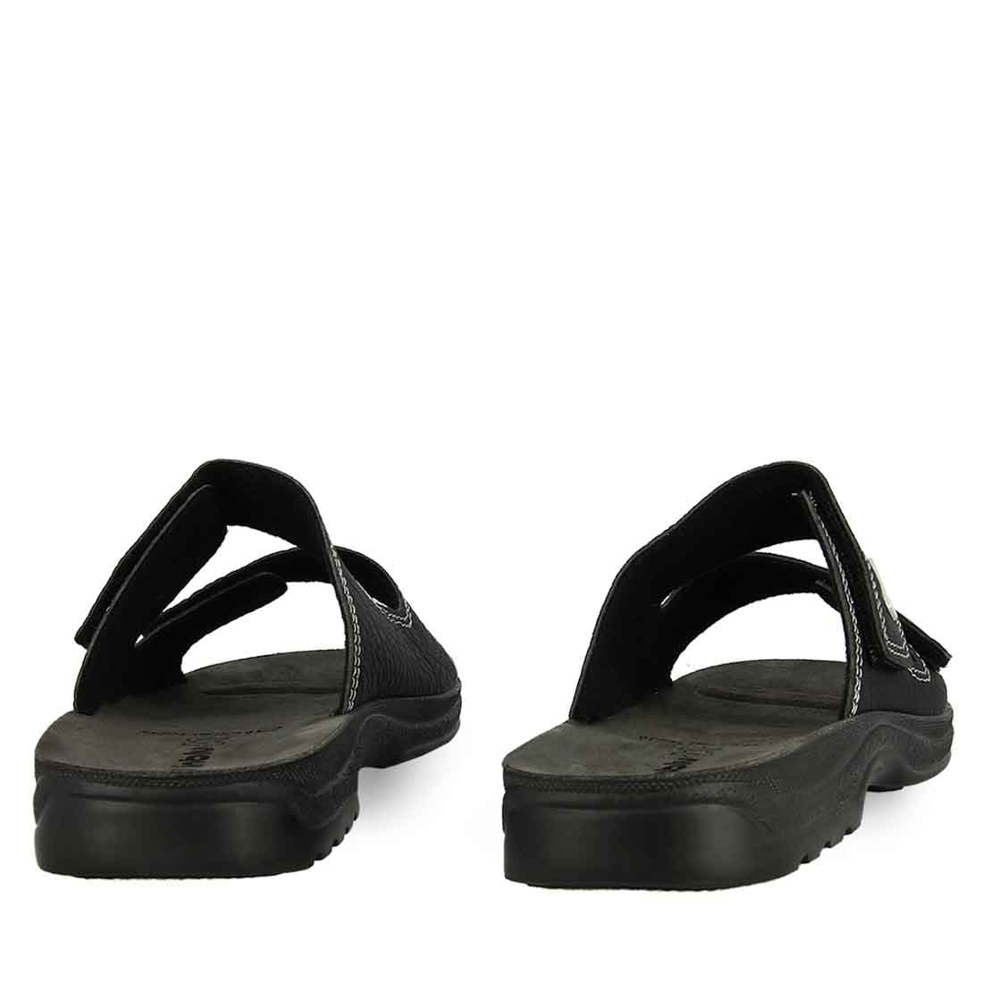 Παντόφλες ανδρικές σε μαύρο χρώμα από συνθετικό δέρμα με δύο velcro φάσες με έντονες εξωτερικές ραφές. Δερμάτινος, αναπαυικός πάτος και σόλα που δεν γλιστράει.