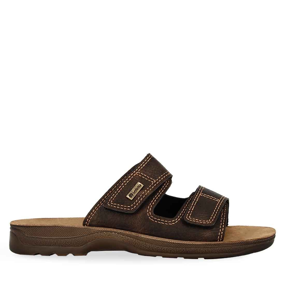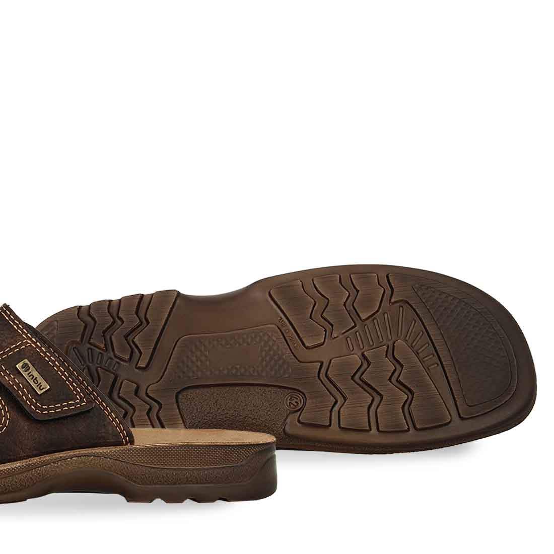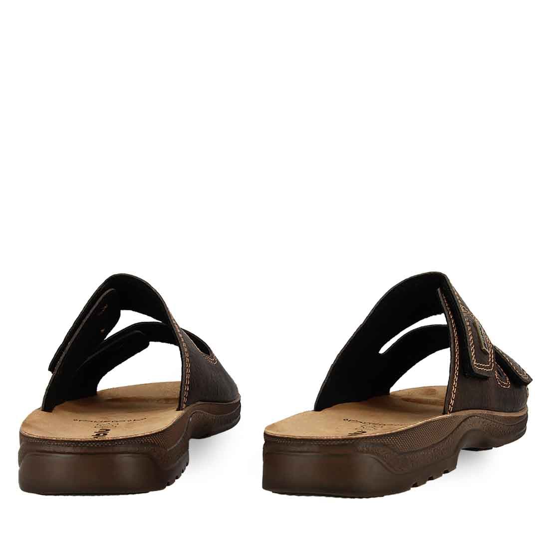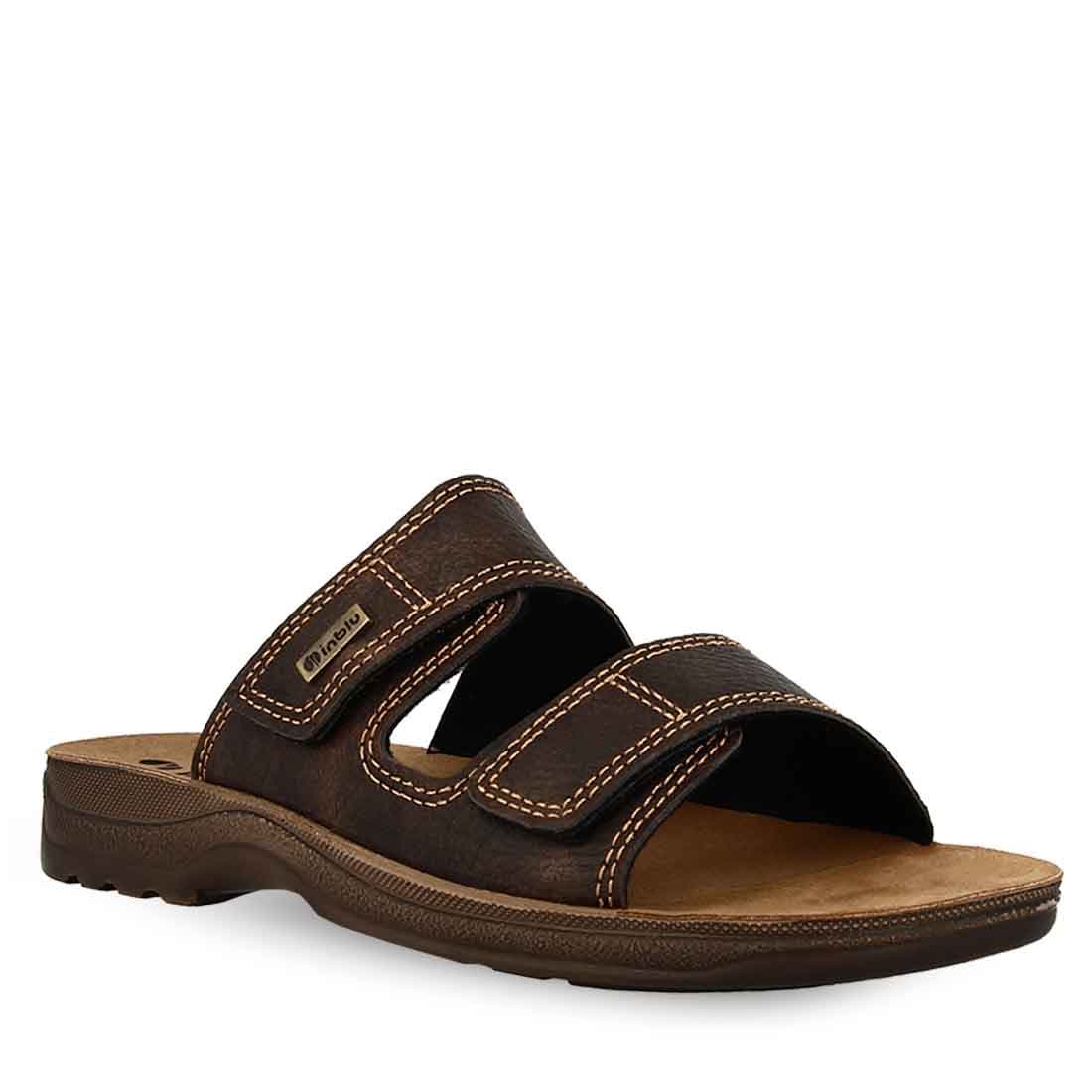 Παντόφλες ανδρικές σε καφέ χρώμα από συνθετικό δέρμα με δύο velcro φάσες. Έντονες εξωτερικές ραφές. Δερμάτινος, αναπαυικός πάτος με σόλα που δεν γλιστράει.