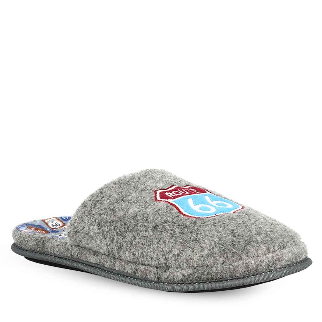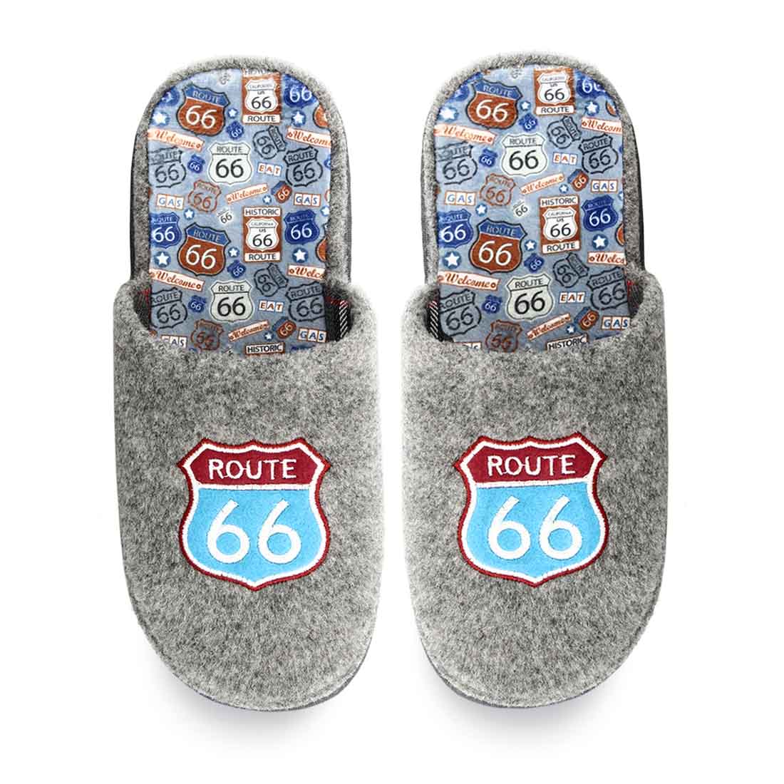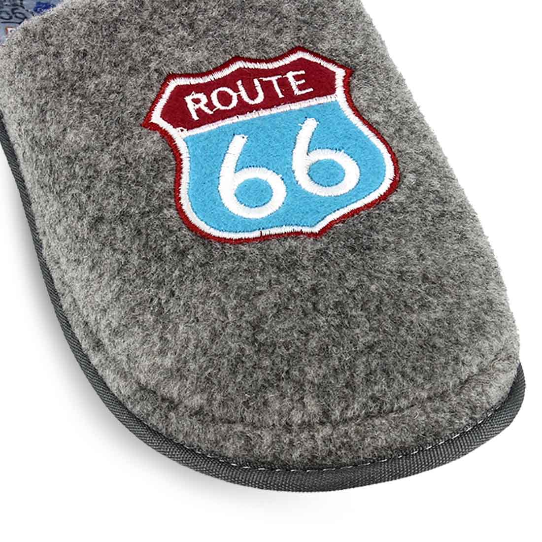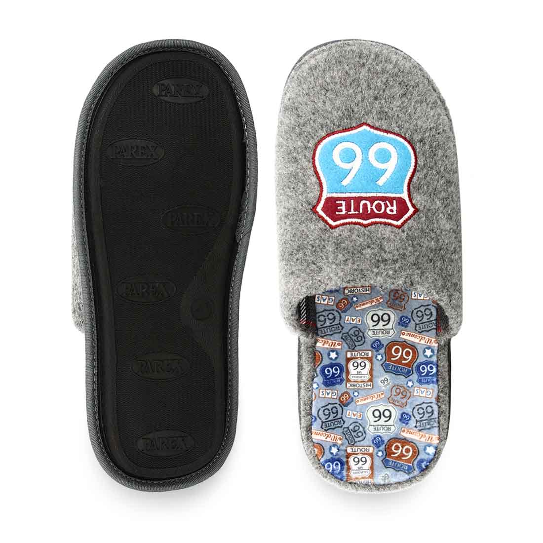Ανδρικές παντόφλες Parex με λεπτομέρεια από κεντημένο σχέδιο "Route 66" στο πάνω μέρος και στον πάτο .Διαθέτει εσωτερική υφασμάτινη επένδυση και ανατομικό πάτο. Δυνατότητα πλυσίματος στο πλυντήριο στους 30°C.