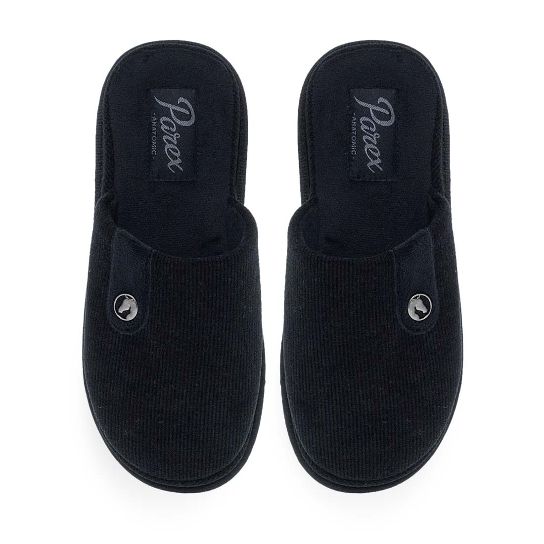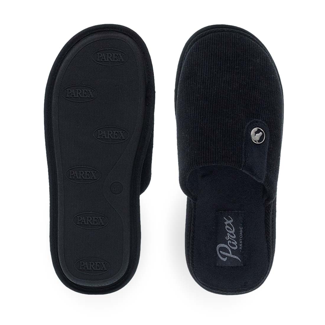Ανδρικές παντόφλες σπιτιού Parex. Ανδρικές παντόφλες Parex σε μαύρο και γκρι χρώμα, minimal σχέδιο με κουμπί στο πλάι. Απαλή υφή και ανατομικός πάτος για καθημερινή άνεση.