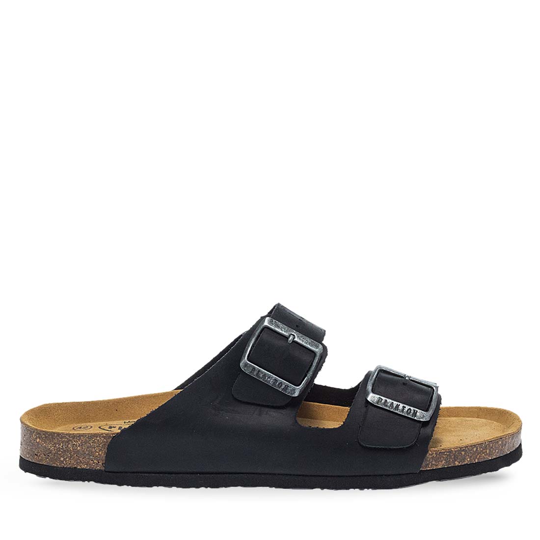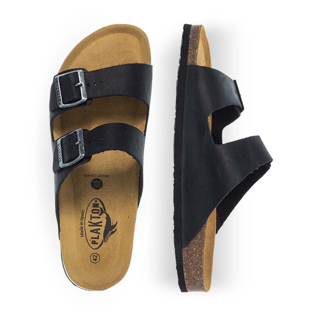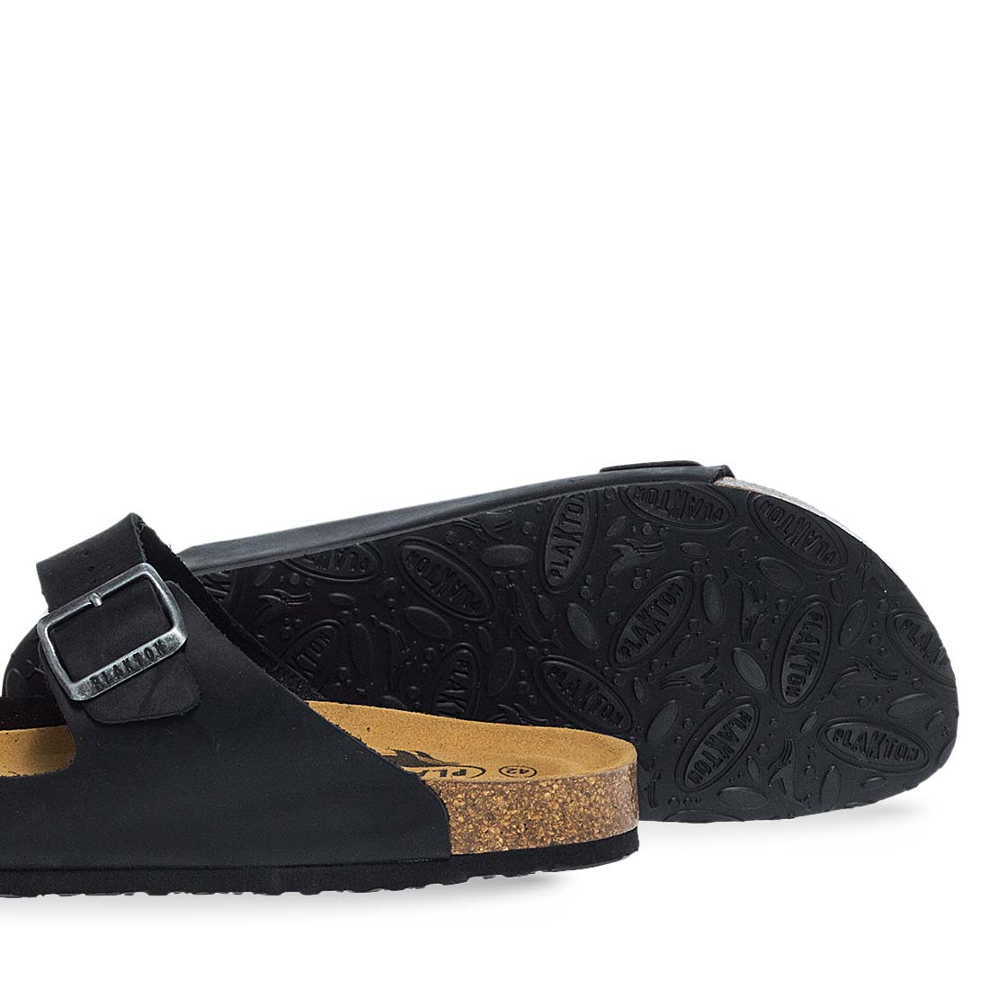 Δερμάτινα, ανατομικά ανδρικά σανδάλια Plakton σε μαύρο χρώμα και σόλα από φυσικό φελλό και αφρό μνήμης. Απολαυστικά στο περπάτημα για κάθε καλοκαιρινή σου βόλτα.