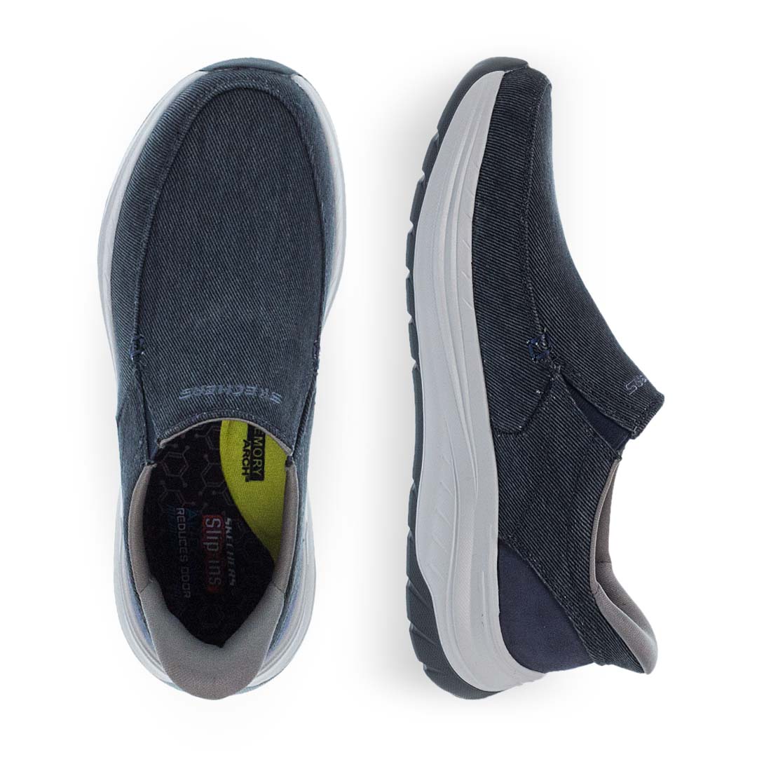 Ανδρικά slip on παπούτσια σε τζιν χρώμα από τη νέα συλλογή Skechers. Διαθέτουν εξαιρετικά ανθεκτική και εύκαμπτη σόλα. Μαλακός ανατομικός πάτος memory foam. Slip on που ξεχωρίζουν σε κάθε σας εμφάνιση. Εύκολη εφαρμογή.