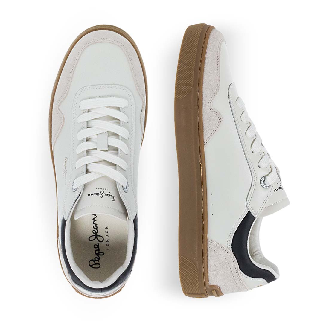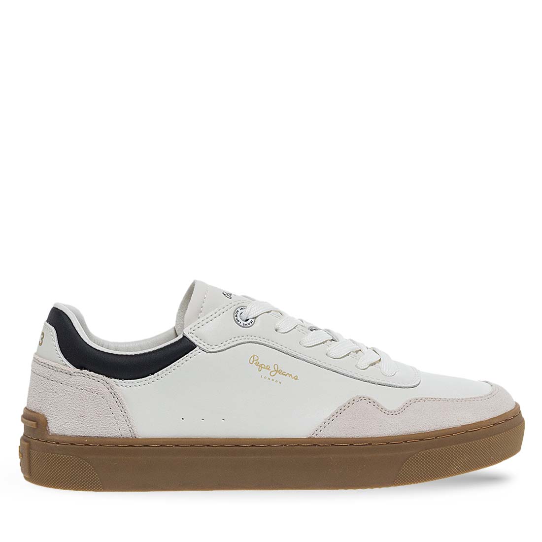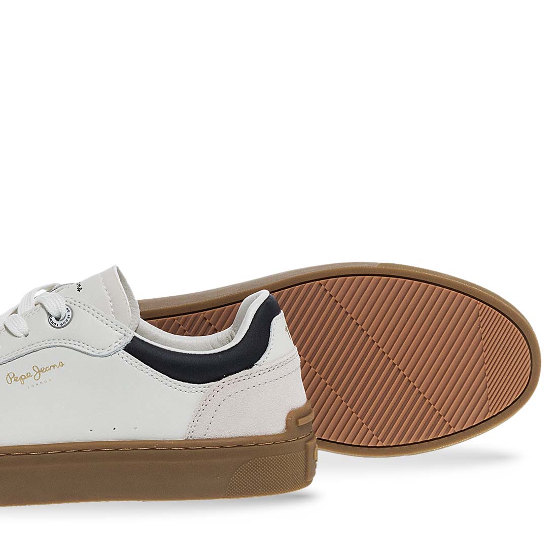 Ανδρικά δερμάτινα sneaker από το brand Pepe Jeans. Ανανεώστε το casual look σας με τα δερμάτινα sneakers της Pepe Jeans. Κατασκευασμένα από ποιοτικό λευκό δέρμα, διαθέτουν σουέτ λεπτομέρειες και σόλα σε καφέ απόχρωση για ξεχωριστό στυλ και άνεση στην καθημερινότητά σας.