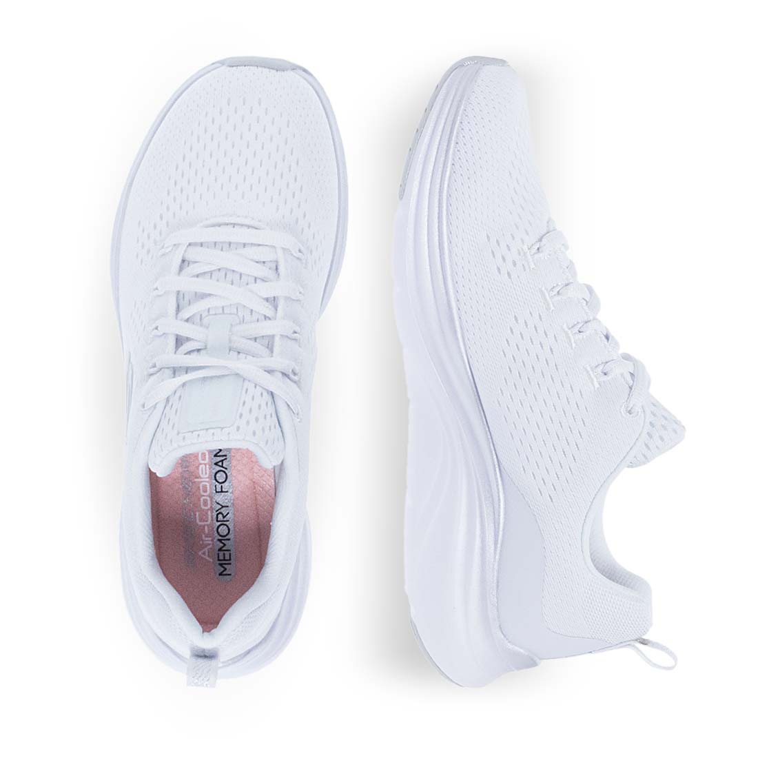 Λευκά αθλητικά παπούτσια της εταιρείας Skechers. Δένουν με κορδόνια. Είναι κατασκευασμένα από μαλακό mesh ύφασμα και εμφανές το λογότυπο στο πλάι. Διαθέτουν εσωτερικό πάτο με Memory Foam, ανάλαφρη ενδιάμεση σόλα που προστατεύει το πέλμα σας από κραδασμούς και εύκαμπτη εξωτερική σόλα για μεγάλη πρόσφυση. Ιδανικά να φορεθούν στη καθημερινότητά σας αλλά και στο γυμναστήριο.