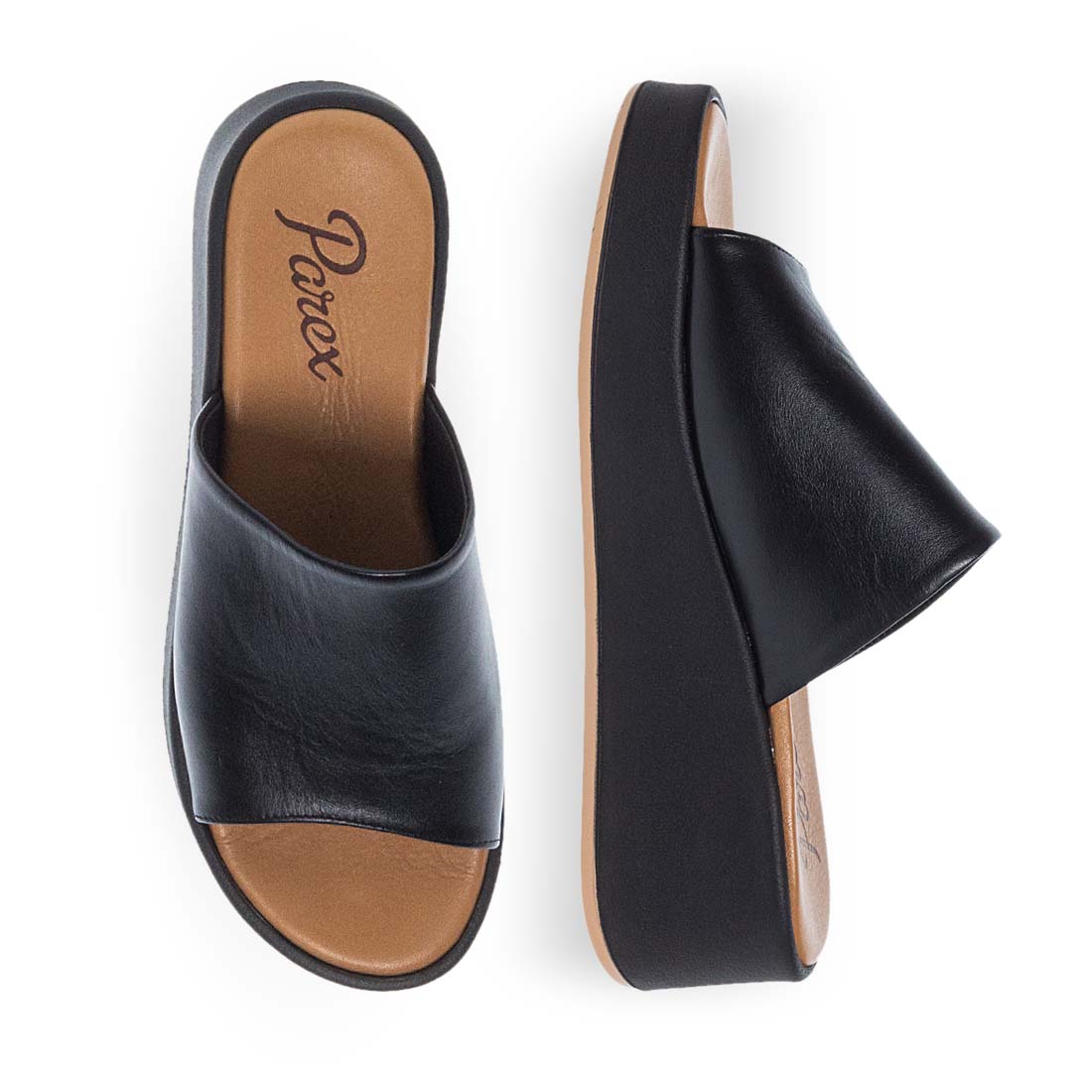 Γυναικεία δερμάτινα flatform Parex. Μοντέρνα μονόχρωμα flatforms από την εταιρεία Parex,ιδανικά για καθημερινή χρήση. Διαθέτουν φαρδιά φάσα στο πάνω μέρος και μαλακό δερμάτινο πέλμα. Είναι ανθεκτικά,σταθερή σόλα με μεσαίο ύψος τακούνι,κατάλληλο να φορεθούν σε κάθε στιγμή της ημέρας. Διαθέσιμα σε μαύρο και λευκό χρώμα.