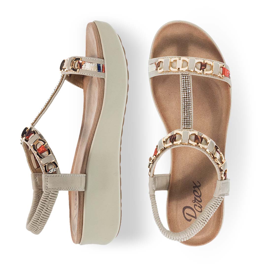 Γυναικεία μοντέρνα flatform από τη νέα συλλογή Parex. Eίναι διακοσμημένα με strass και χρυσή αλυσίδα στα λουράκια. Επώνυμα flatform με μεσαίο ύψος τακουνιού, πολύ ελαφρύ και ελαστικό λουράκι στο πίσω μέρος. Αναπαυτικό πάτημα για άνετα βήματα όλη την ημέρα. Τα συγκεκριμένα παπούτσια θα κλέψουν τις εντυπώσεις σε κάθε σας κίνηση.