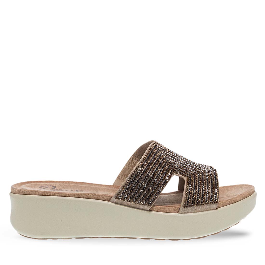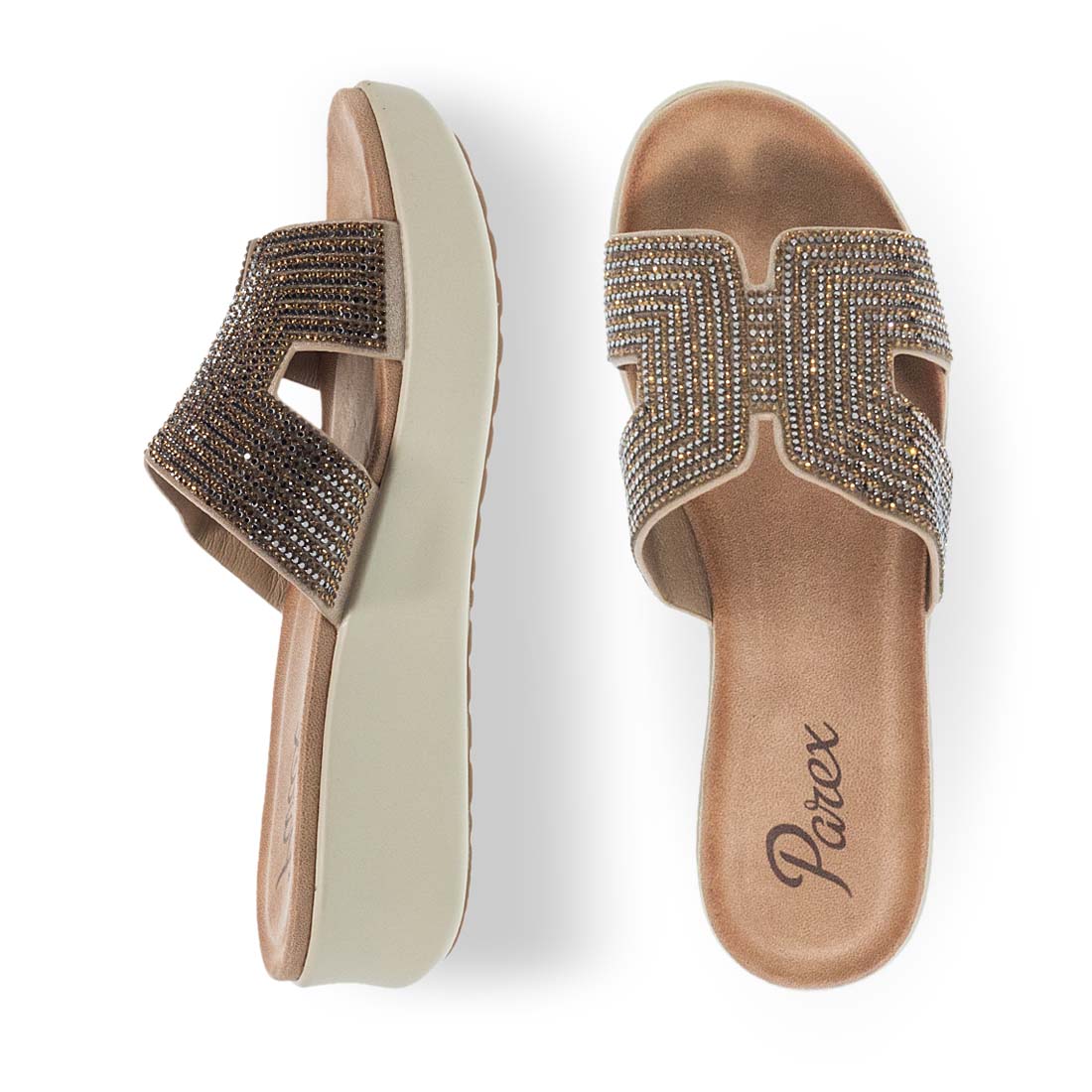 Γυναικεία flatfrom Parex για άνετες και κομψές εμφανίσεις. Διαθέτουν εντυπωσιακή φαρδιά φάσα διακοσμημένη με στρας. Τα συγκεκριμένα flatform διαθέτουν μαλακό εσωτερικό πάτο. Ακόμα μια άνετη επιλογή για κάθε περίσταση.