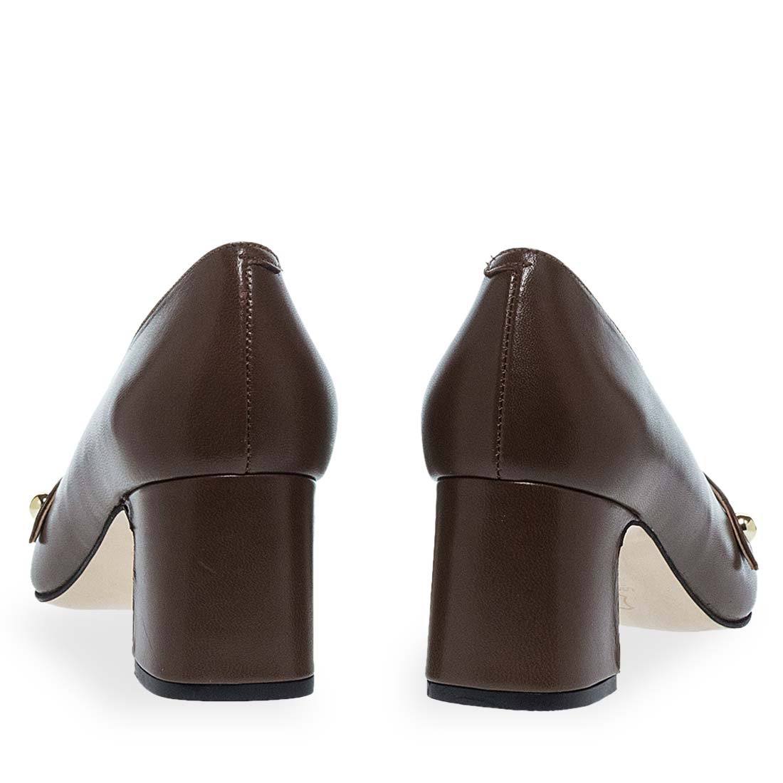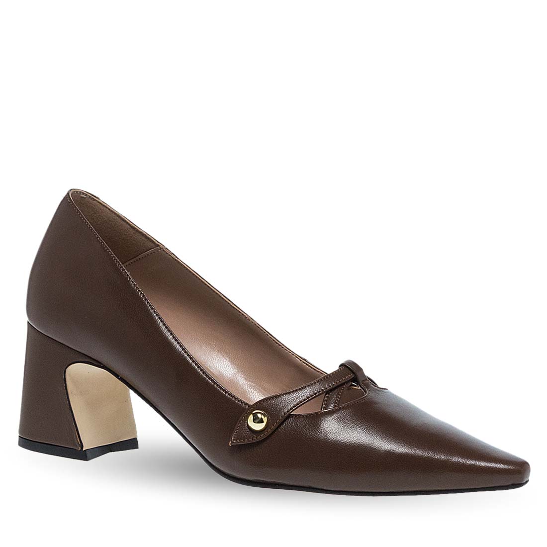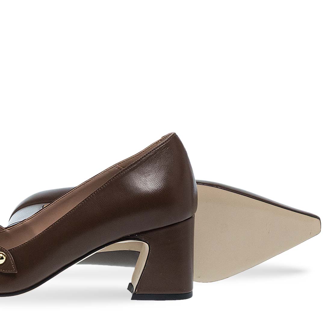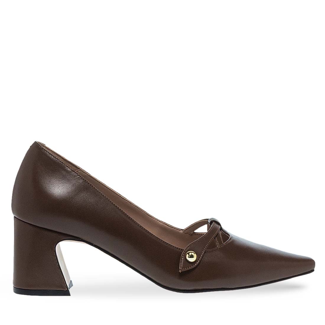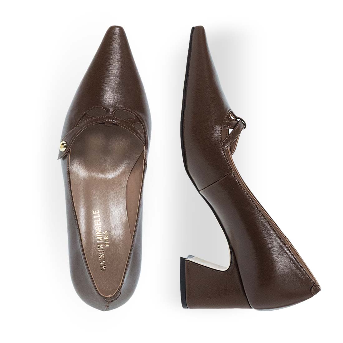Γυναικείες δερμάτινες γόβες από το brand Maison Minrelle. Γυναικείες γόβες σε καφέ και μαύρο χρώμα με λουράκι και μυτερή μύτη, κομψή και διαχρονική επιλογή.
