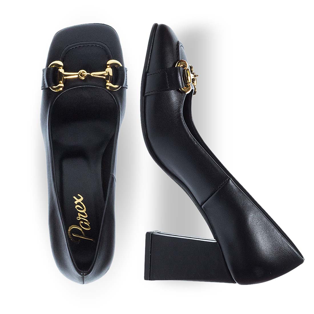 Γυναικείες γόβες Parex. Ξεχώρισε στο καθημερινό σου στιλ με αυτές τις γυναικείες γόβες με την υπογραφή της Parex. Διαθέτουν μεταλλική αγκράφα στο μπροστινό μέρος. Σχεδιασμένη σε θηλυκή γραμμή,διαθέσιμες σε μαύρο,ταμπά και κονιάκ χρώμα ώστε να επιλέξετε αυτό που ταιριάζει με την γκαρνταρόμπα σας. Δερμάτινο αναπαυτικό πάτημα και ψηλό block τακούνι. Συνδίασε αυτές τις γυναικείες γόβες Parex με midi φούστα ή crop παντελόνια για τις πιο εντυπωσιακές office εμφανίσεις.