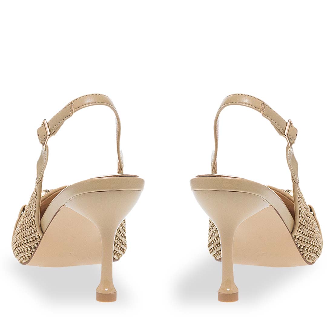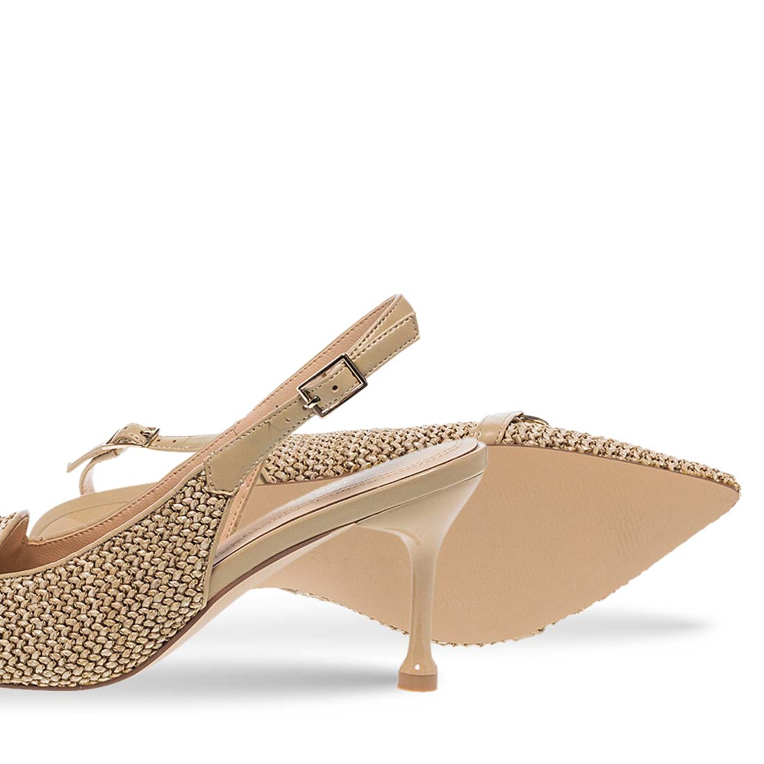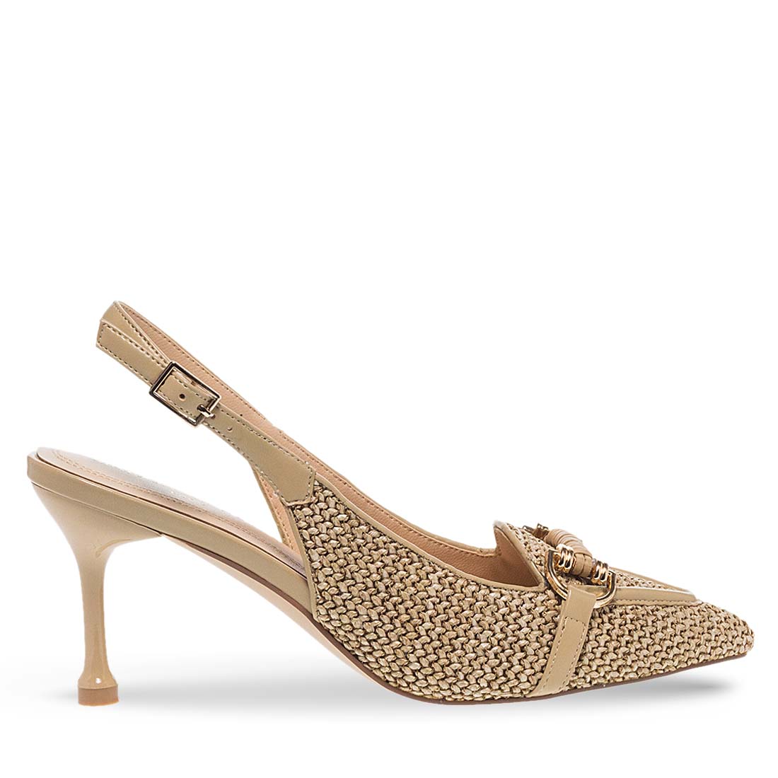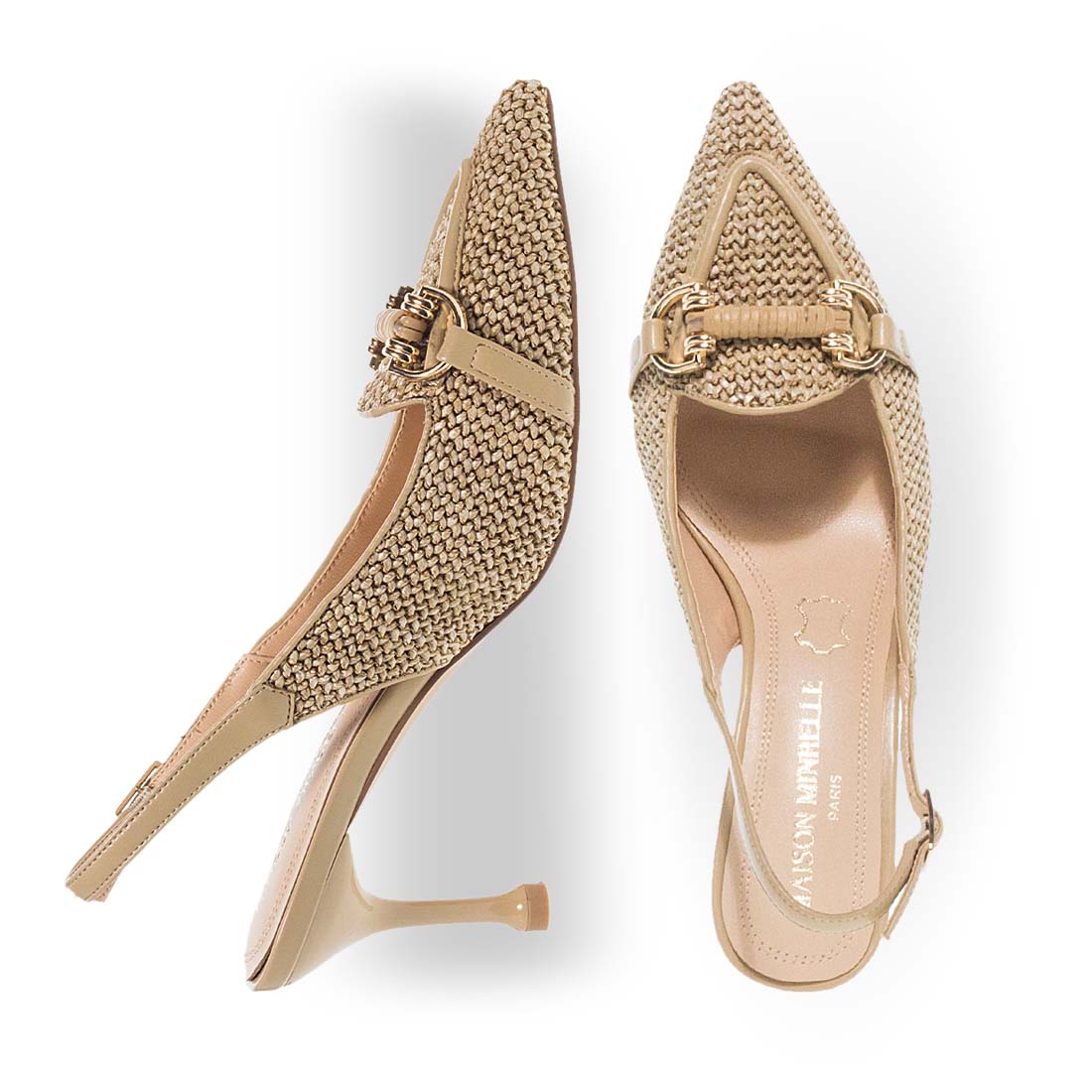 Εντυπωσιακές slingback γόβες της εταιρείας Maison Minrelle, είναι κατασκευασμένες εξωτερικά από ψάθα. Μυτερές γόβες με ρυθμιζόμενο λουράκι χαμηλά στον αστράγαλο και χρυσή λεπτομέρεια στο επάνω μέρος. Μία ιδανική επιλογή για να αναβαθμίσετε το office look σας και για να λάμψετε στη βραδινή σας έξοδο.