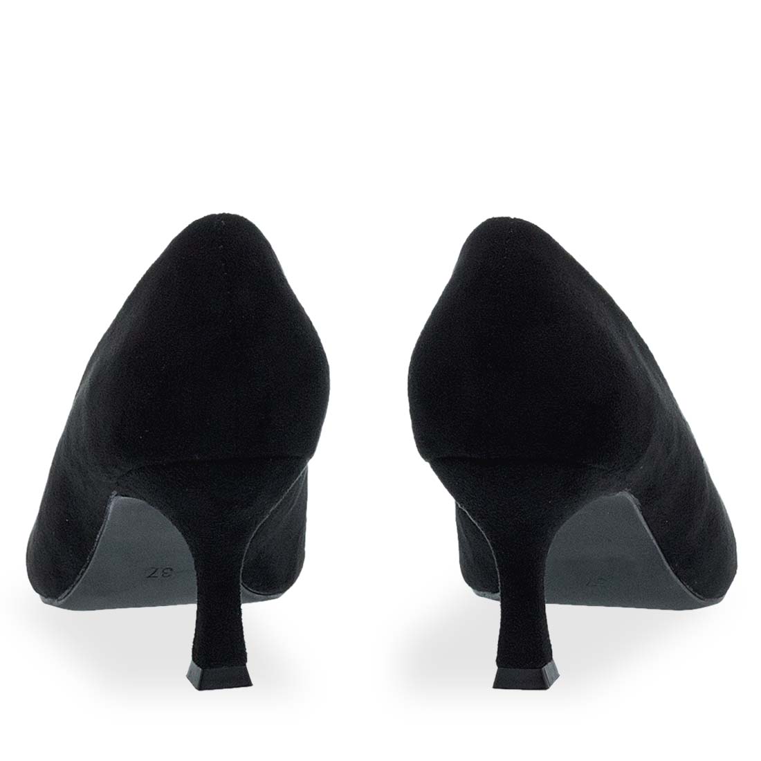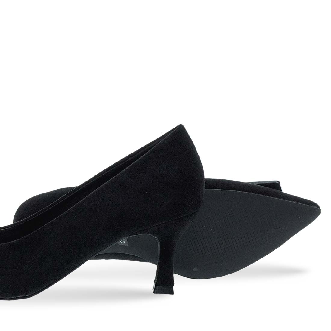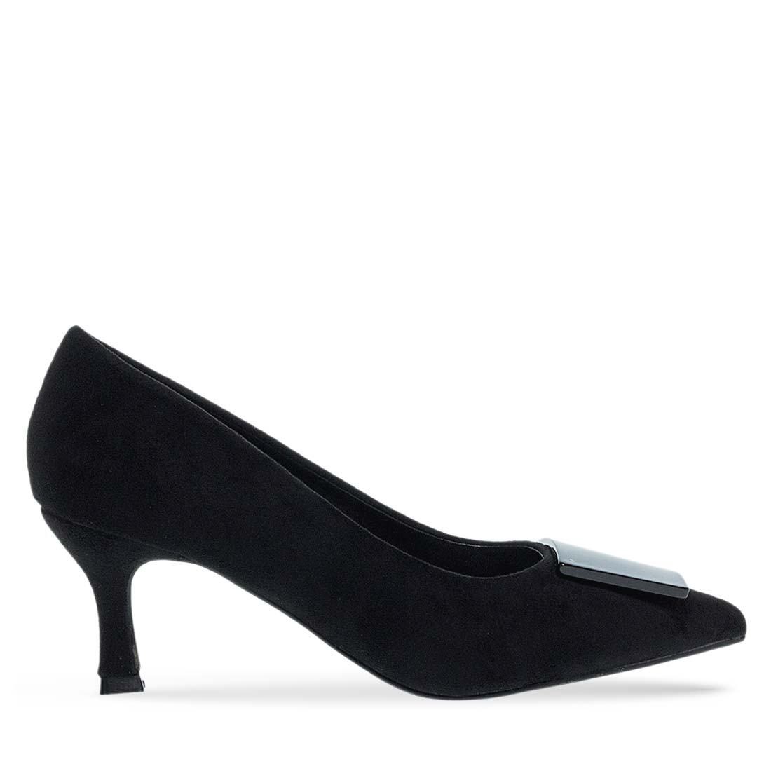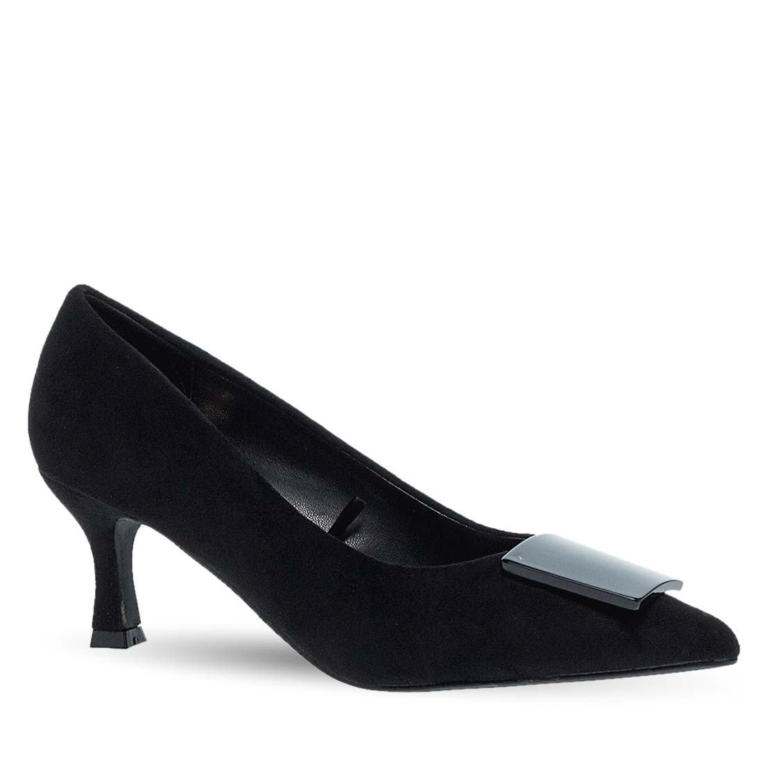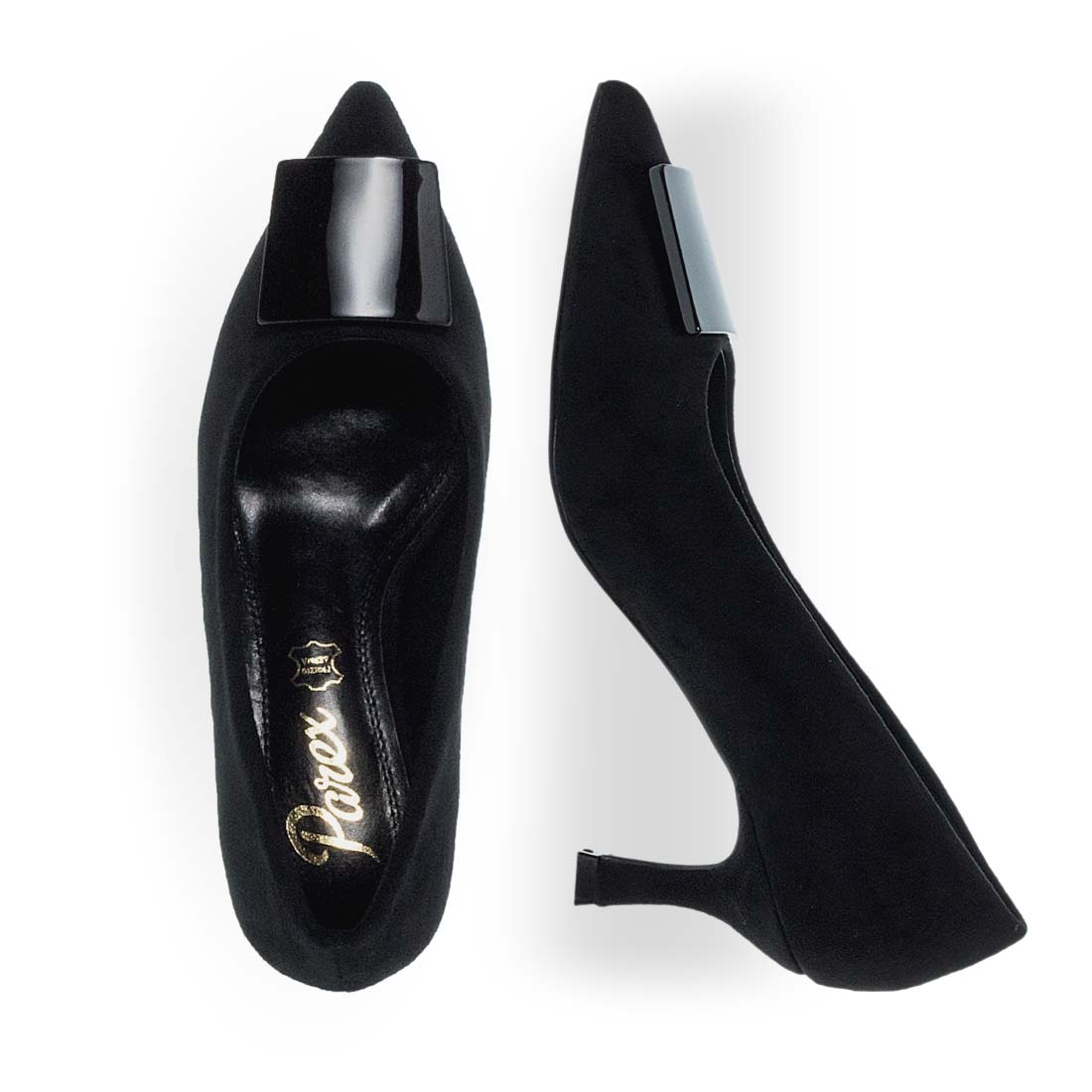 Γυναικείες γόβες Parex. Μαύρες γόβες Parex με μεταλλική αγκράφα και μυτερή μύτη. Δερμάτινη εσωτερική επένδυση και λεπτό τακούνι για διαχρονική κομψότητα.