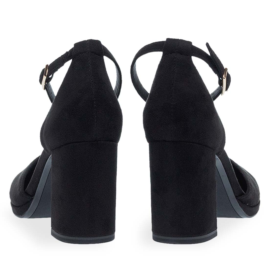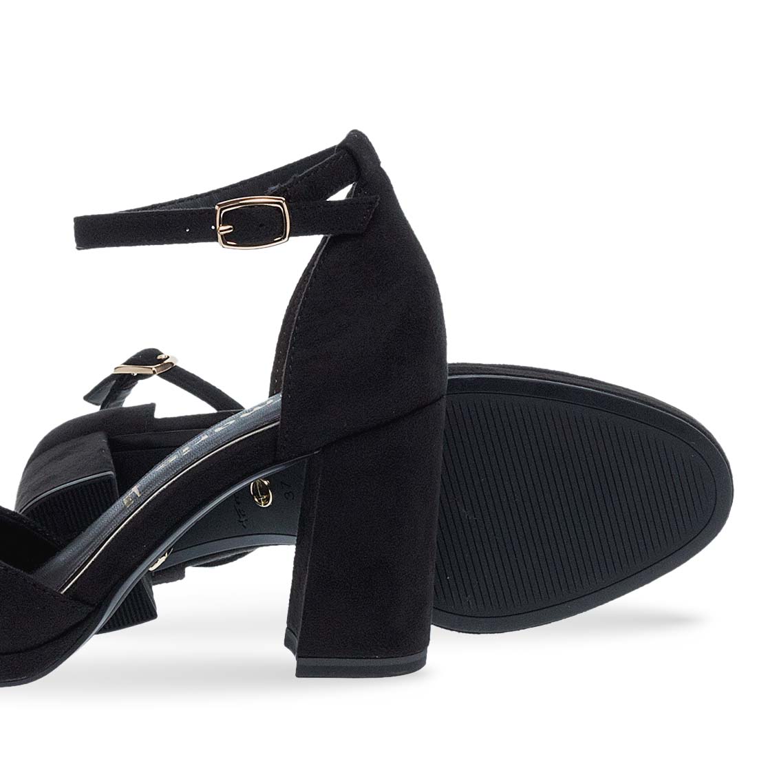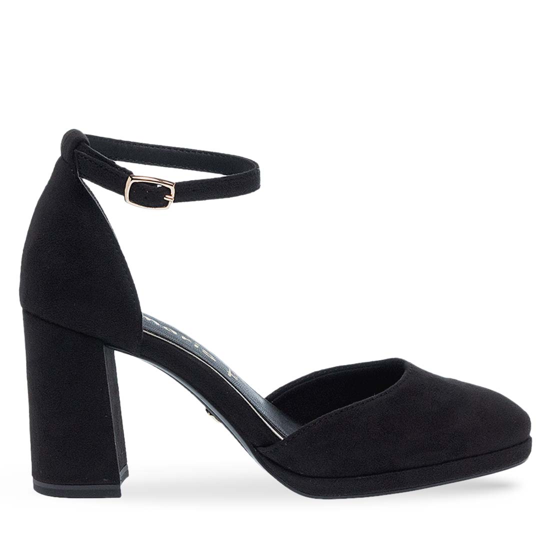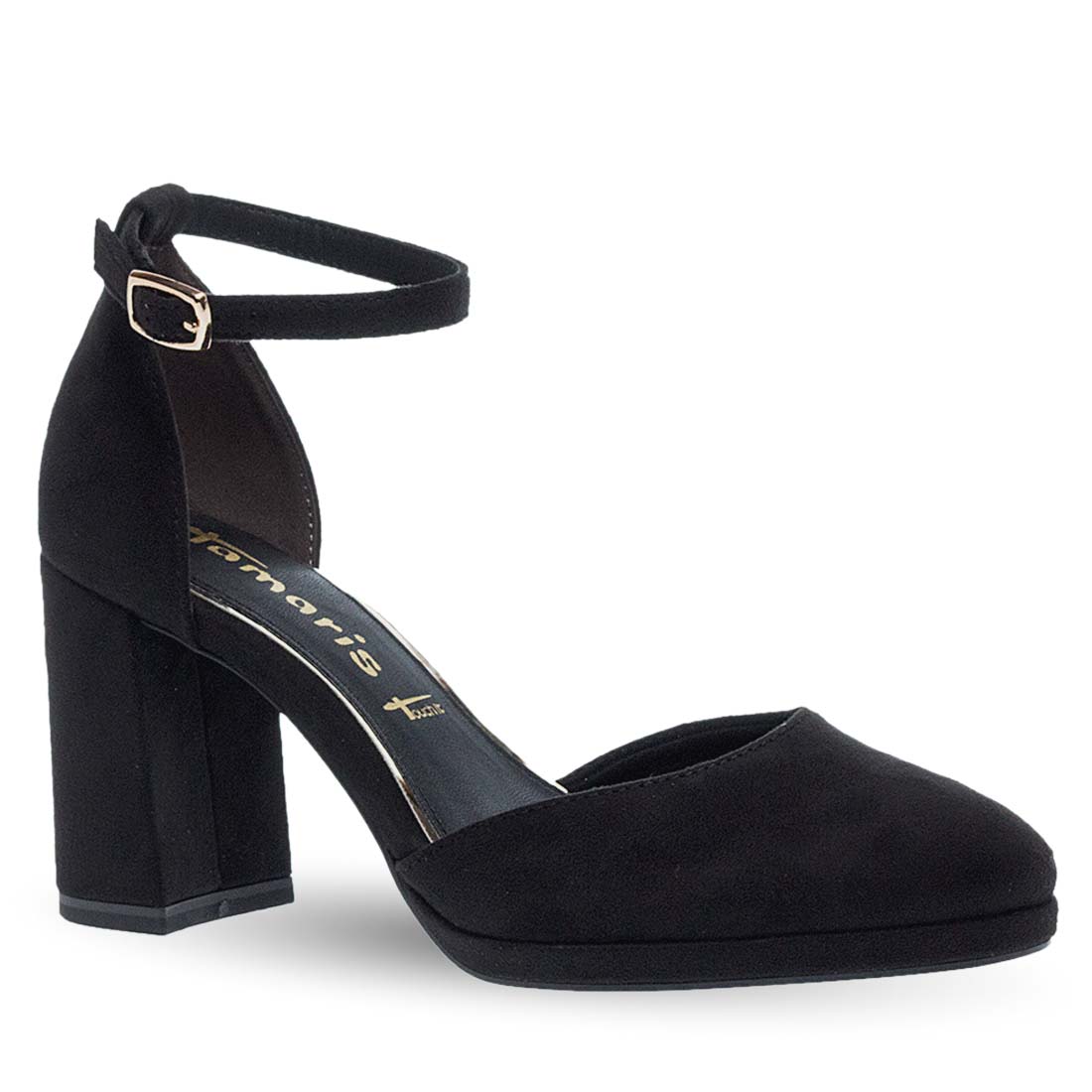 Γυναικείες γόβες από το brand Tamaris. Μαύρη γυναικεία γόβα με λουράκι στον αστράγαλο και χοντρό τακούνι, ιδανική για κομψές εμφανίσεις. Η γόβα αυτή συνδυάζει στυλ και άνεση, κατάλληλη για κάθε περίσταση.