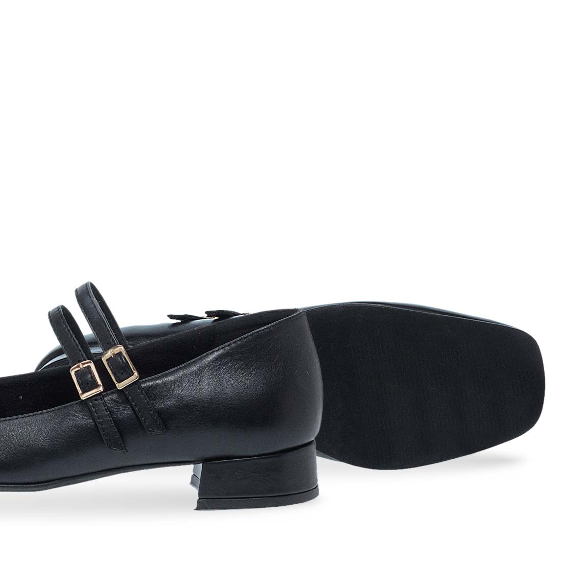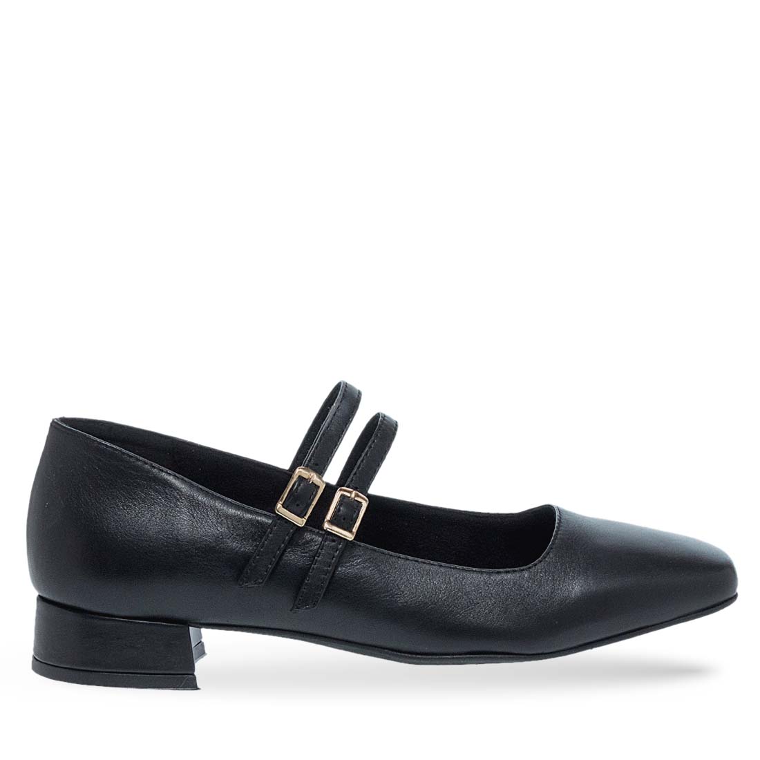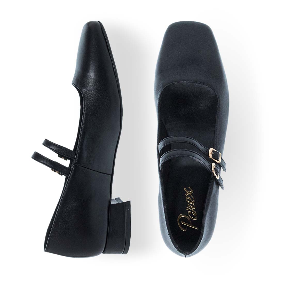 Γυναικεία δερμάτινα mary jane παπούτσια Parex. Μαύρα γυναικεία δερμάτινα Parex με διπλό λουράκι και χρυσές αγκράφες. Κομψό design με χαμηλό τετράγωνο τακούνι για στυλ και άνεση.