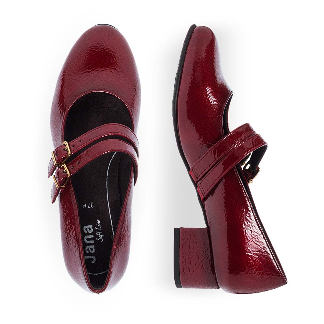 Γυναικεία Mary Jane παπούτσια από το brand Jana Softline. Γυναικεία παπούτσια σε στυλ Mary Jane από κόκκινο λουστρίνι με διπλό λουράκι και μικρό τακούνι. Κομψά και άνετα για καθημερινές και βραδινές εμφανίσεις.