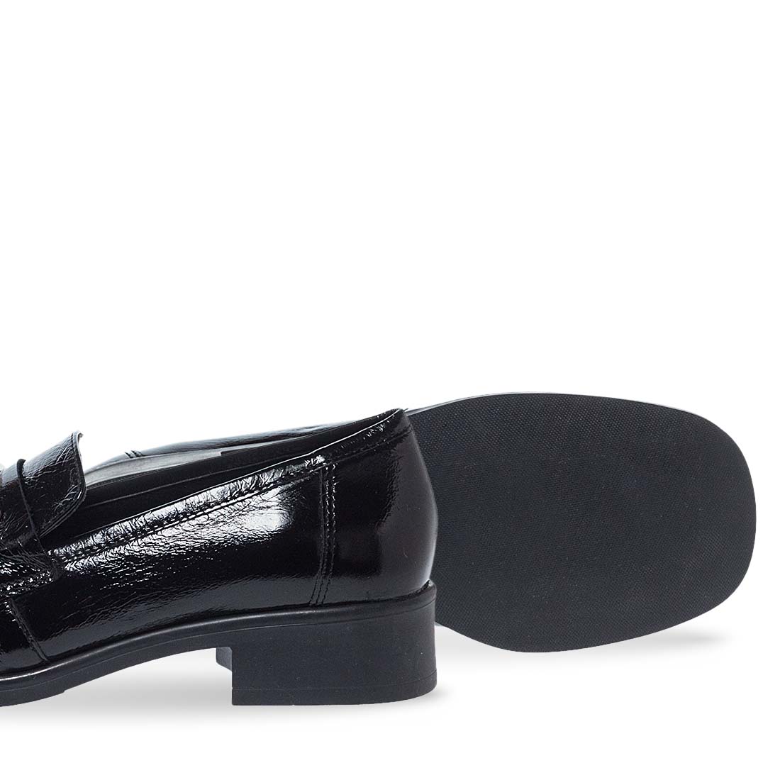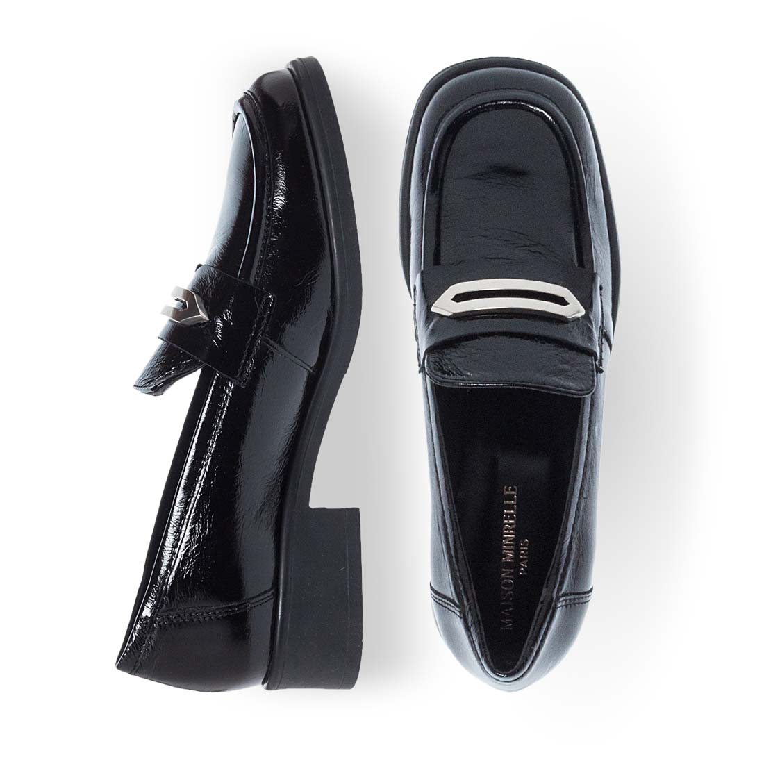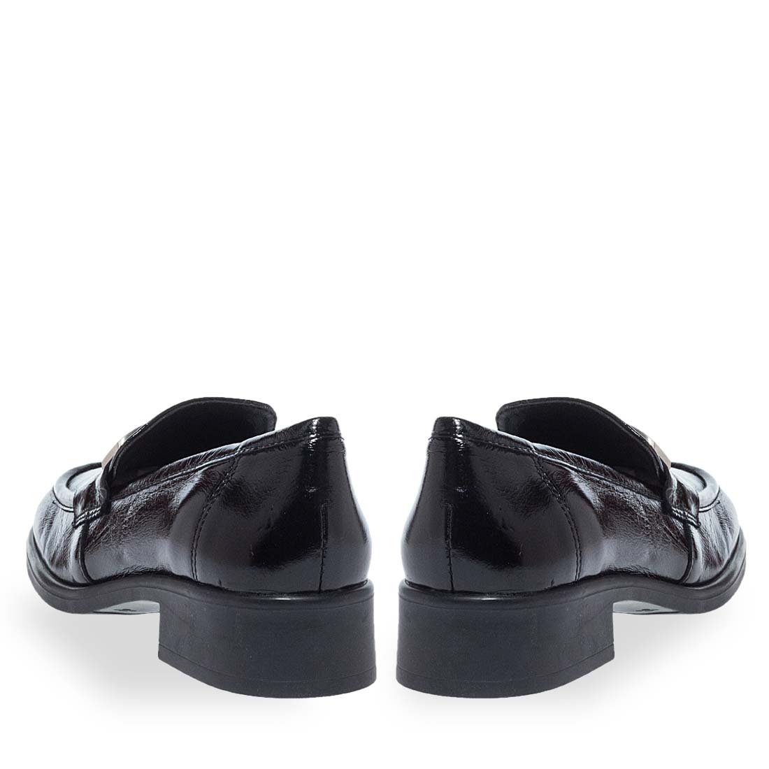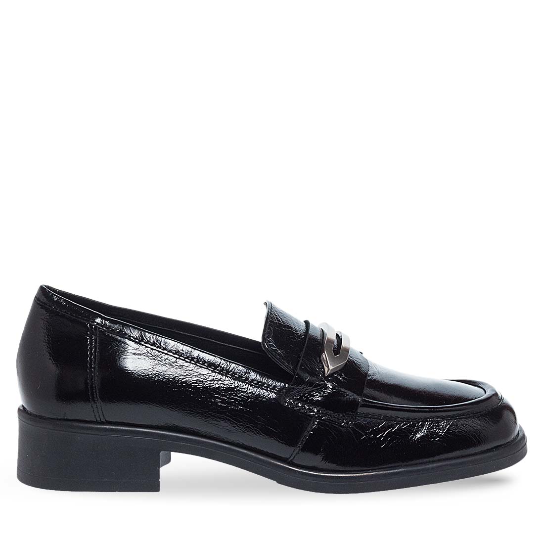 Πρόσθεστε λίγη λάμψη στο look σας με αυτά τα δερμάτινα λουστρίνι μοκασίνια με μεταλλική αγκράφα στο πάνω μέρος. Είναι διαθέσιμα σε μαύρο χρώμα και έχουν χαμηλό σταθερό τακούνι. Ιδανικά για καθημερινό, χαλαρό look.