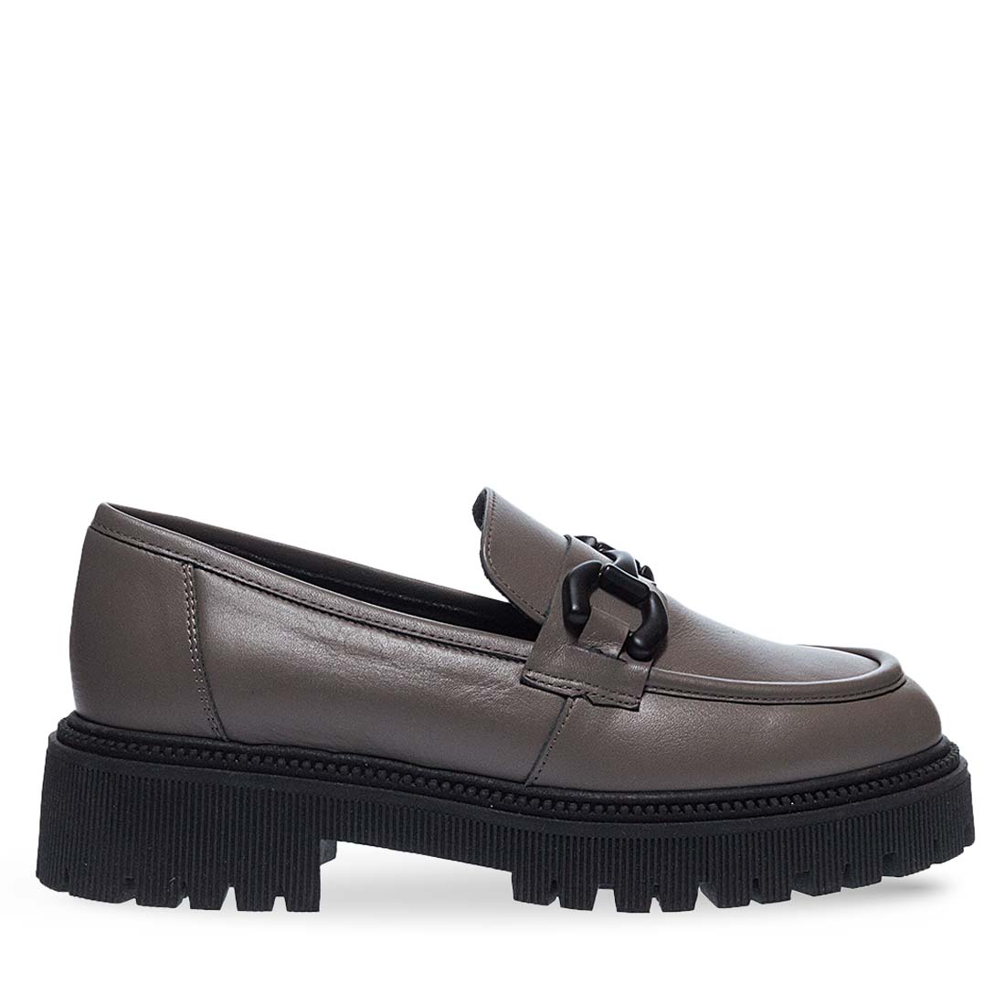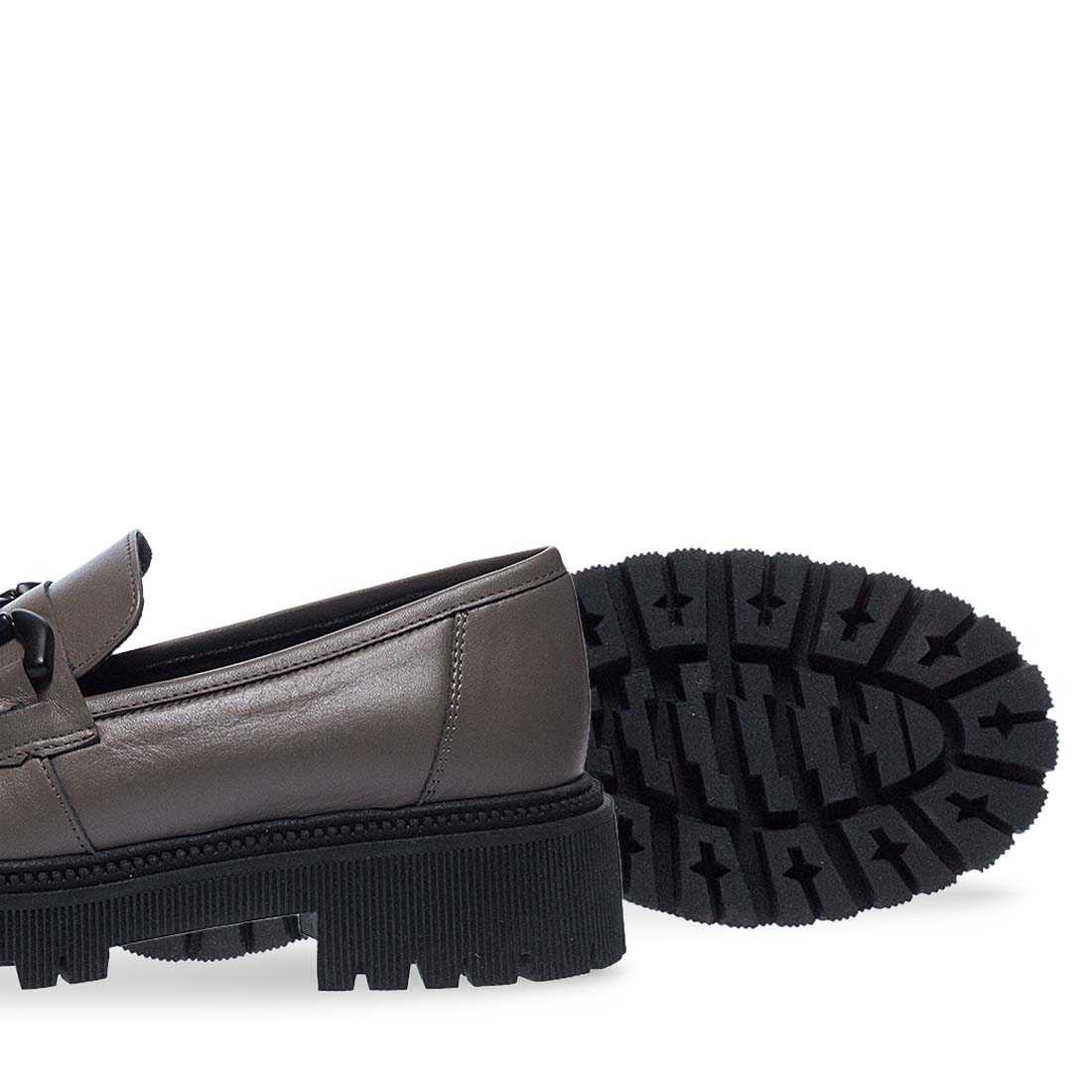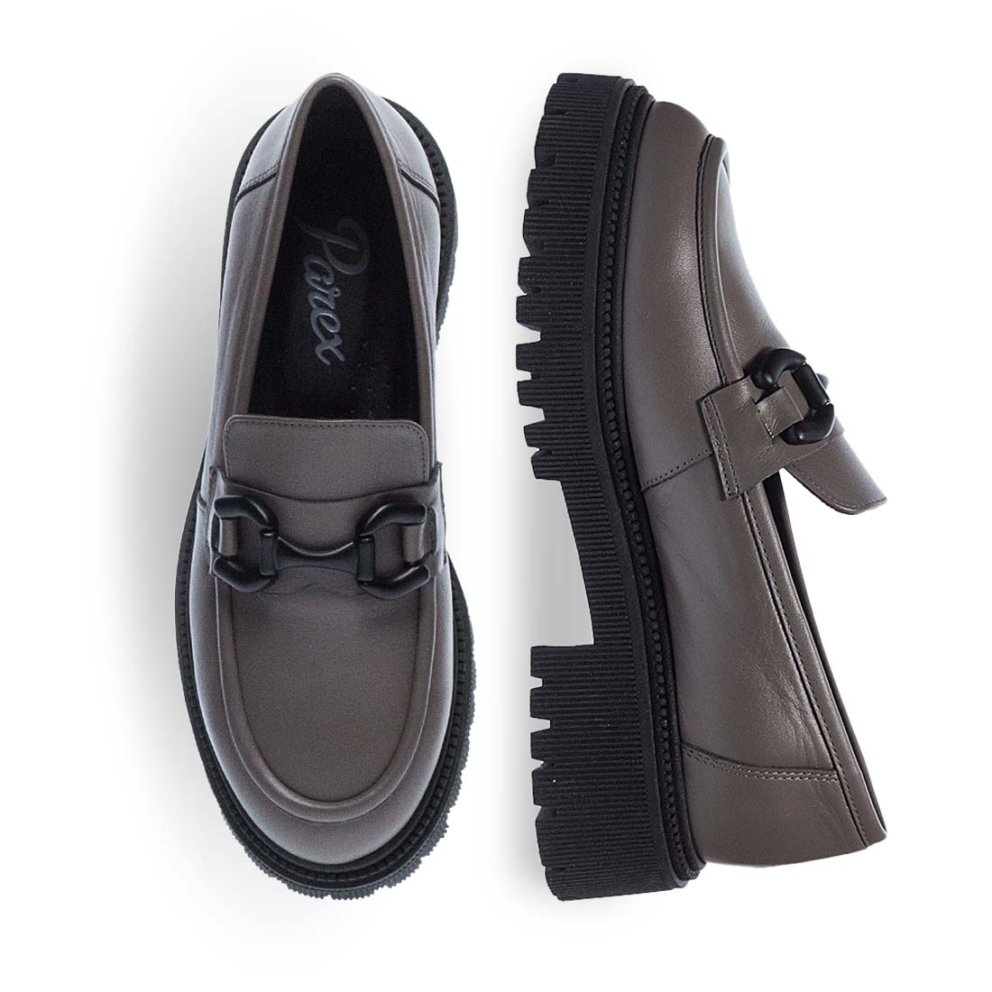 Γυναικεία δερμάτινα μοκασίνια Parex. Αυτά τα γυναικεία δερμάτινα μοκασίνια είναι το απόλυτο ανδρόγυνο σχέδιο που θα αναβαθμίσει το στιλ σου! Διαθέτουν μεταλλική αγκράφα στο πάνω μέρος,διαθέσιμα σε μαύρο και γκρι χρώμα. Μαλακό δερμάτινο πάτημα και αντιολισθητική μαύρη σόλα.