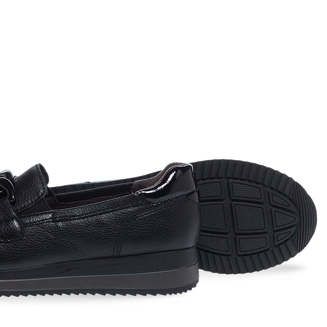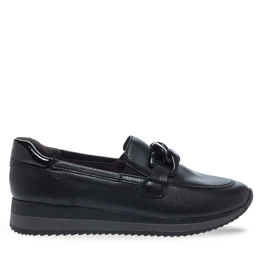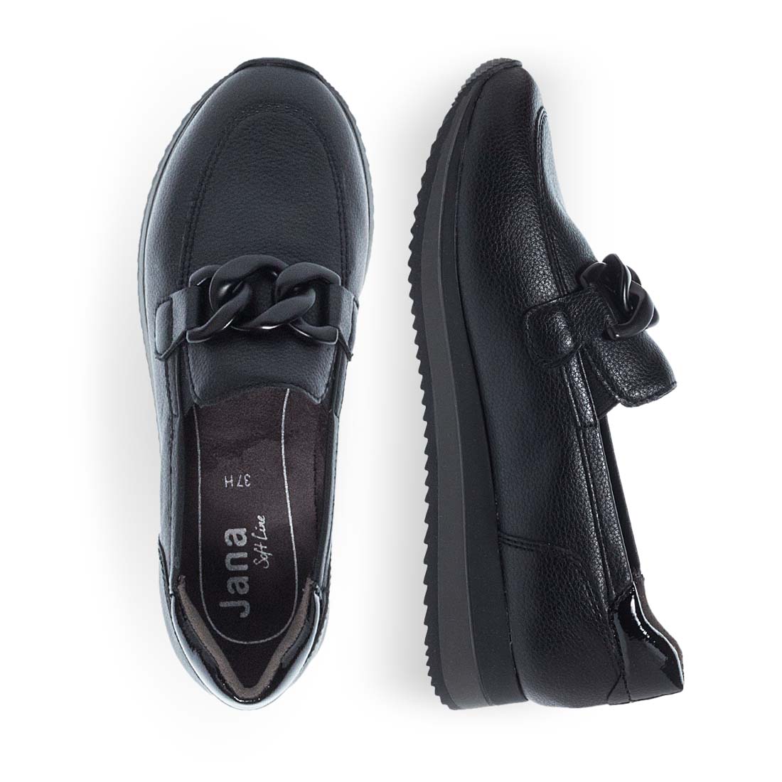 Γυναικεία μαύρα μοκασίνια από την νέα συλλογή της εταιρείας Jana Softline. Διαθέτουν διακοσμητική αλυσίδα στο επάνω μέρος και εξωτερικές ραφές. Επώνυμα, καθημερινά μοκασίνια που θα ανανεώσουν το χειμερινό σας outfit και θα σας χαρίσουν άνετα βήματα.