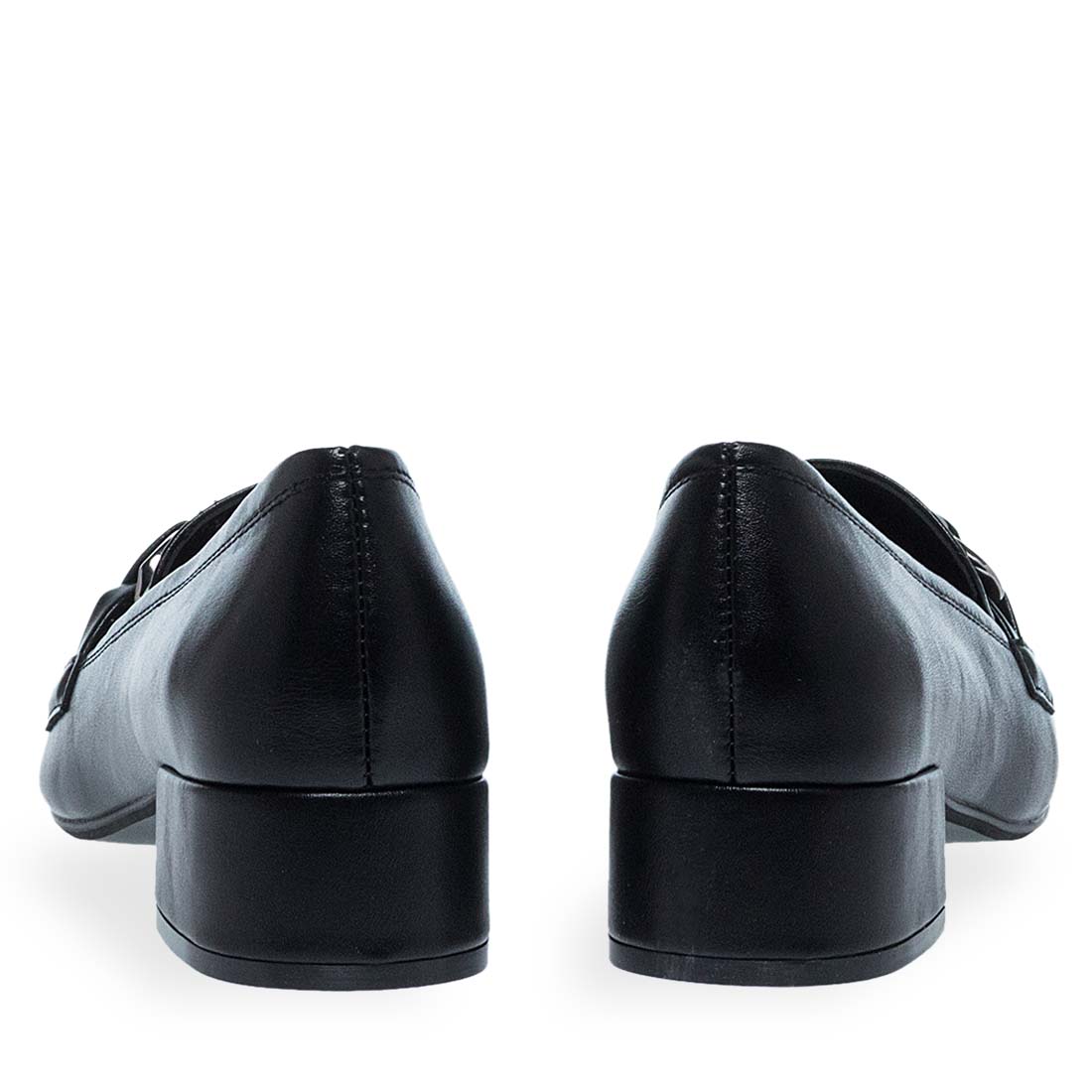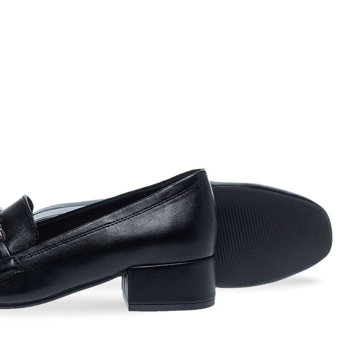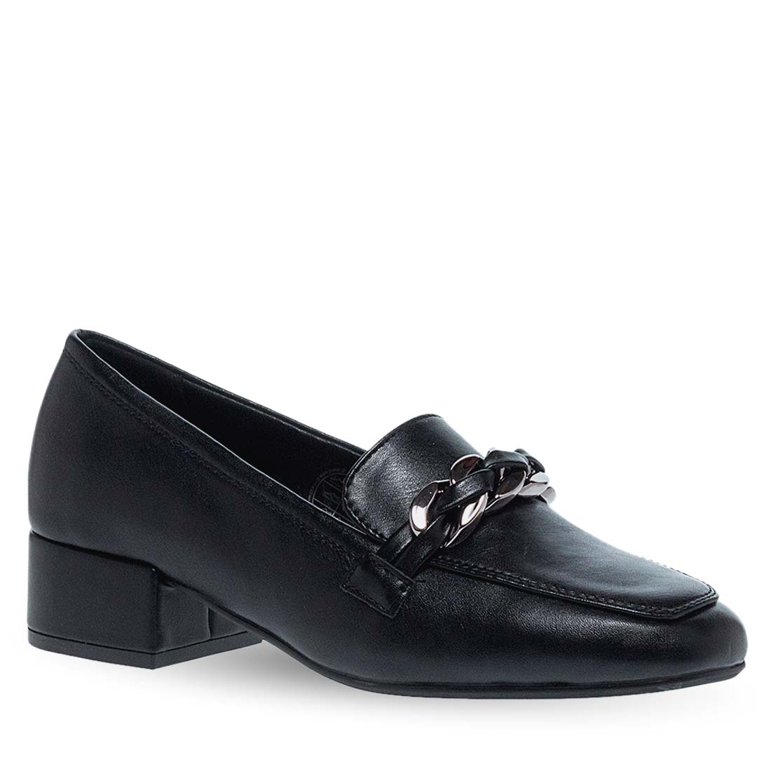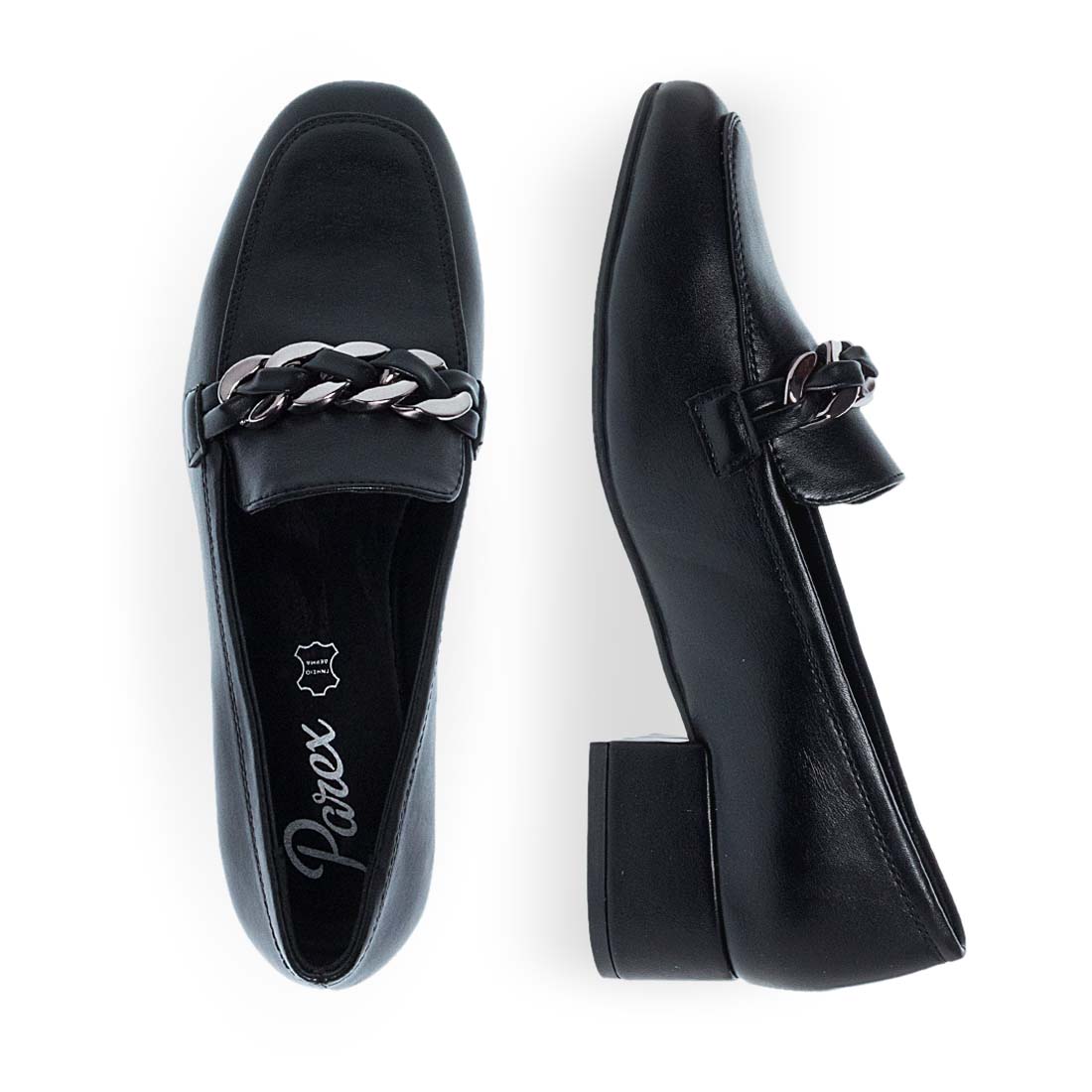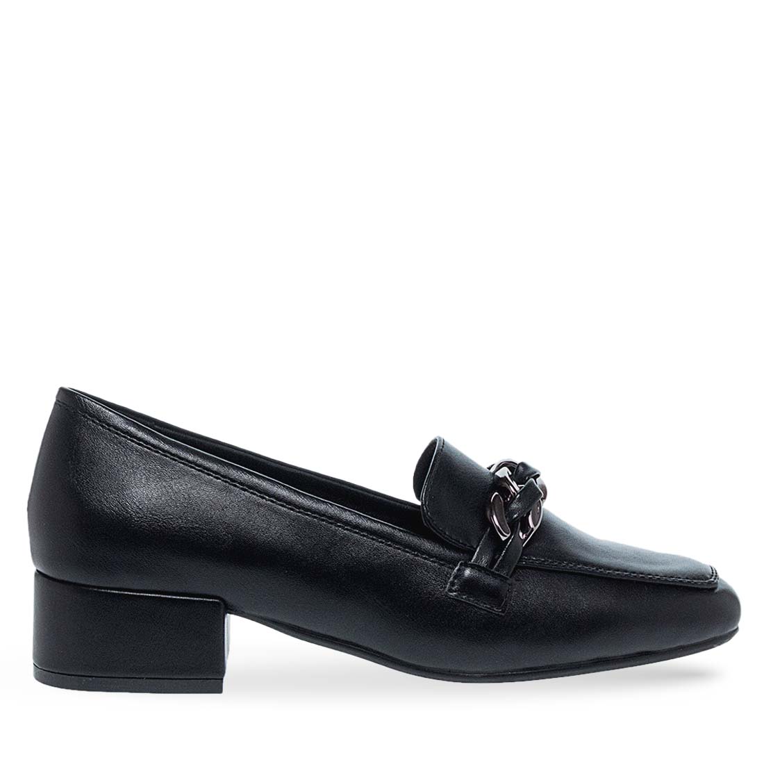 Γυναικεία μοκασίνια Parex. Γυναικεία μοκασίνια σε μαύρο χρώμα με διακοσμητική αλυσίδα και χαμηλό τακούνι για στυλ και άνεση.