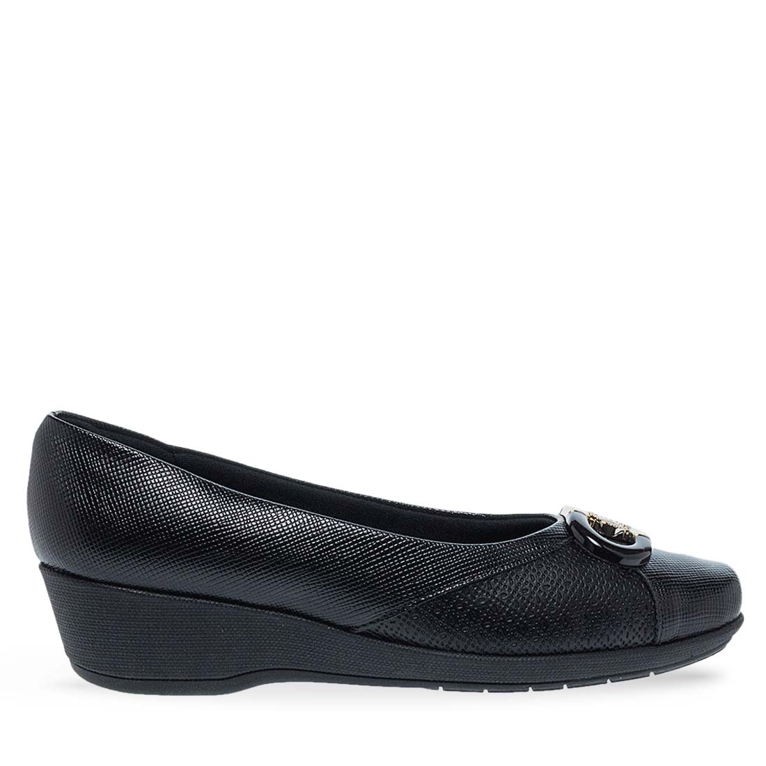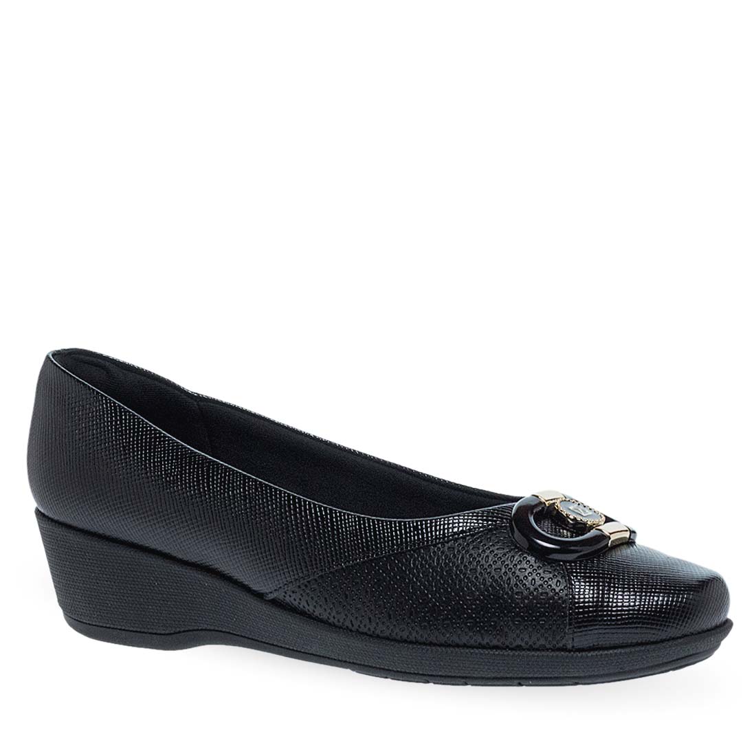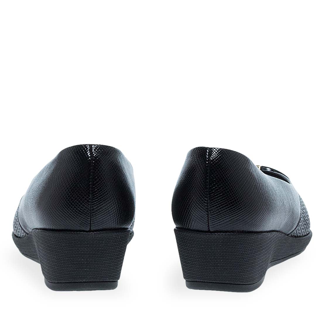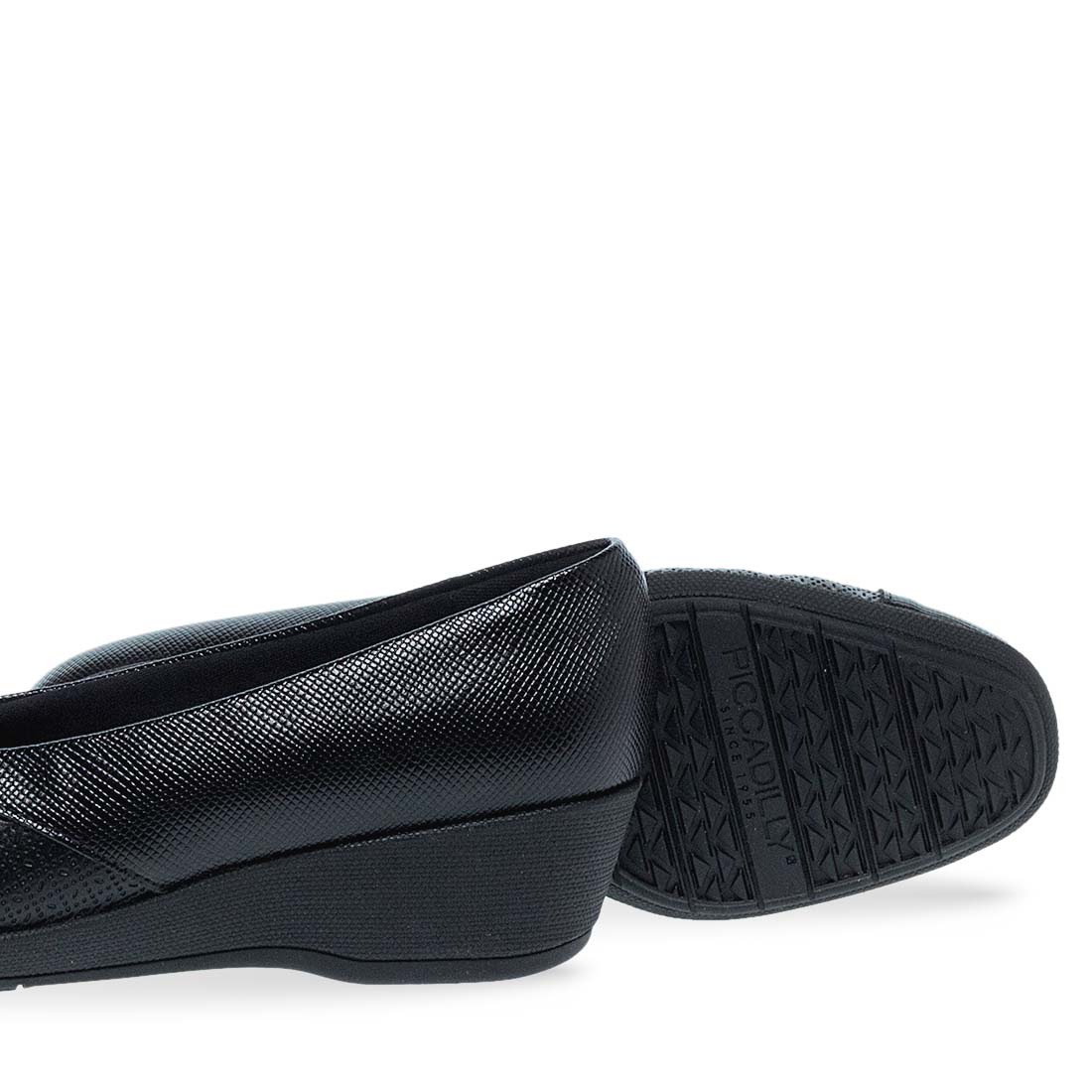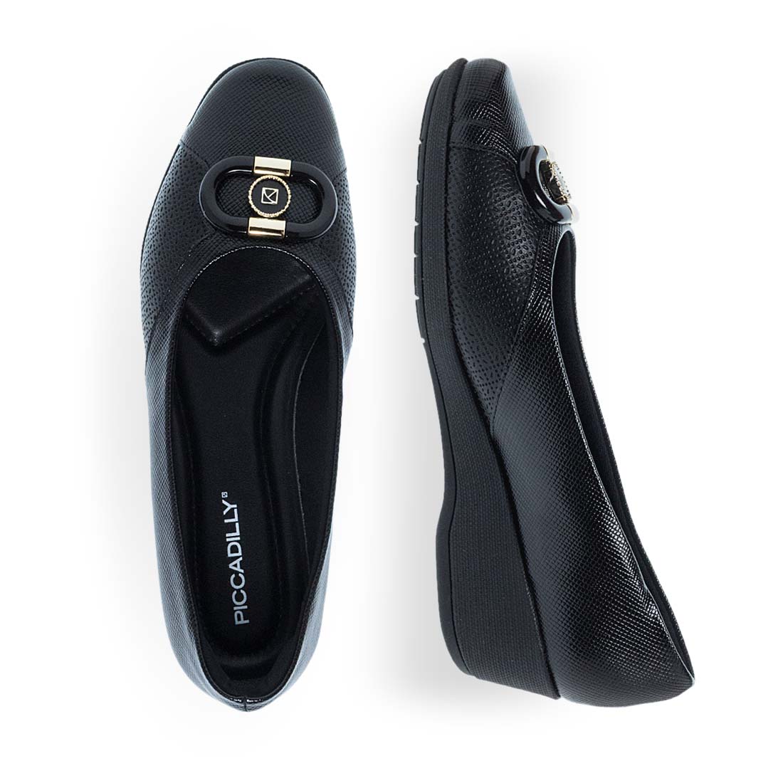 Γυναικεία μοκασίνια από το brand Piccadilly. Μαύρα μοκασίνια με διακριτική γυαλιστερή υφή και χρυσό διακοσμητικό, προσφέροντας κομψότητα και άνεση.