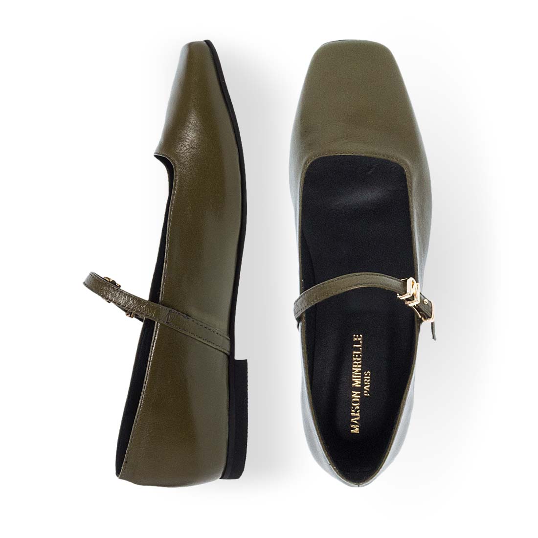 Γυναικείες δερμάτινες μπαλαρίνες από το brand Maison Minrelle. Γυναικείες δερμάτινες μπαλαρίνες σε μαύρο, μπλε, πούρο, μπορντώ και πράσινο χρώμα, με τετράγωνη μύτη και λουράκι για άνεση και μοντέρνο χαρακτήρα.