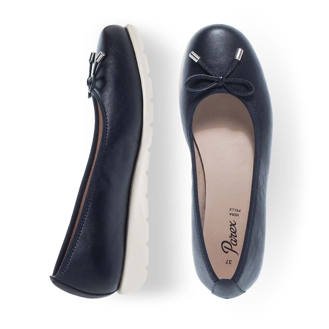 Γυναικείες δερμάτινες μπαλαρίνες Parex με υφασμάτινη εσωτερική επένδυση. Διαθέτουν λευκή λαστιχένια σόλα και διακοσμητικό φιογκάκι στο επάνω μέρος. Ανοιξιάτικες μπαλαρίνες που θα σας χαρίσουν άνεση και κομψότητα κάθε στιγμή της ημέρας.
