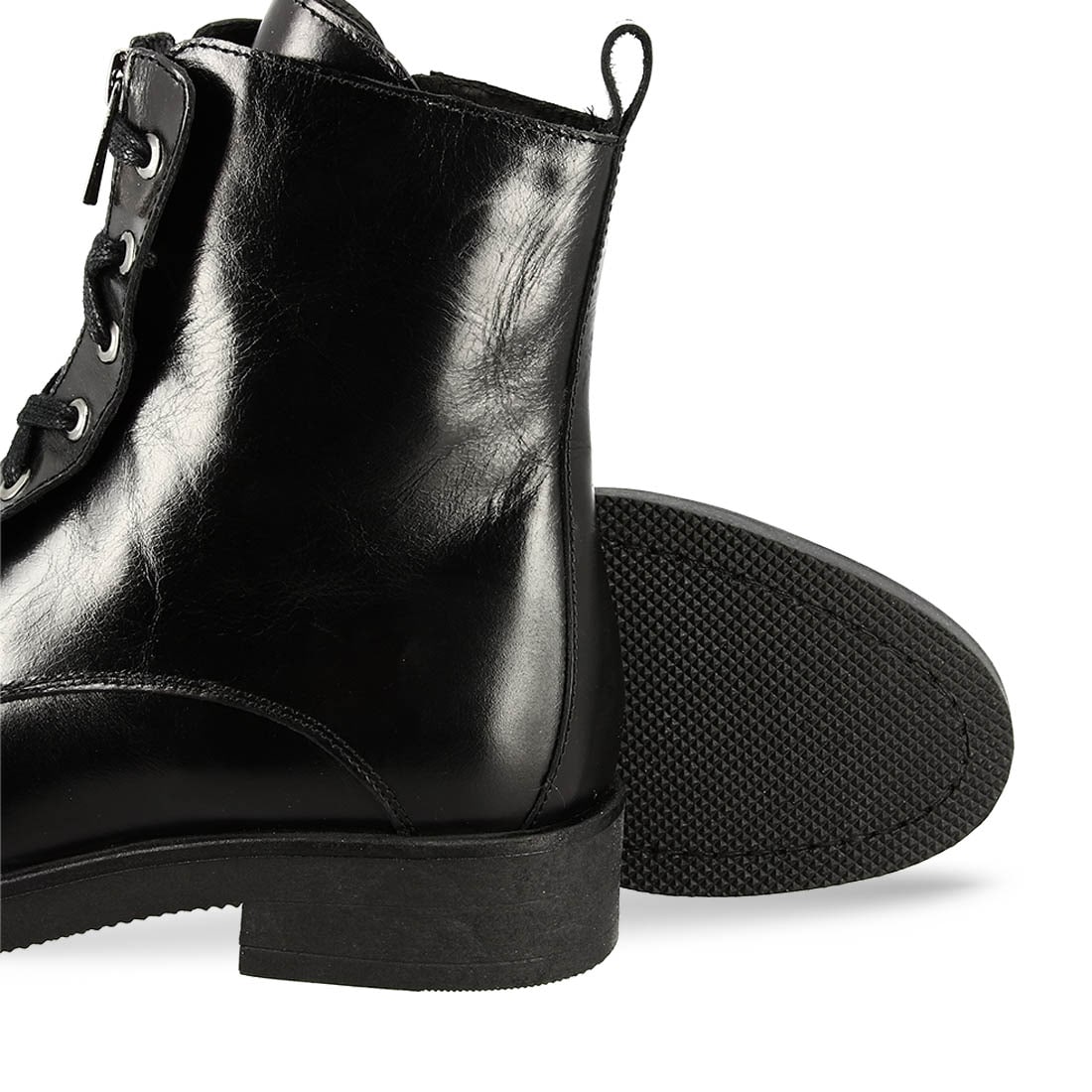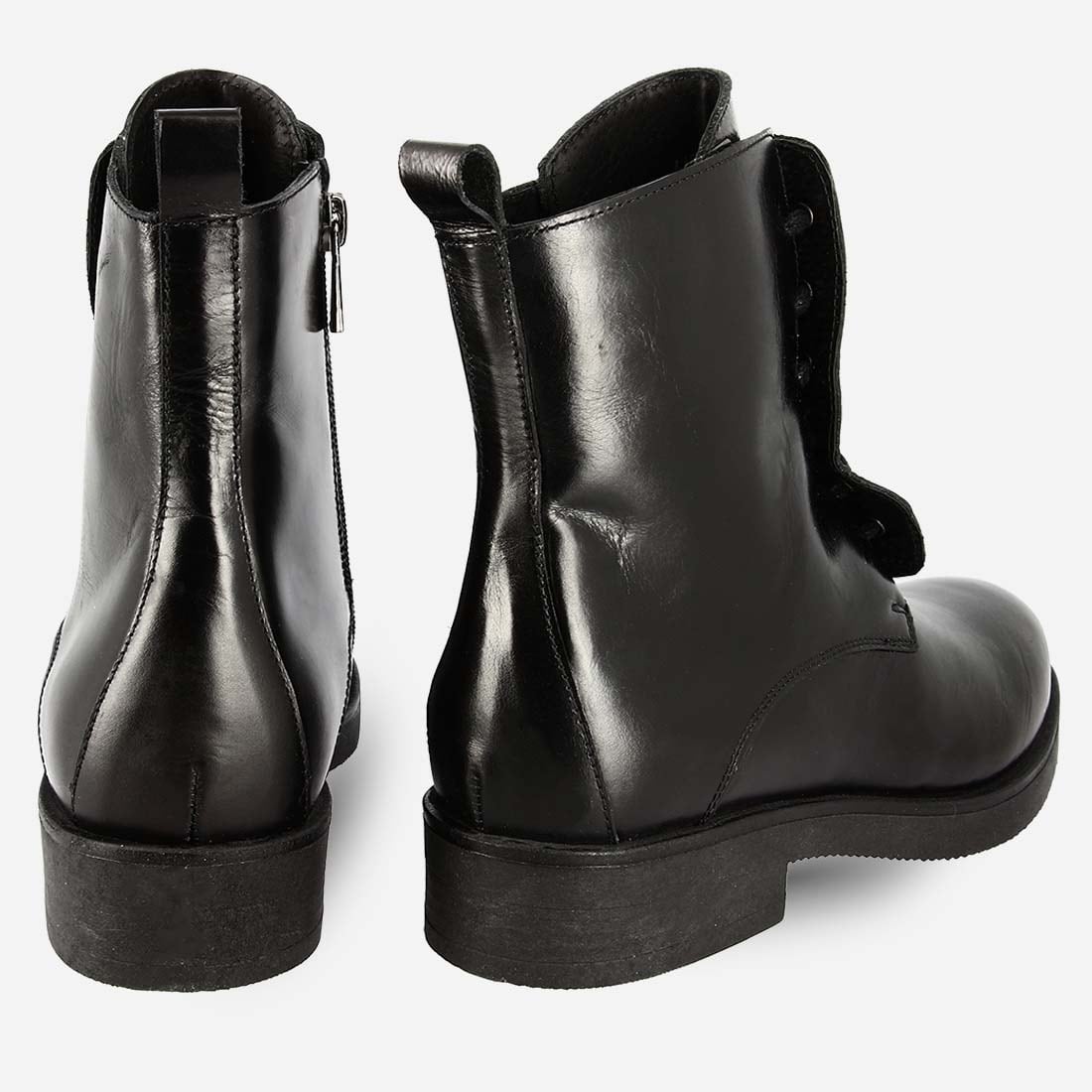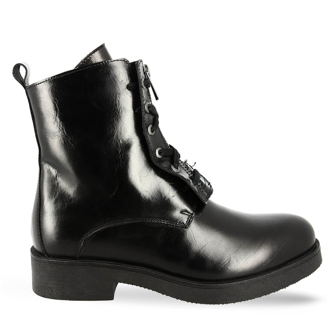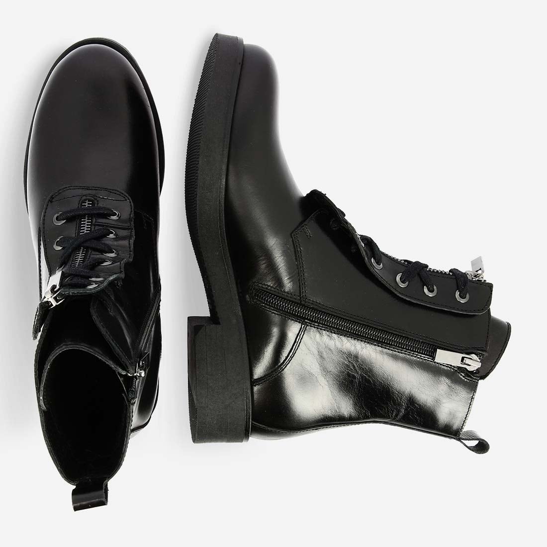 Γυναικεία biker δερμάτινα μποτάκια με διακοσμητικό φερμουάρ και κορδόνια μπροστά και πλαίνό φερμουάρ για εύκοκη εφαρμογή. Με χαμηλό τακούνι και αντιολισθητική σόλα.