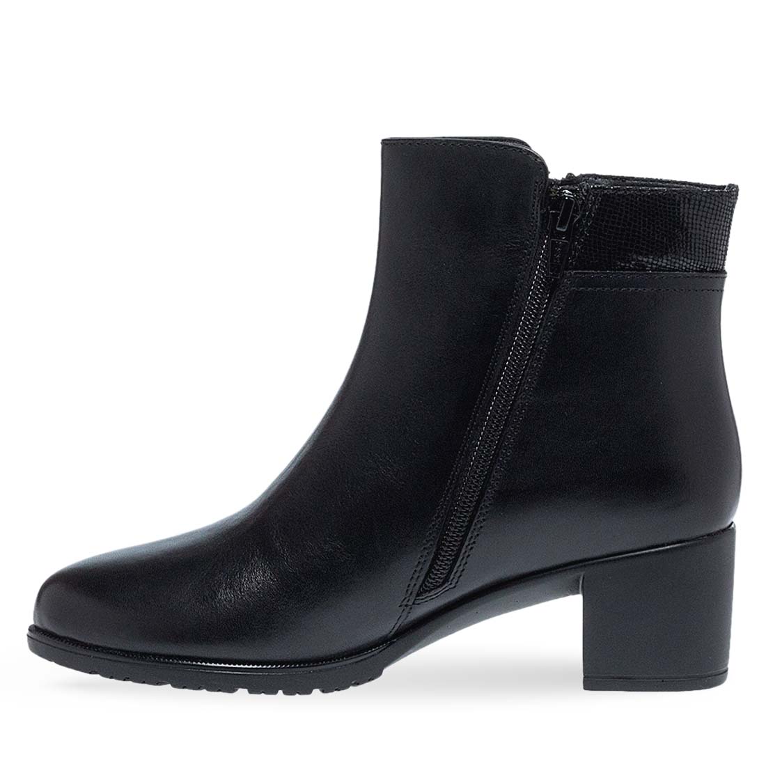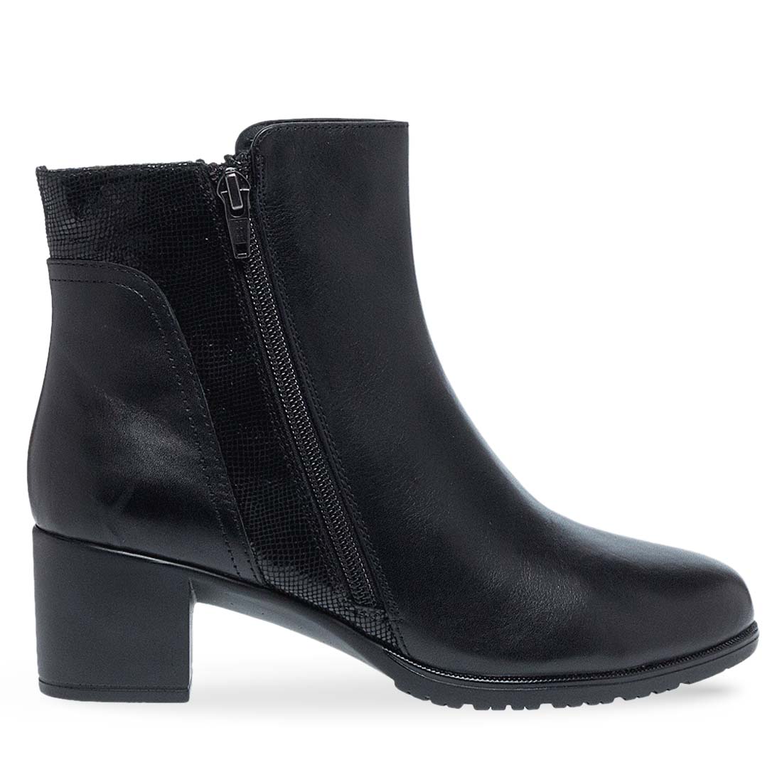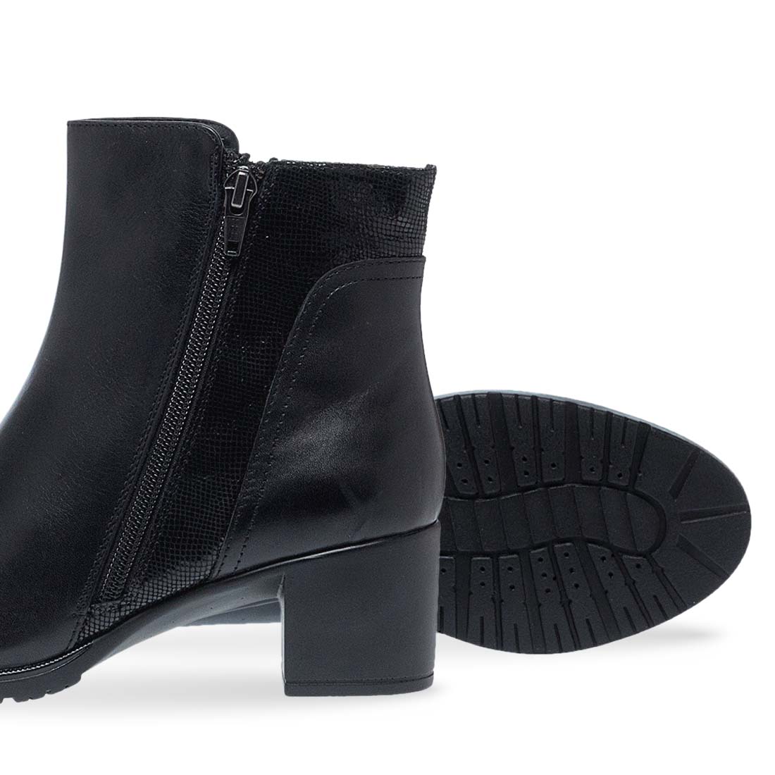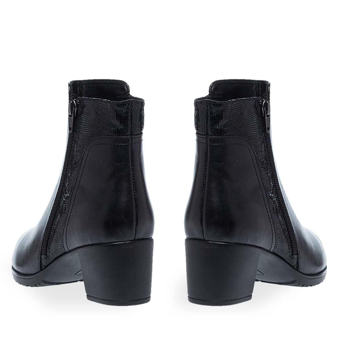 Γυναικεία δερμάτινα μποτάκια Parex. Μαύρα δερμάτινα μποτάκια με τετράγωνο τακούνι και διακριτική λεπτομέρεια στο πίσω μέρος προσφέρουν στυλ και σταθερότητα.