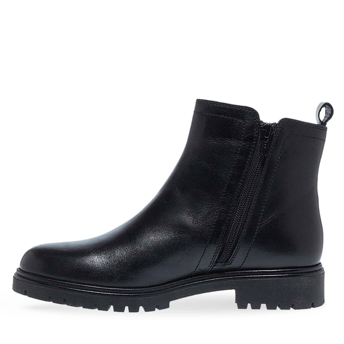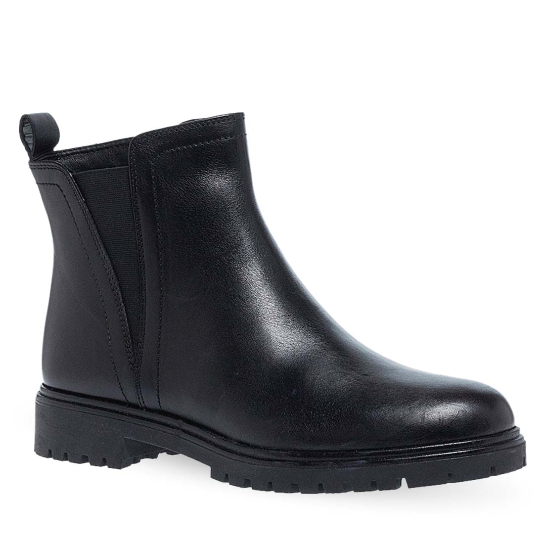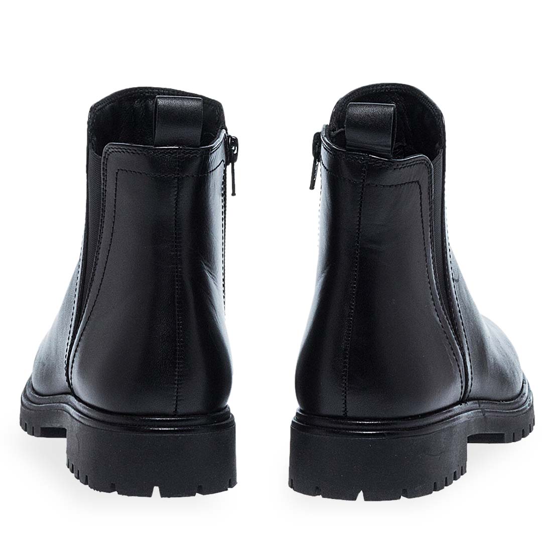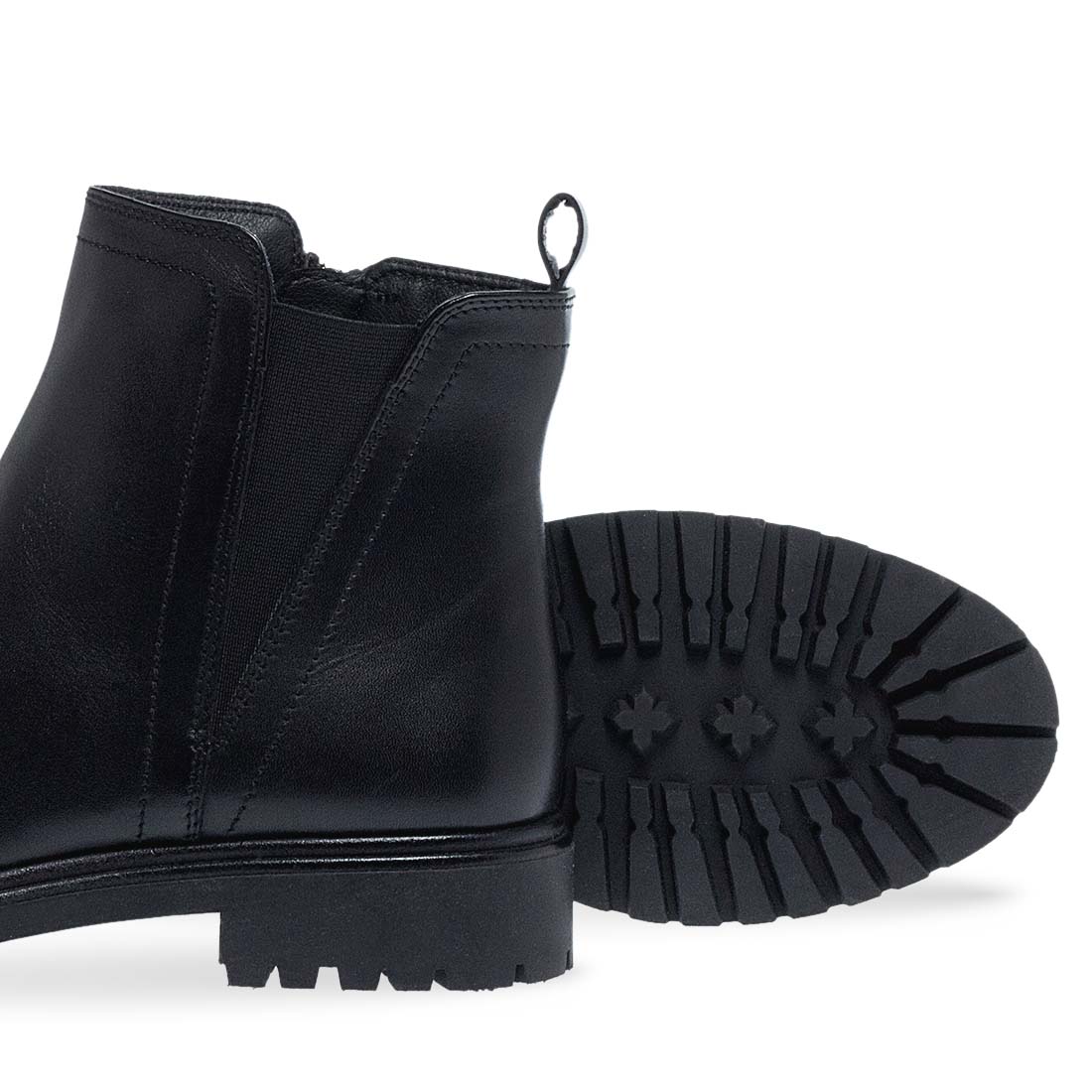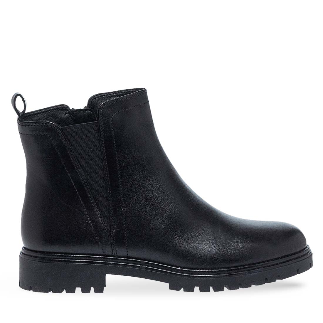 Γυναικεία δερμάτινα μποτάκια Parex. Μαύρα μποτάκια με τρακτερωτή σόλα και φερμουάρ συνδυάζουν στιλ και ανθεκτικότητα για τον χειμώνα.