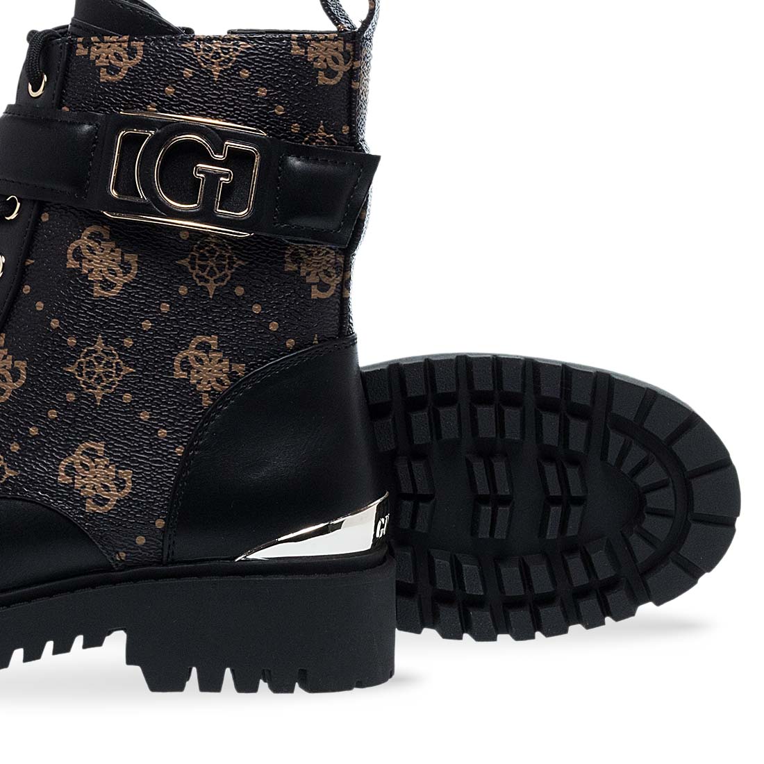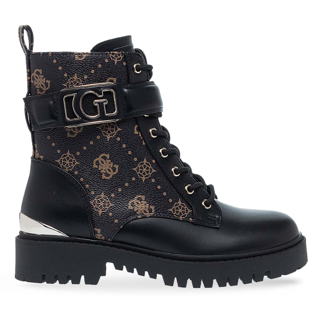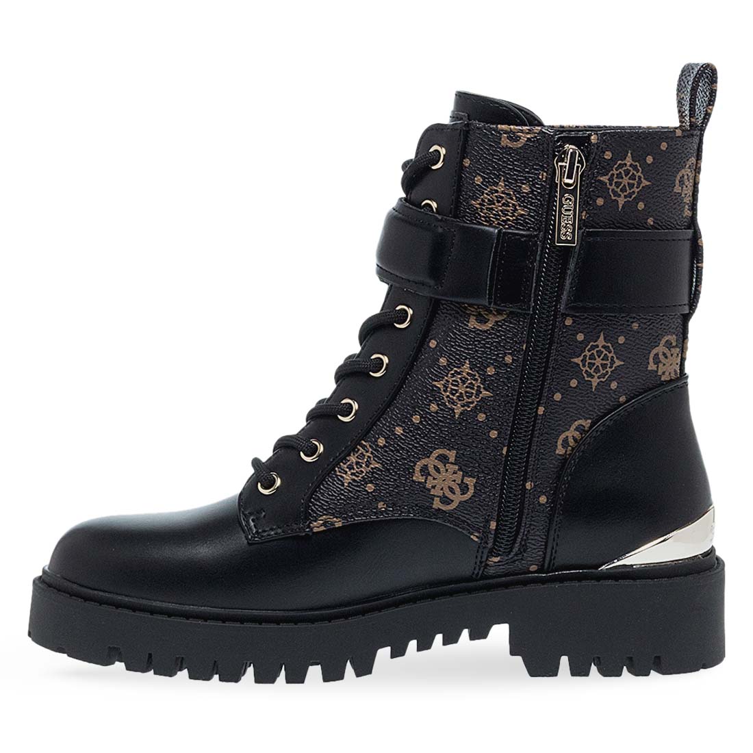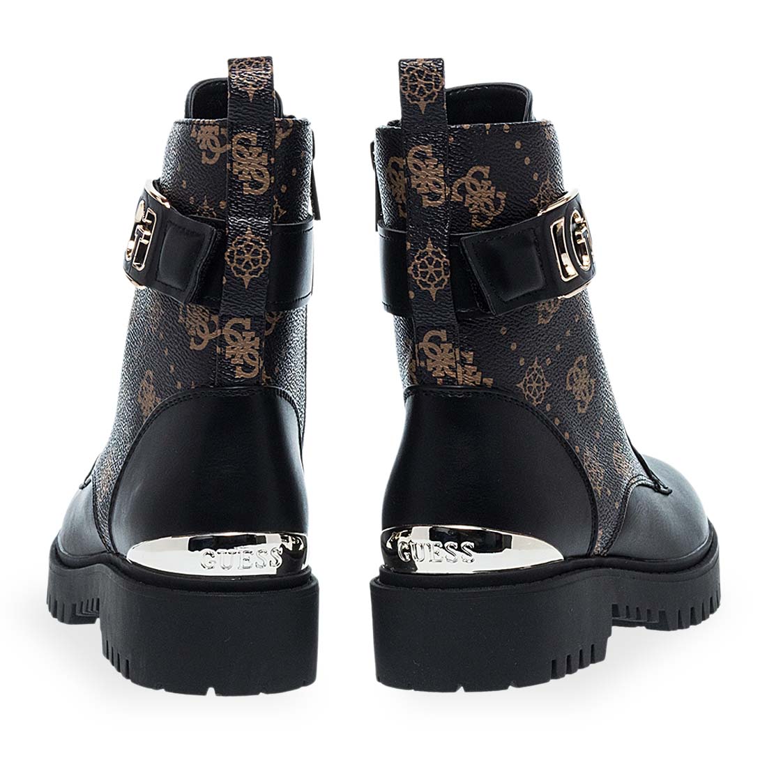 Γυναικεία μποτάκια από το brand Guess. Γυναικεία μποτάκια Guess από συνθετικό δέρμα σε μαύρο και καφέ μοτίβο. Κομψή εμφάνιση με φερμουάρ και σταθερή σόλα για άνετο περπάτημα.
