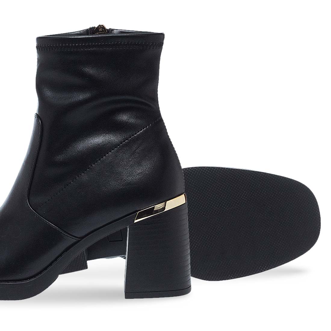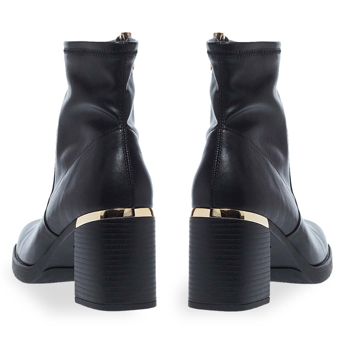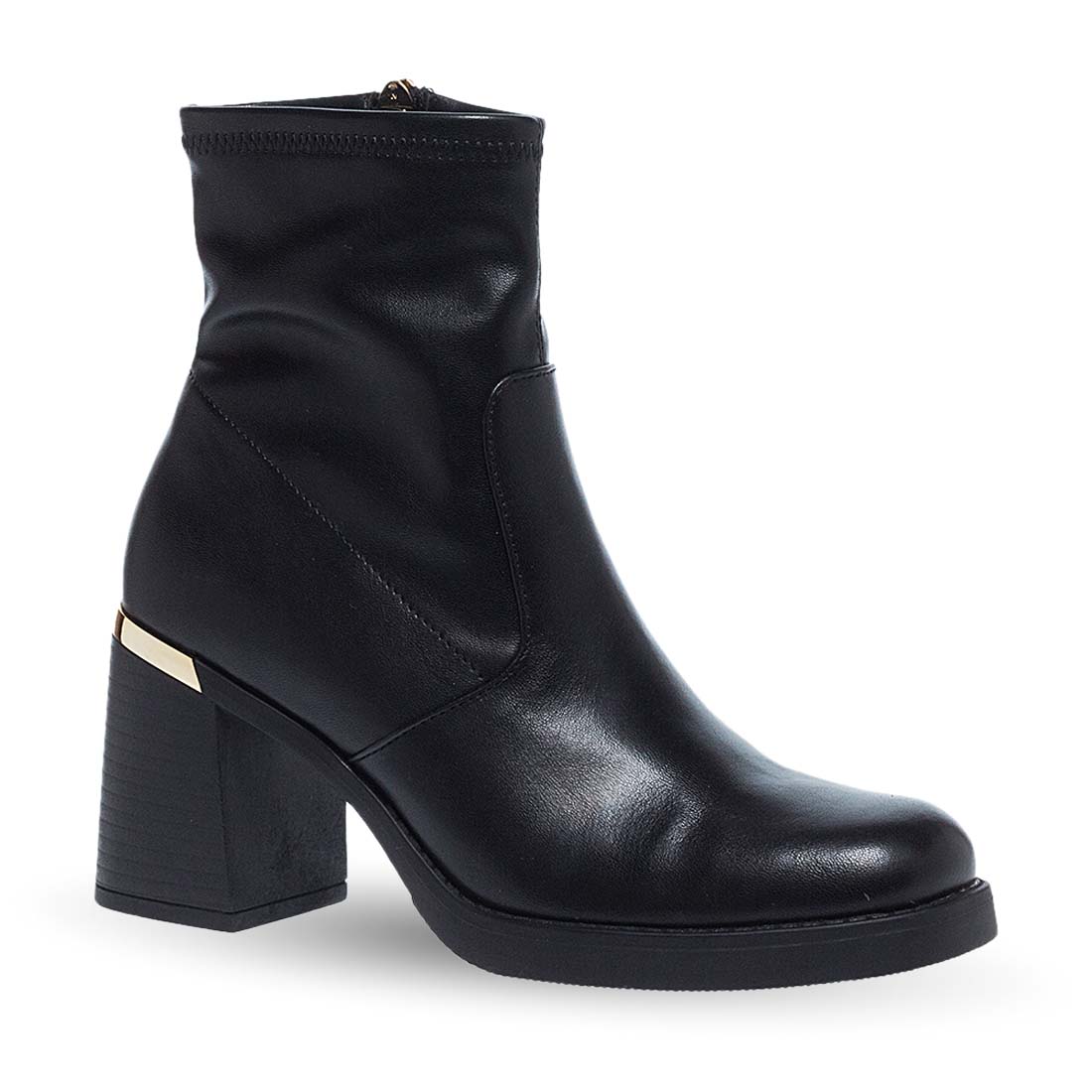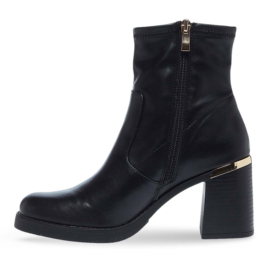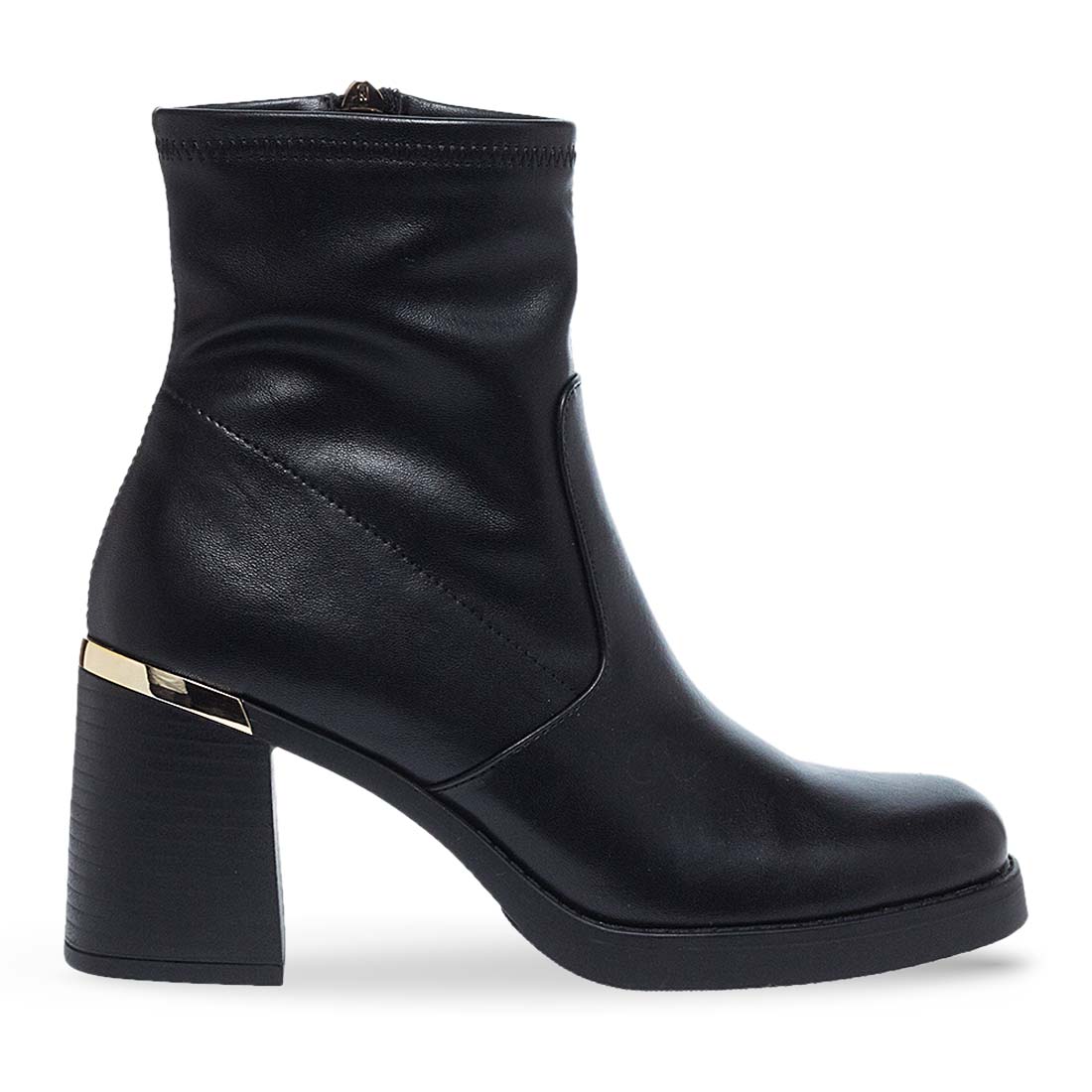 Γυναικεία μαύρα μποτάκια Parex από συνθετικό δέρμα άριστης ποιότητας. Κομψό στιλ και block σταθερό τακούνι με χρυσή λεπτομέρεια. Κλείνουν με φερμουάρ. Ακόμα μια άνετη επιλογή για το καθημερινό σας στιλ.