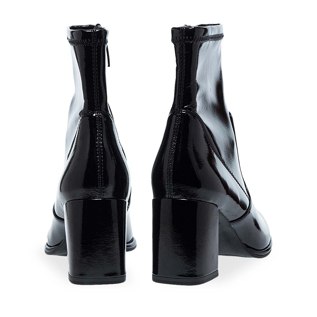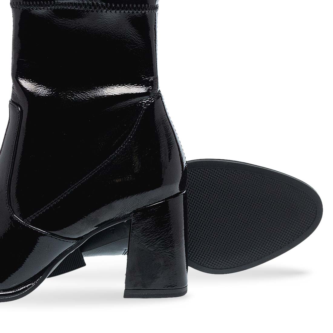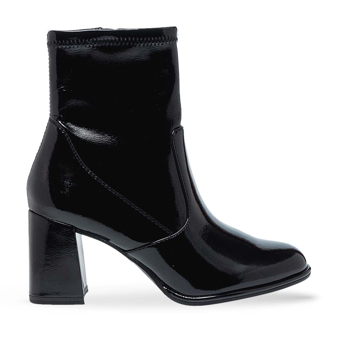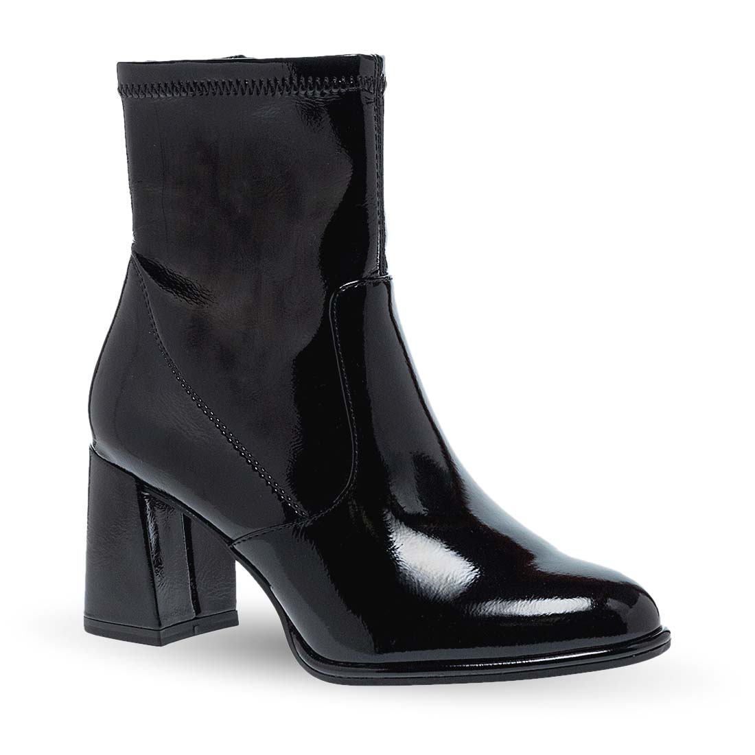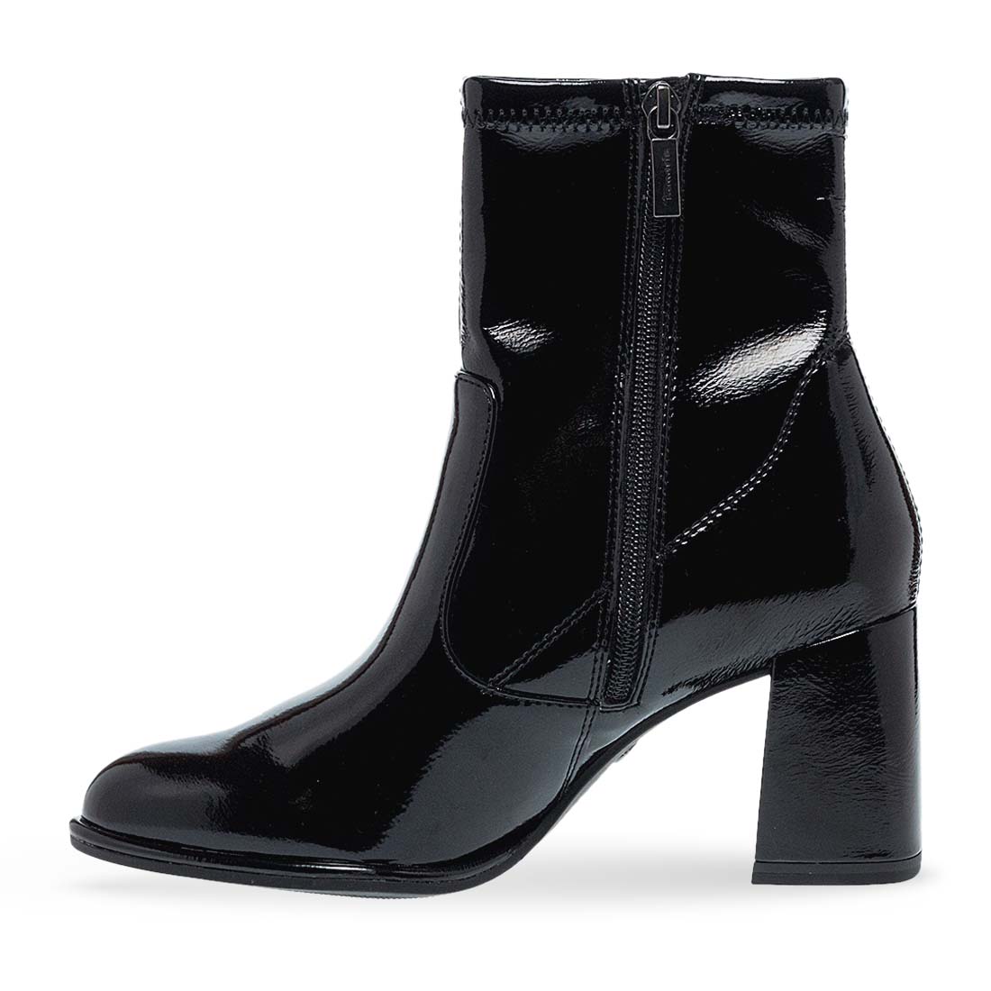 Γυναικεία μποτάκια από το brand Tamaris. Γυναικείο μαύρο λουστρίνι μποτάκι με χοντρό τακούνι και πλαϊνό φερμουάρ. Κομψό και εντυπωσιακό για βραδινές εμφανίσεις.