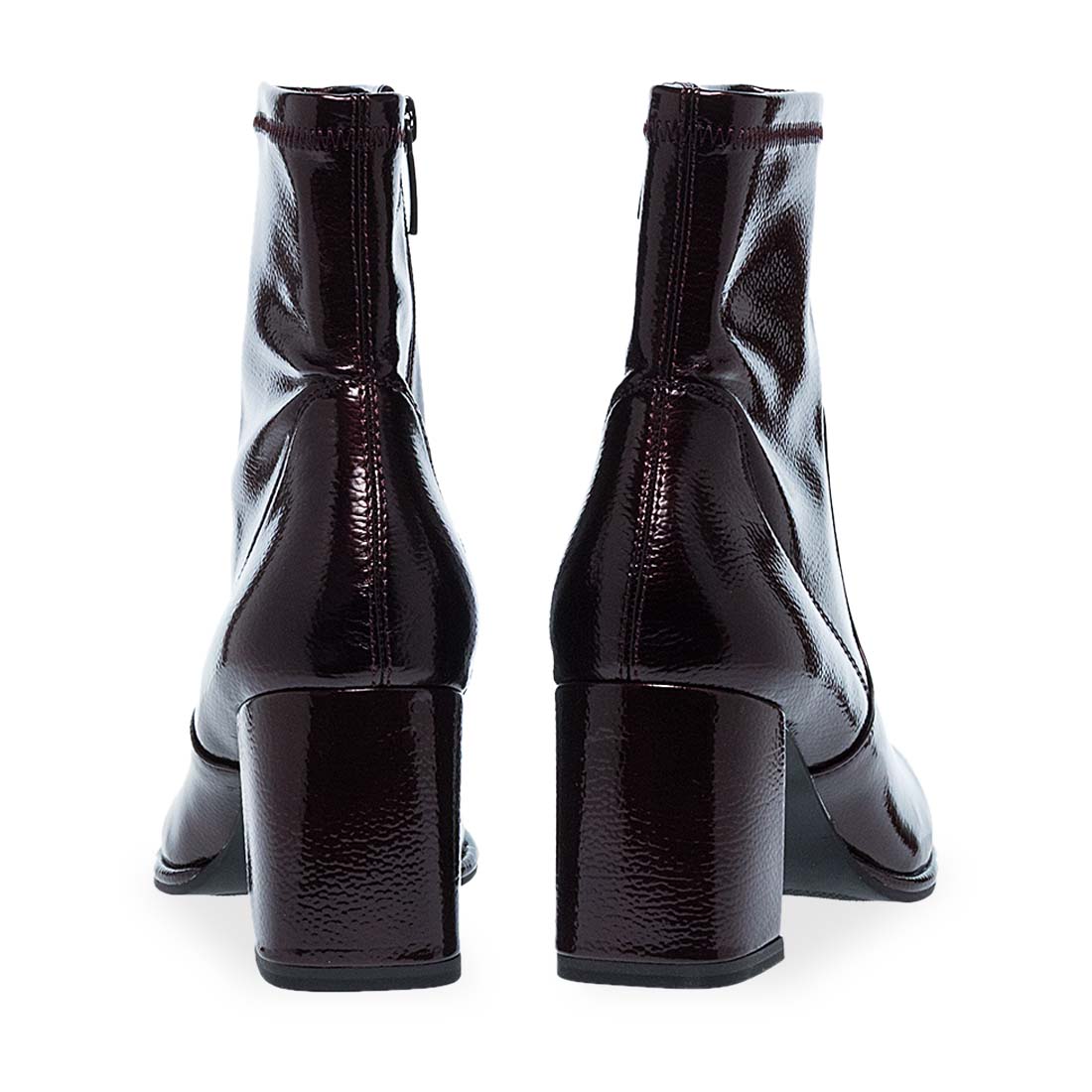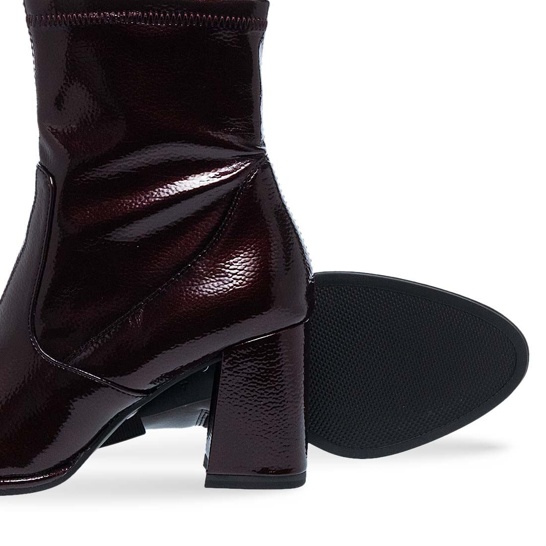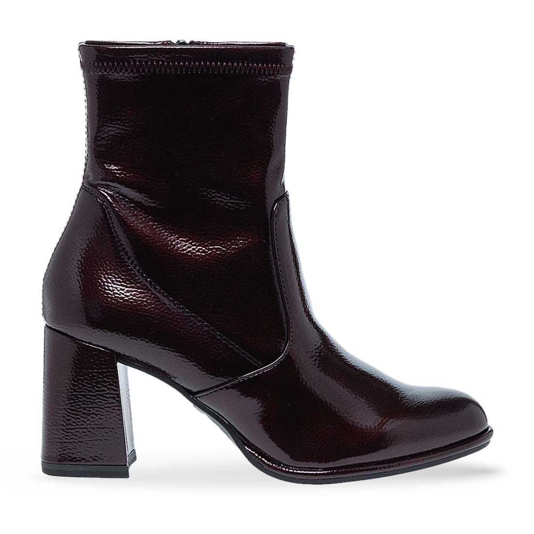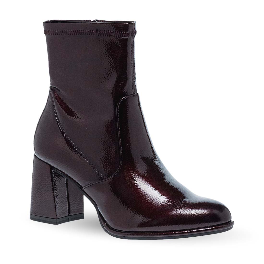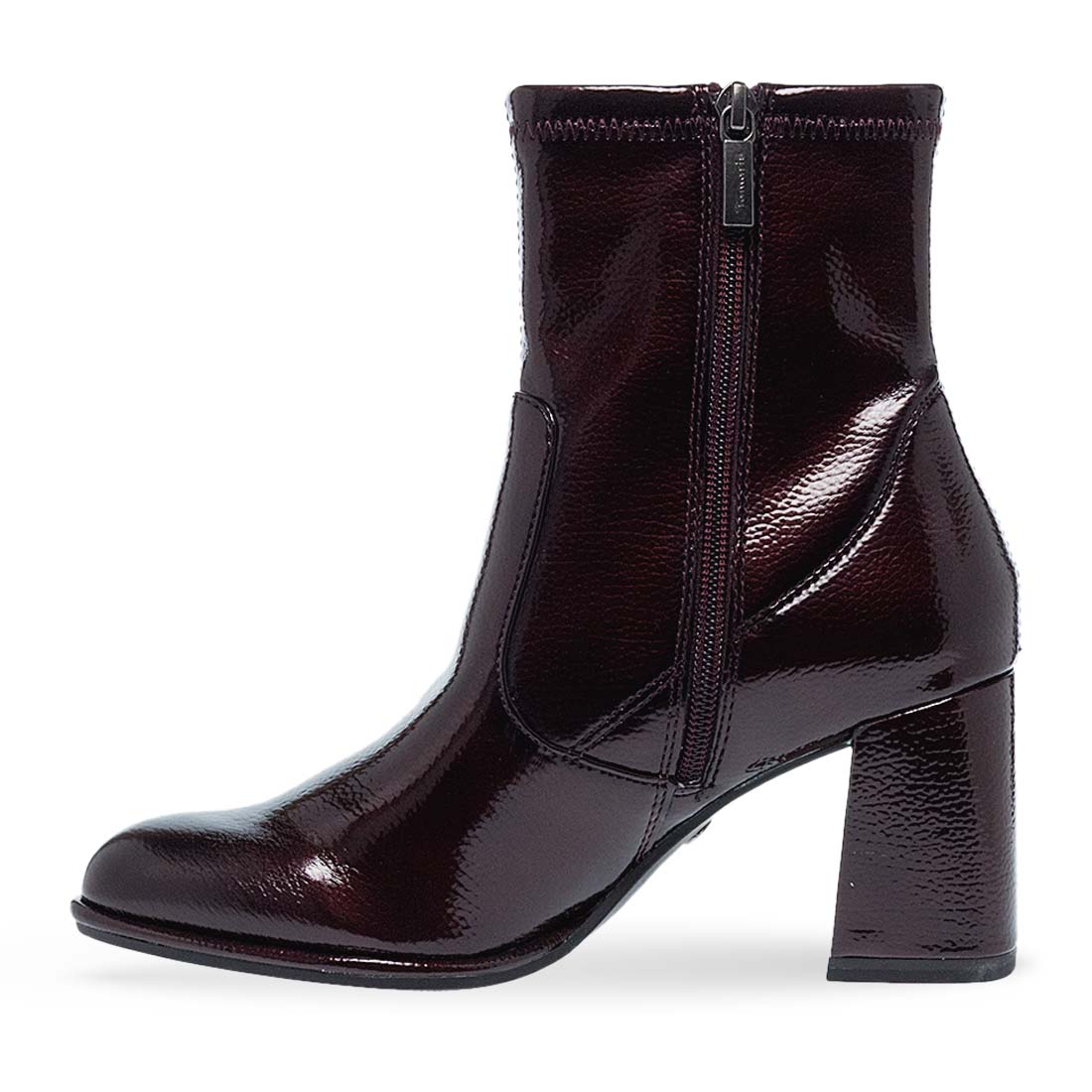 Γυναικεία μποτάκια από το brand Tamaris. Γυναικεία μποτάκια σε μπορντό λουστρίνι, με φερμουάρ και χοντρό τακούνι. Μοντέρνα και άνετα για στυλάτες εμφανίσεις.