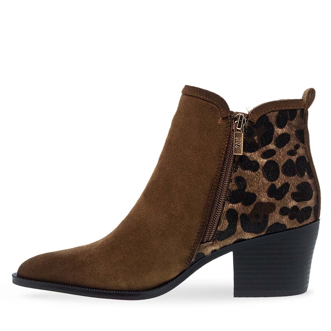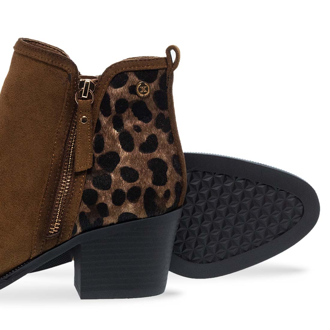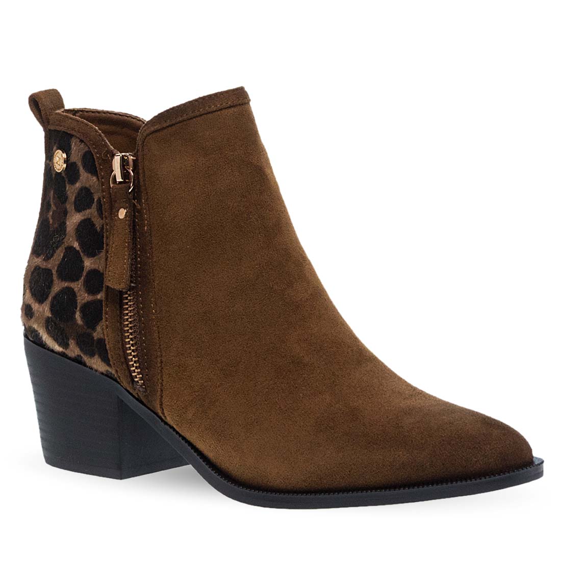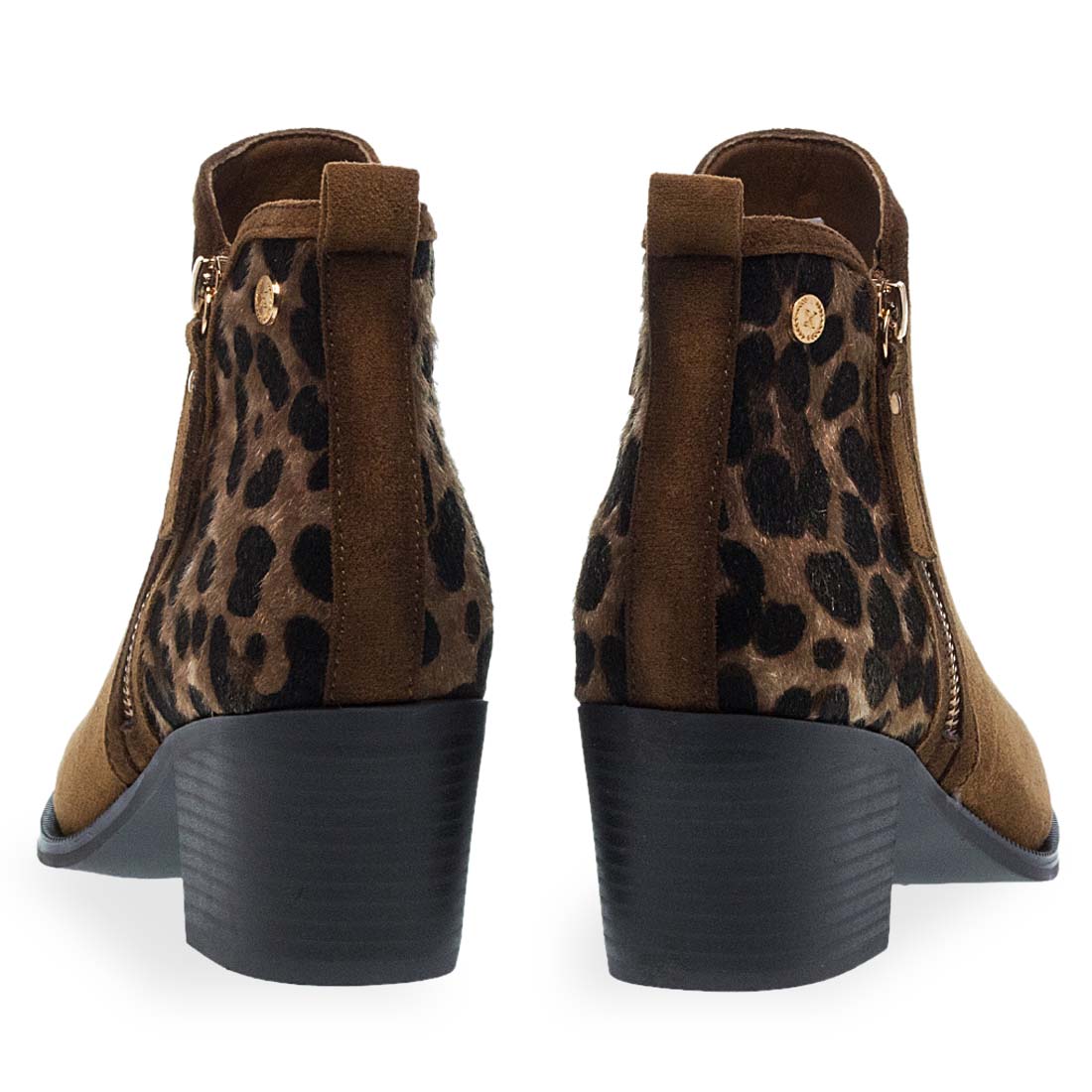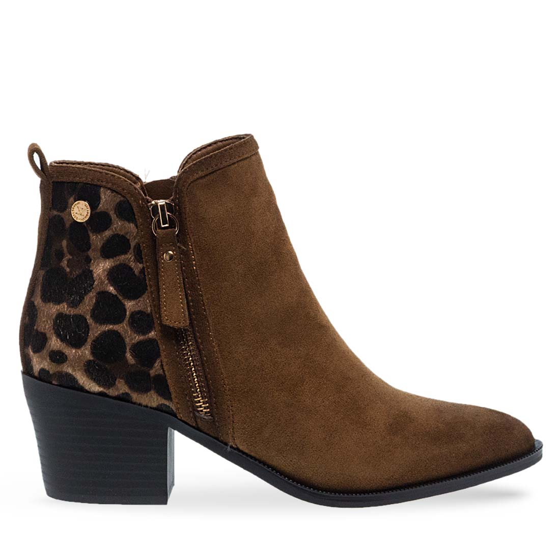 Γυναικεία μποτάκια από το brand Xti. Γυναικείο μποτάκι με κάμελ suede και animal print λεπτομέρεια στο πίσω μέρος. Στιλάτο, με τακούνι για ξεχωριστές εμφανίσεις.