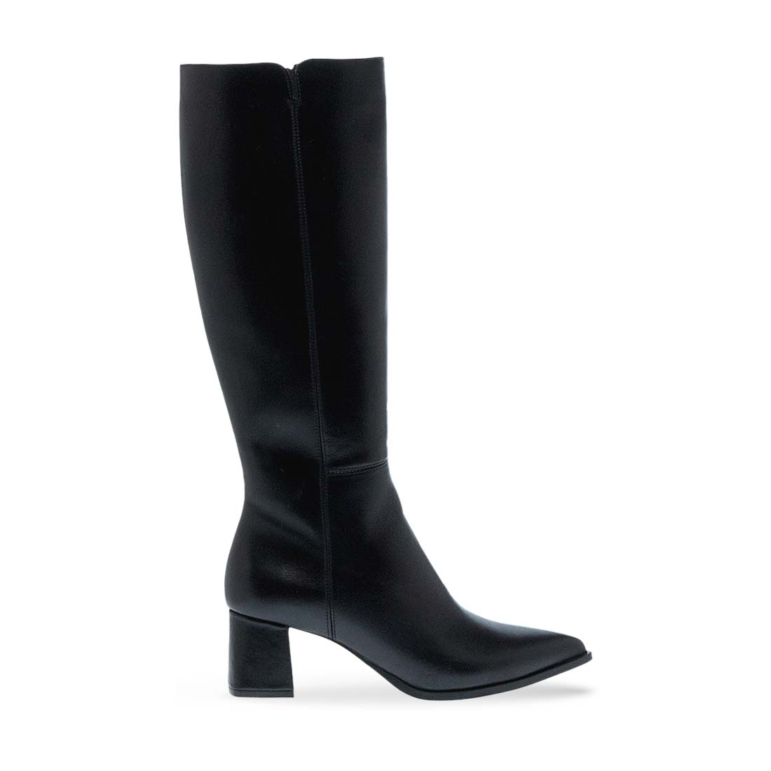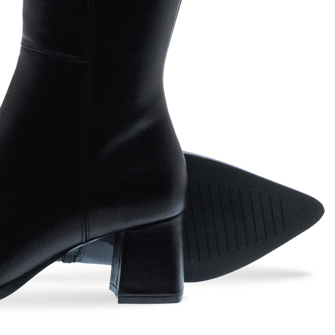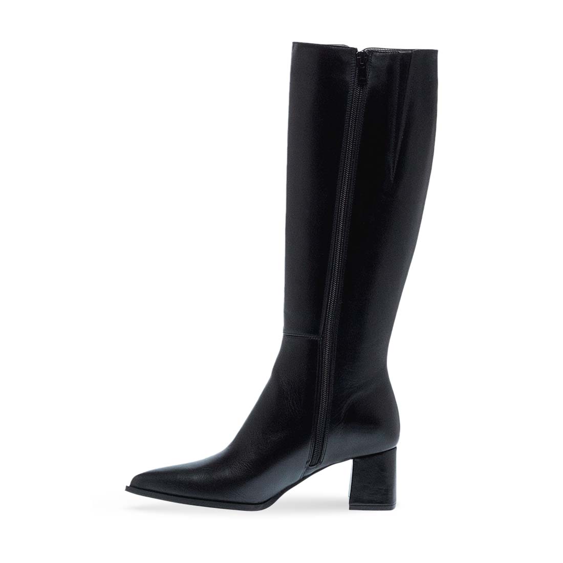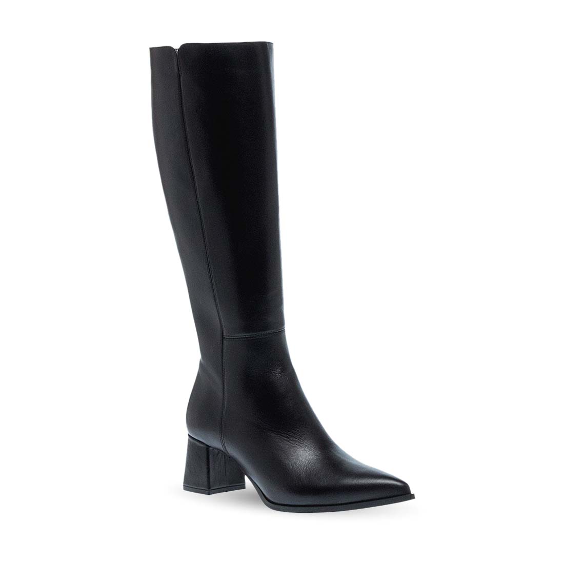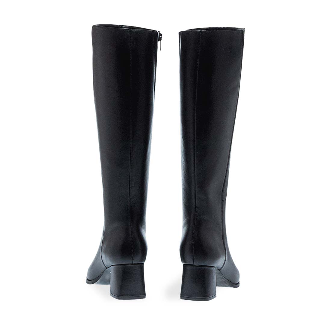 Γυναικείες δερμάτινες μπότες από το brand Maison Minrelle. Κομψή μαύρη μπότα από γνήσιο δέρμα με τετράγωνο τακούνι και μυτερή μύτη, ιδανική για καθημερινές και βραδινές εμφανίσεις.