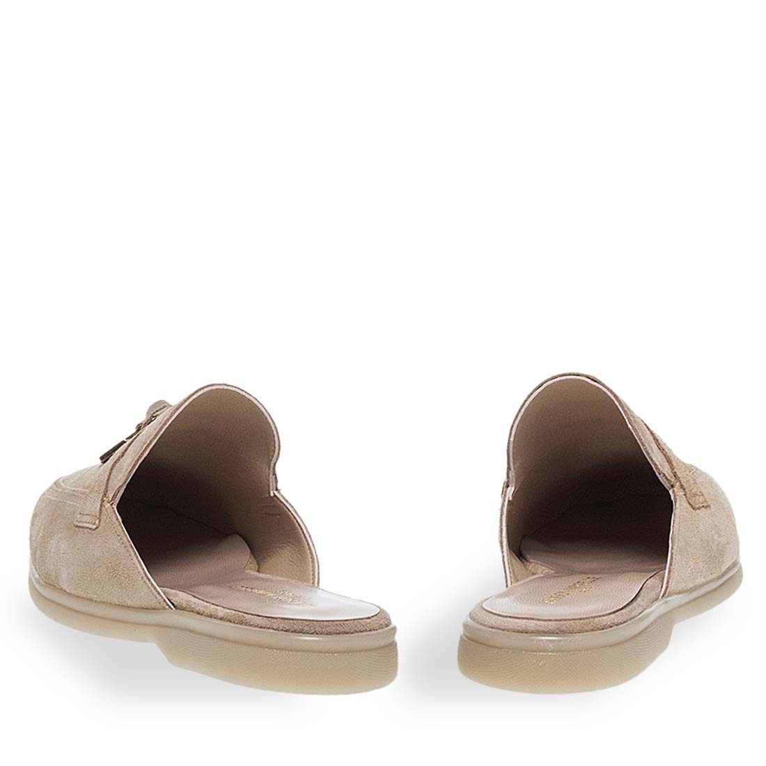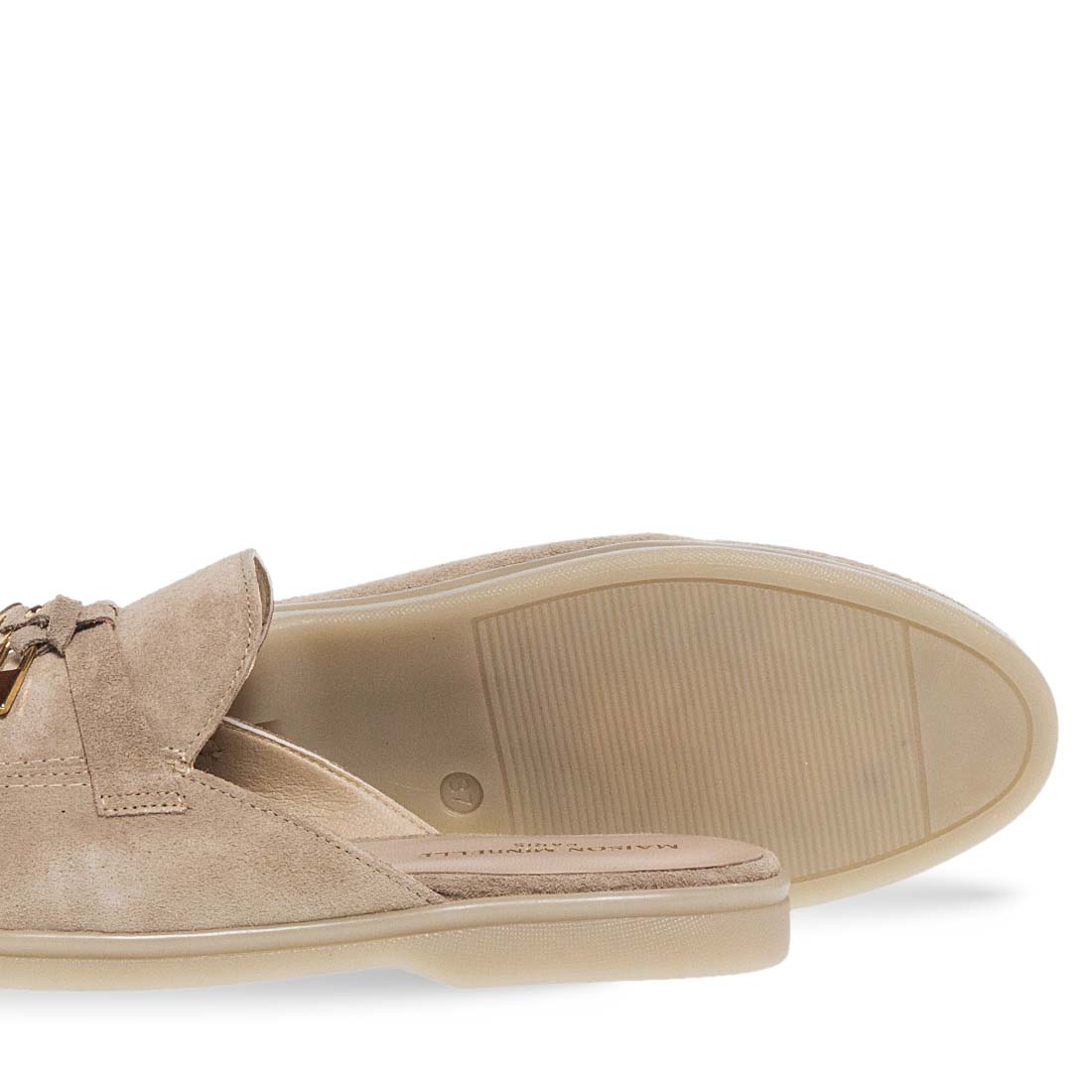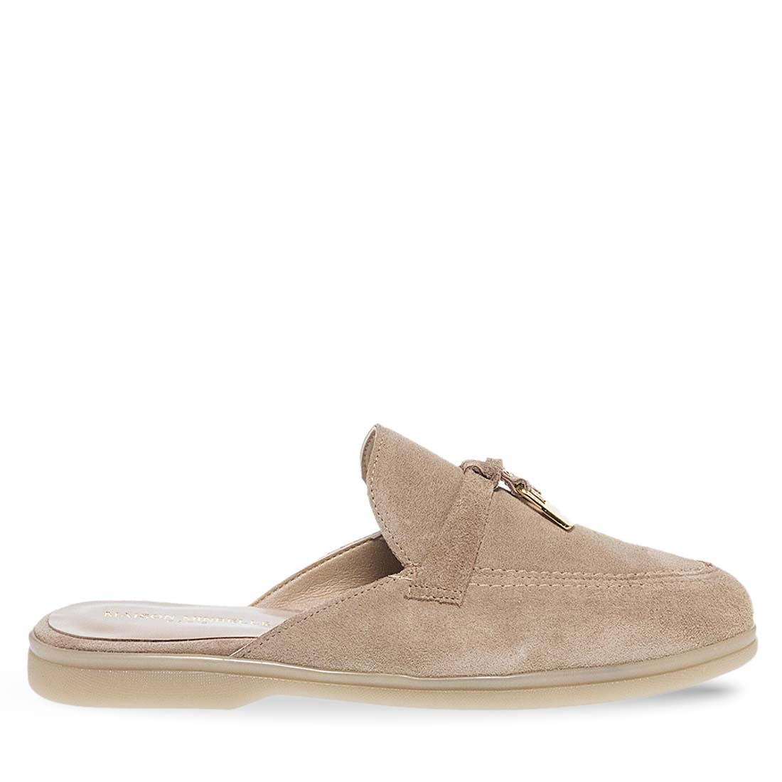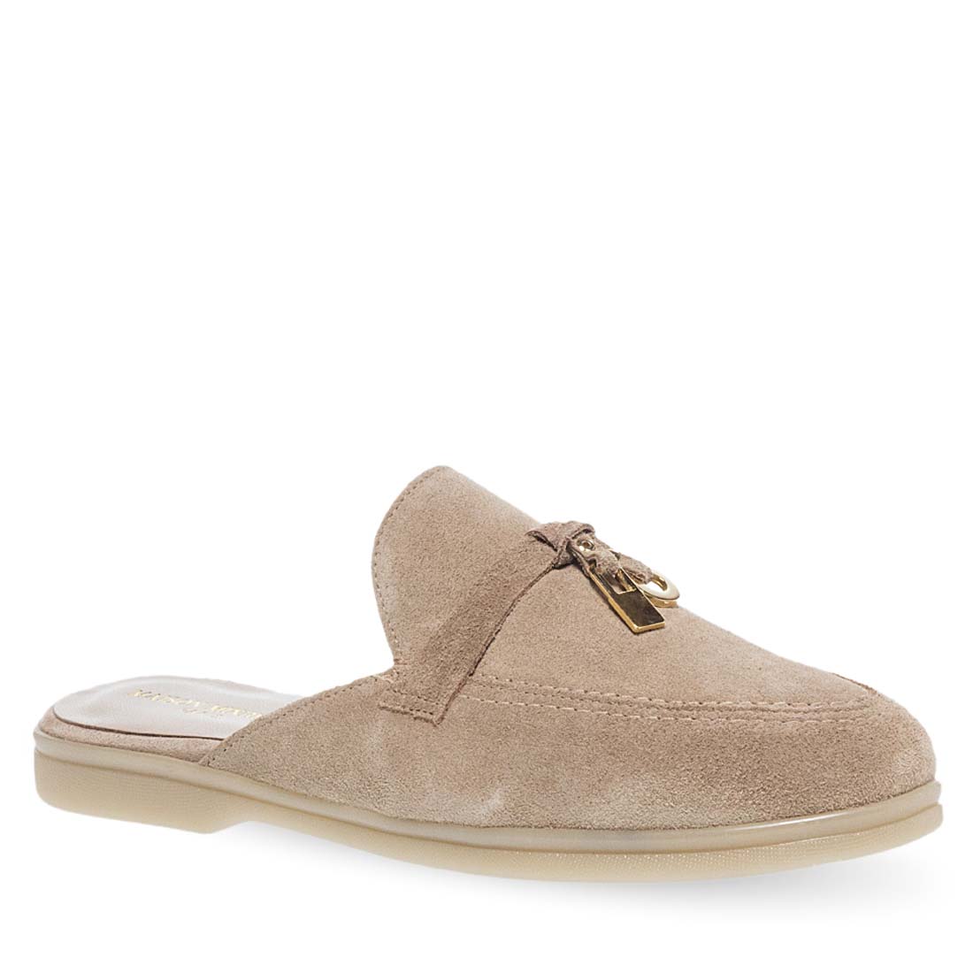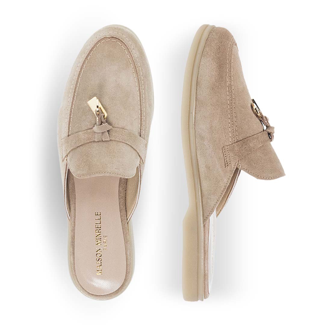 Δερμάτινα mules από το brand Maison Minrelle με suede υφή και χρυσή λεπτομέρεία. Ένα άκρως καλοκαιρινό σχέδιο που θα αναβαθμίσει το look σας. Έχουν πολύ εύκολη εφαρμογή και μαλακό εσωτερικό πάτο. Παπούτσια μεγάλης ανθεκτικότητας & καλής ποιότητας, καταασκευασμένα από άριστα υλικά