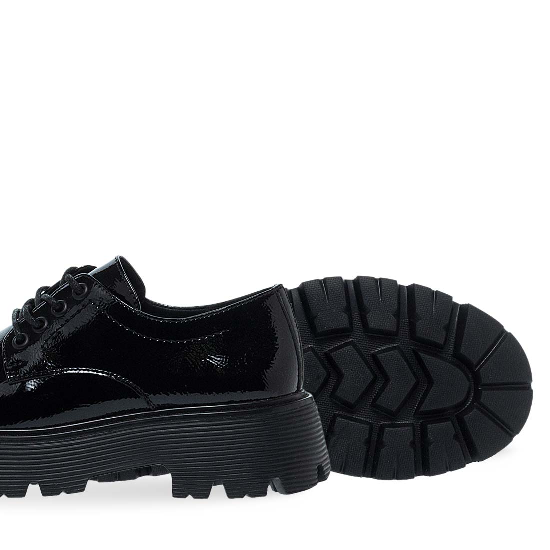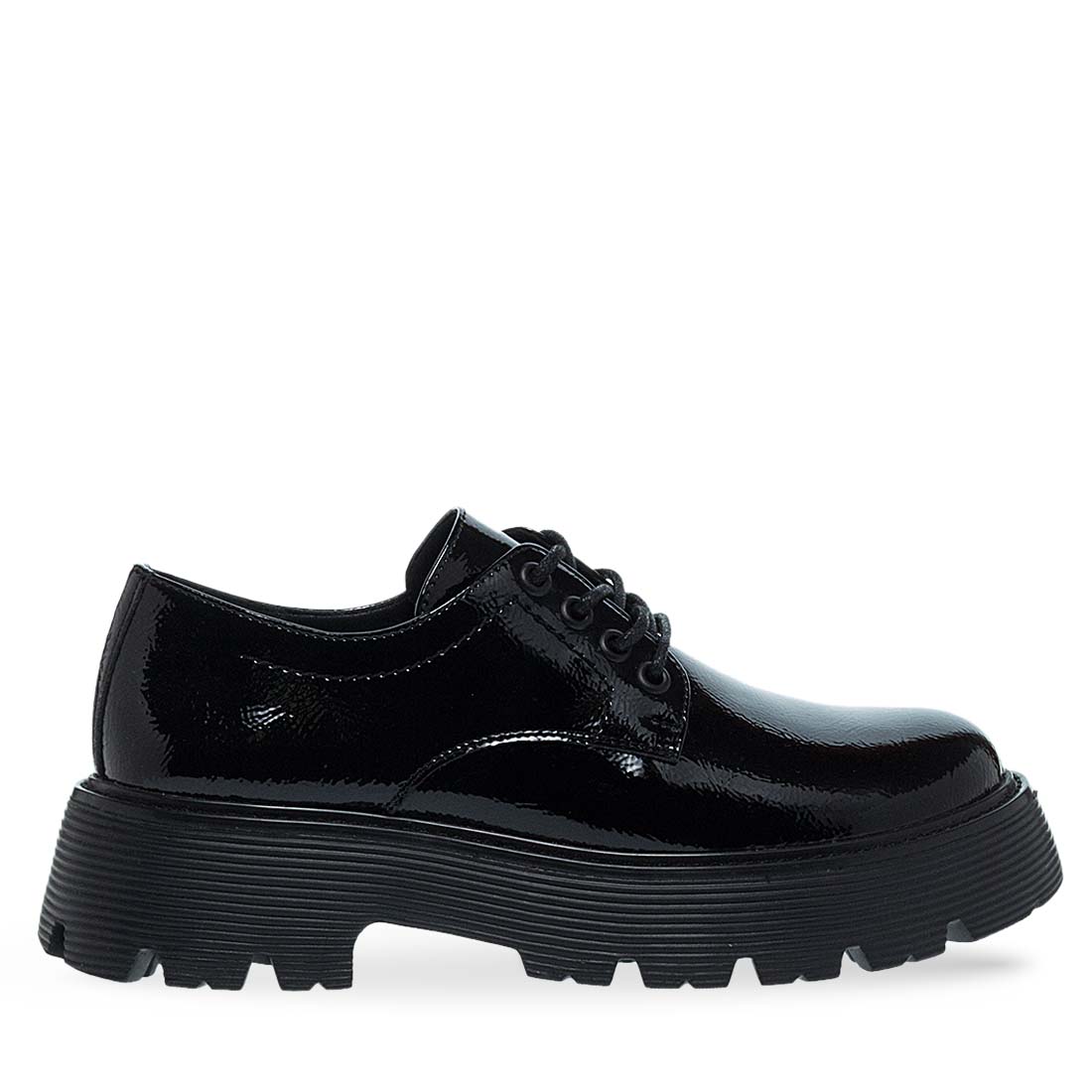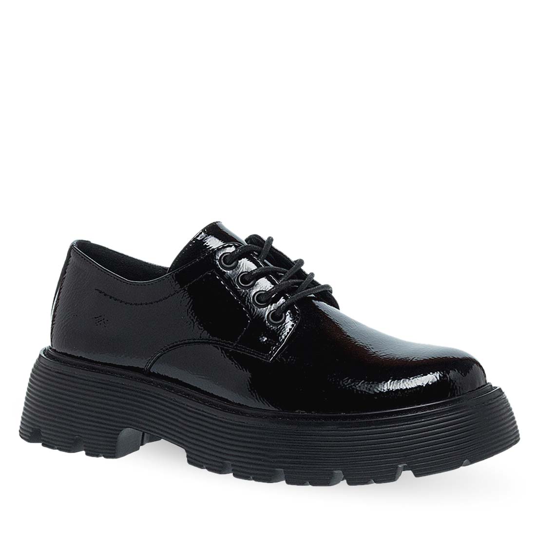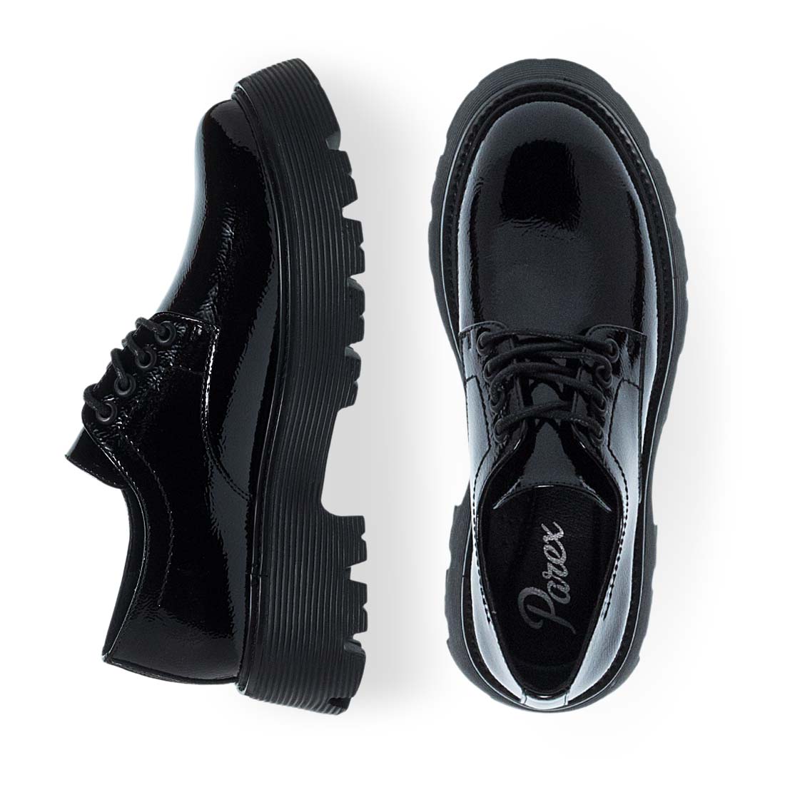 Γυναικεία oxford παπούτσια Parex. Μαύρα γυναικεία παπούτσια Parex τύπου derby με χοντρή σόλα. Γυαλιστερό φινίρισμα και δυναμικό στυλ για κάθε εμφάνιση. Τεχνολογία "UltraLight" με ελαφρύ σχεδιασμό για άνεση, επιστροφή ενέργειας και ελευθερία κίνησης, προσφέροντας ένα αβίαστο, φυσικό βάδισμα.