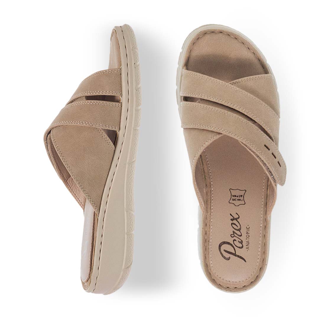 Χιαστί γυναικείες comfort παντόφλες από την εταιρεία Parex για να σας προσφέρουν ξεκούραστα βήματα σε κάθε στιγμή της ημέρας. Διαθέτουν εξωτερικές ραφές και κλείνουν με αυτοκόλλητο velcro. Εύκαμπτες και άνετες καλοκαιρινές παντόφλες με δερμάτινο εσωτερικό πάτο και εύκολη εφαρμογή.