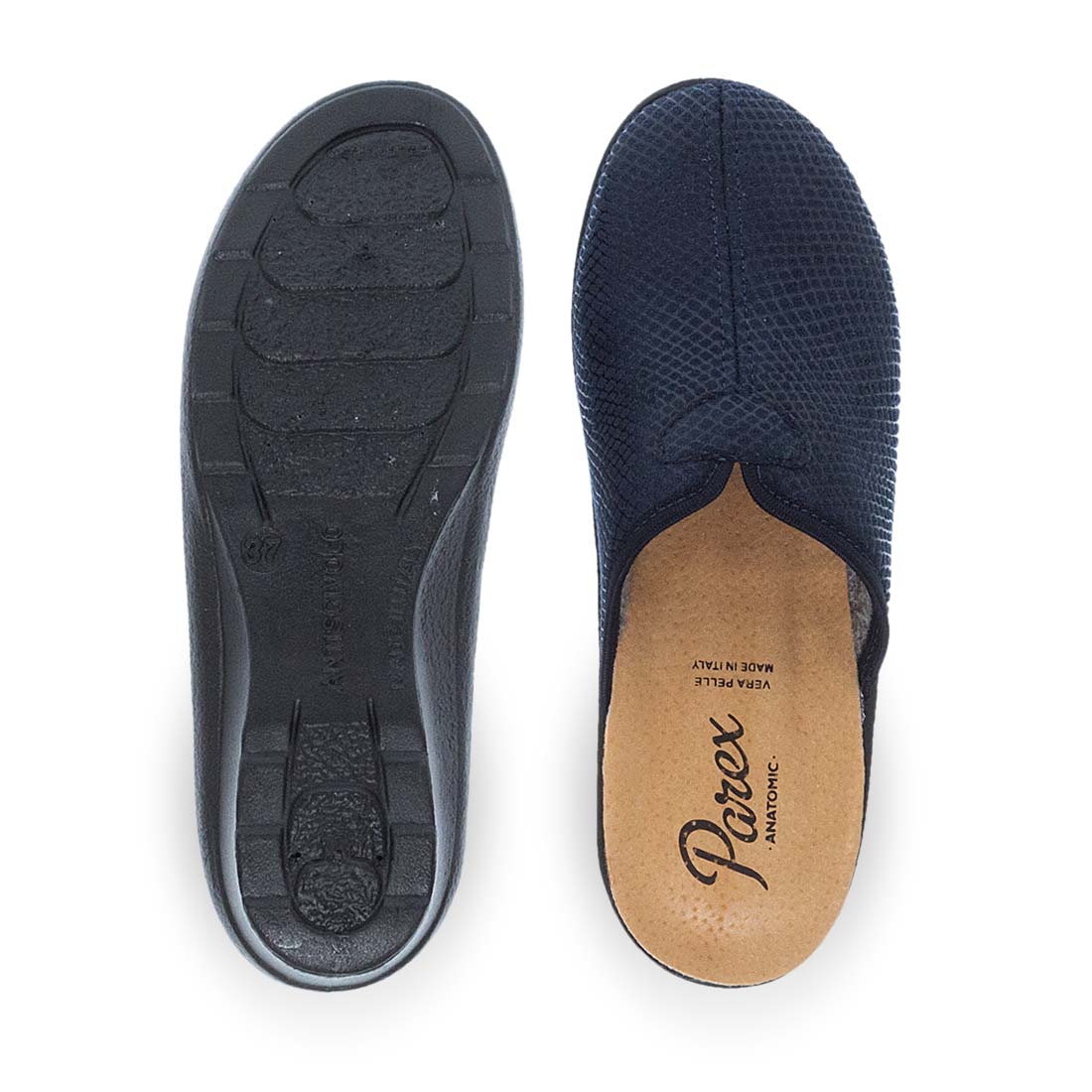 Χειμερινές παντόφλες σπιτιού από την εταιρεία Parex. Eξωτερικά έχουν σχεδιαστεί από μαλακό ύφασμα. Άνετες παντόφλες σπιτιού με χαμηλό τακούνι και ανθεκτικά υλικά. Δερμάτινος εσωτερικός πάτος για να προστατεύει τα πέλματά σας.