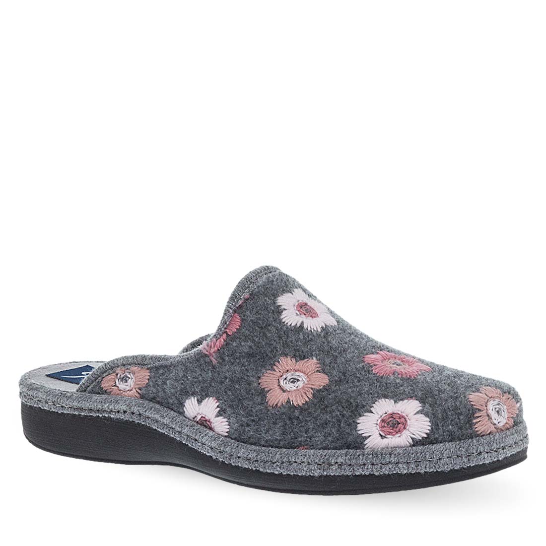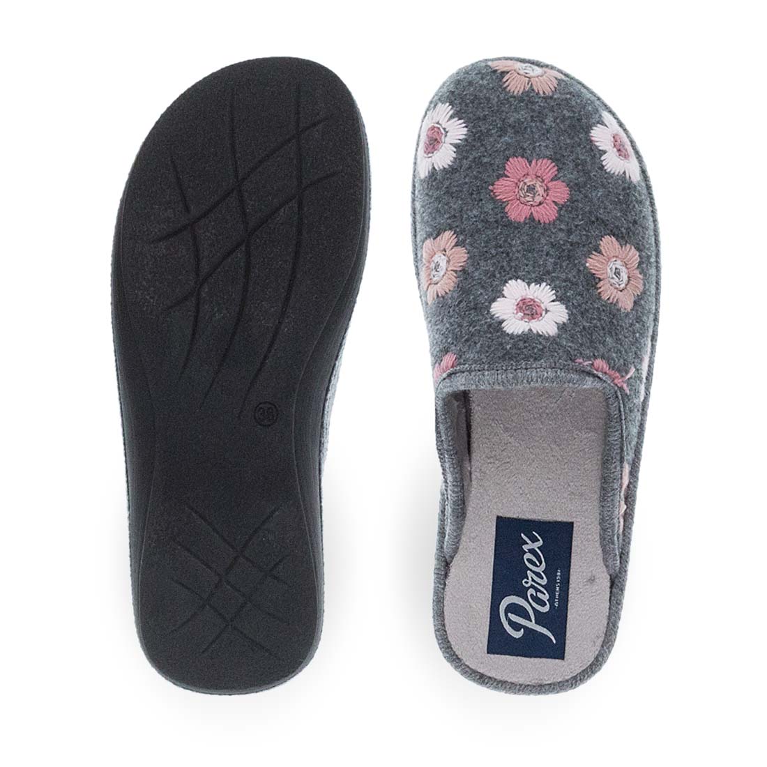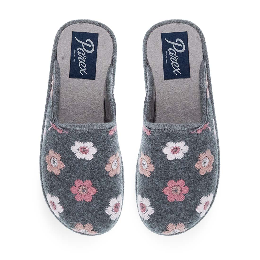 Γυναικείες παντόφλες σπιτιού. Γυναικείες παντόφλες σπιτιού Parex με διακοσμητικά κεντημένα λουλούδια με χρωματιστή ύφανση από τσόχα. Διαθέτουν υφασμάτινο μαλακό πέλμα με βελούδινη υφή. Μια χειμερινή,αναπαυτική επιλογή με ιδανικό τακούνι,διαθέσιμες σε μπλε και γκρι χρώμα.
