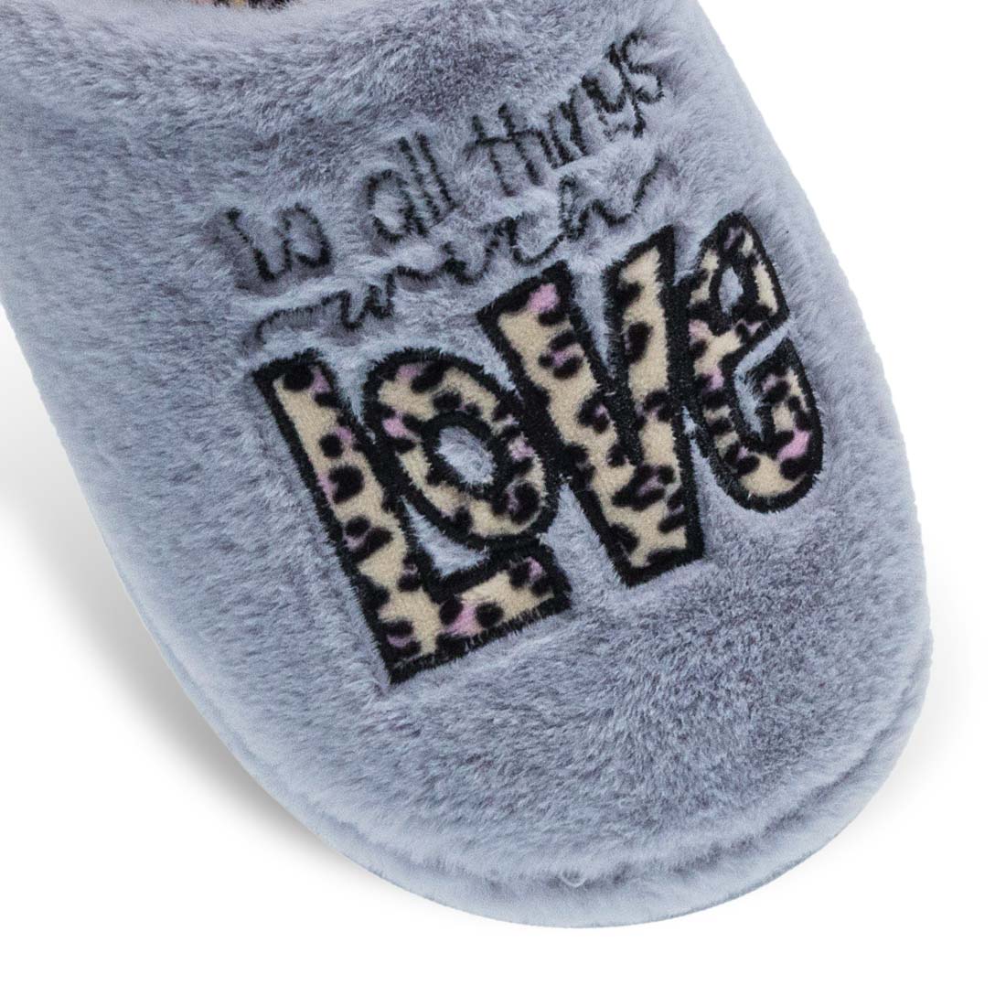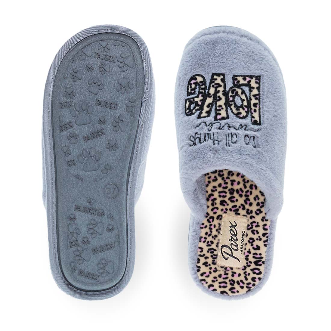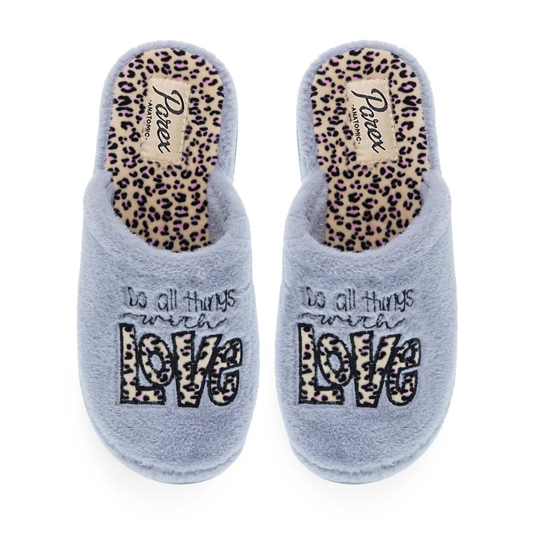 Γυναικείες παντόφλες σπιτιού Parex. Γυναικείες παντόφλες Parex σε μπεζ και γκρι χρώμα με κεντημένο μήνυμα ''Do all things with Love'', leopard εσωτερικό και μαλακή υφή για στυλ και άνεση.