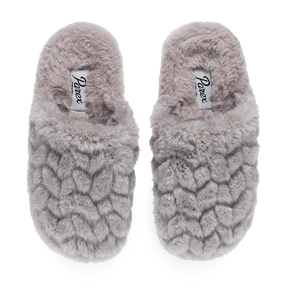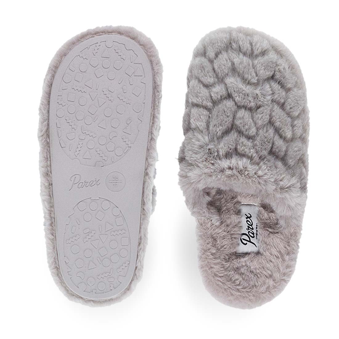 Γυναικείες παντόφλες σπιτιού Parex. Γυναικείες παντόφλες Parex σε γρκι και εκρού χρώμα με απαλή γούνα και ανάγλυφο σχέδιο. Προσφέρουν cozy αίσθηση και μοντέρνο look.