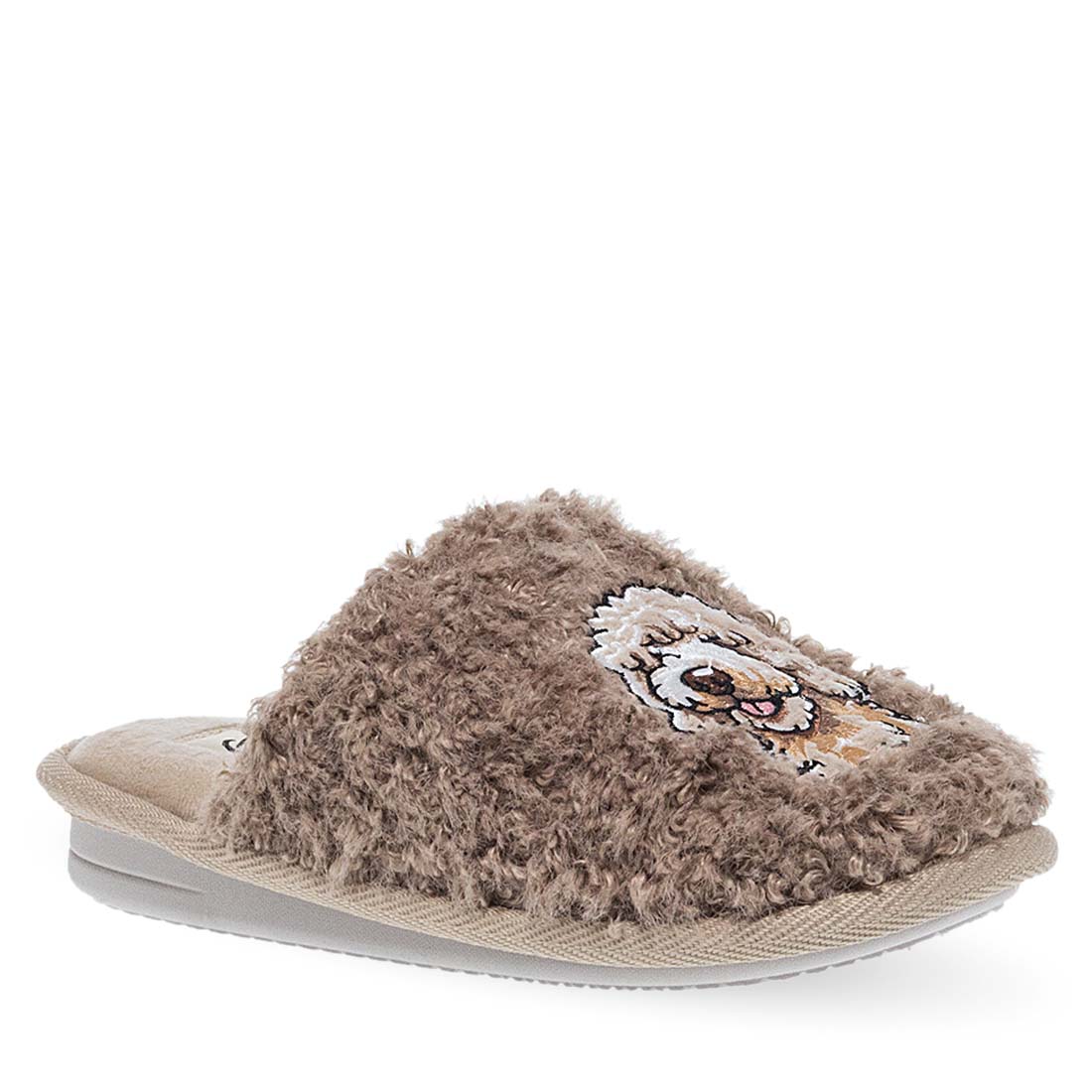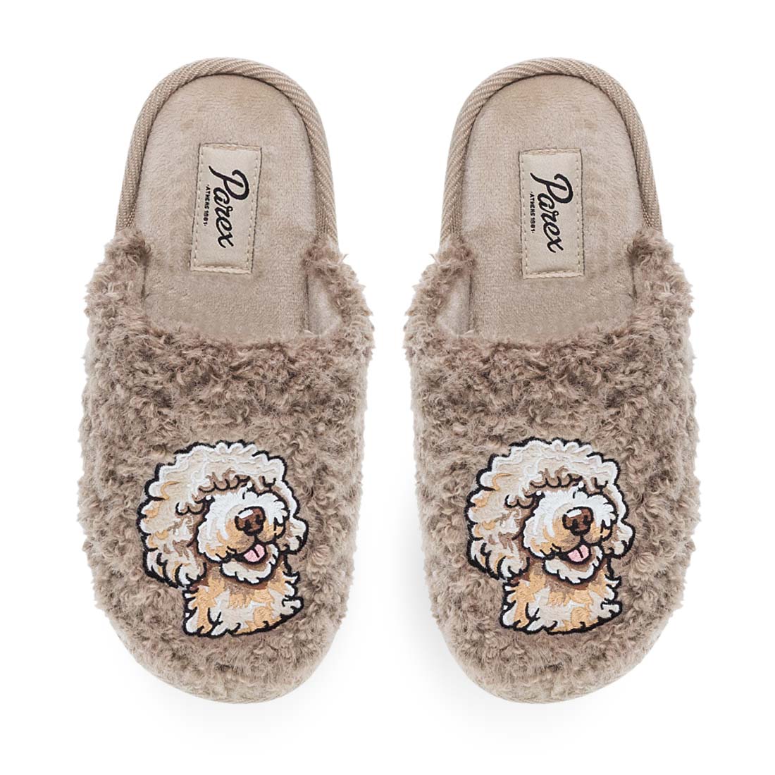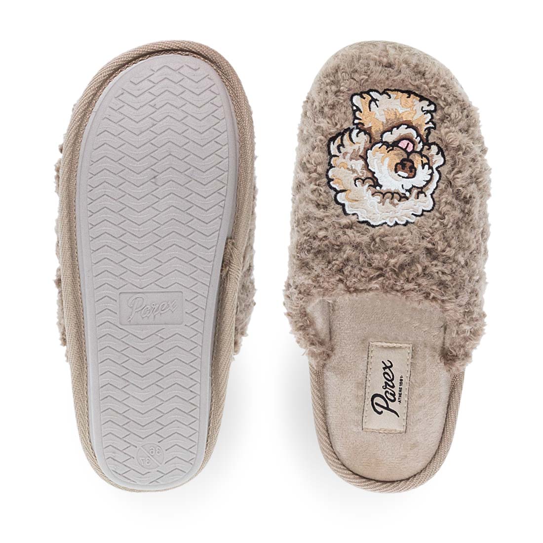 Γυναικείες παντόφλες σπιτιού Parex. Γυναικείες παντόφλες Parex σε μπεζ και γκρι με σχέδιο σκυλάκι, αφράτη υφή και μαλακή επένδυση. Ιδανικές για ζεστασιά και χαριτωμένο στυλ.