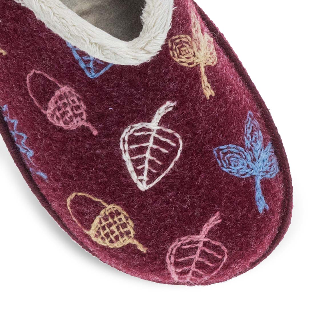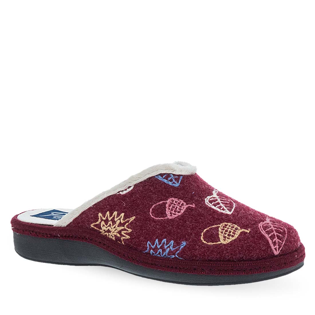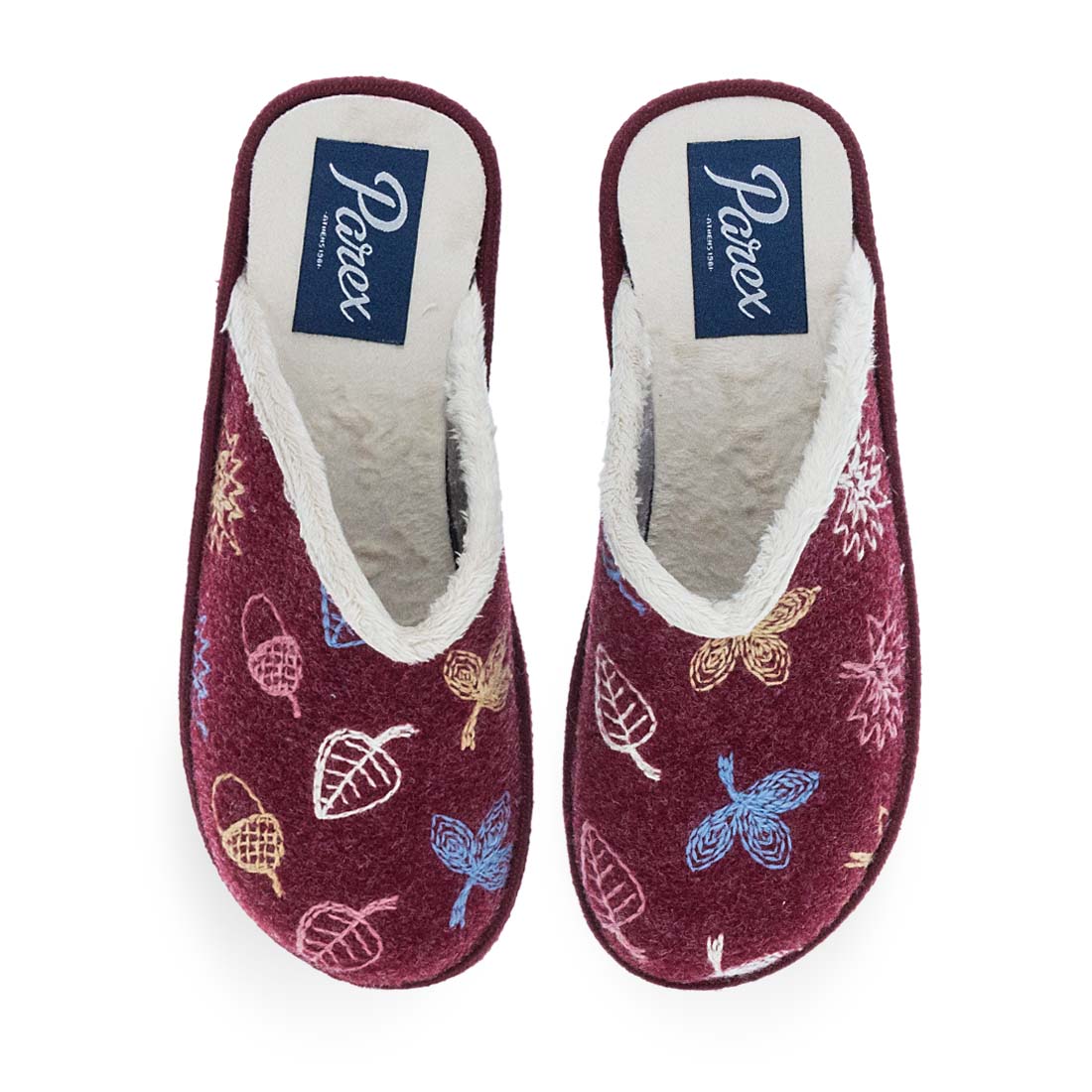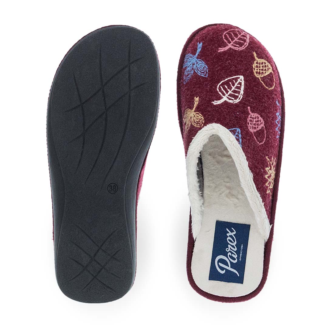Γυναικείες παντόφλες σπιτιού Parex. Γυναικείες παντόφλες Parex σε μπορντώ και μπλε χρώμα με πολύχρωμα μοτίβα φύλλων. Ζεστή και απαλή επένδυση, ιδανική για τον χειμώνα. Μοντέρνο και χαρούμενο σχέδιο για ξεκούραση στο σπίτι.