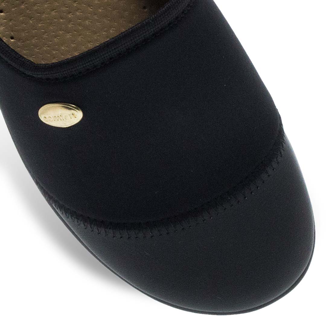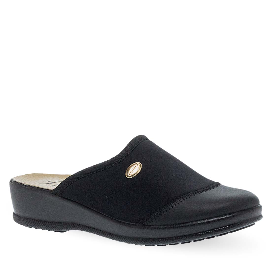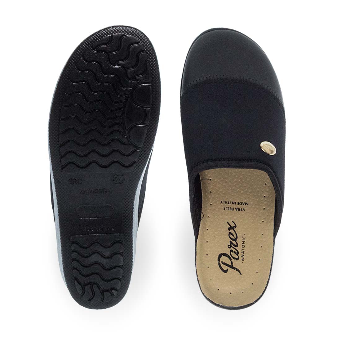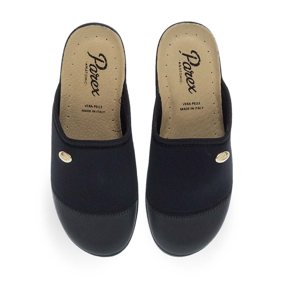 Γυναικείες παντόφλες σπιτιού Parex. Μαύρες γυναικείες ανατομικές παντόφλες Parex. Δερμάτινος πάτος “Vera Pelle” που προσφέρει άνεση και ξεκούραση. Κλασικό στυλ με χρυσή λεπτομέρεια.