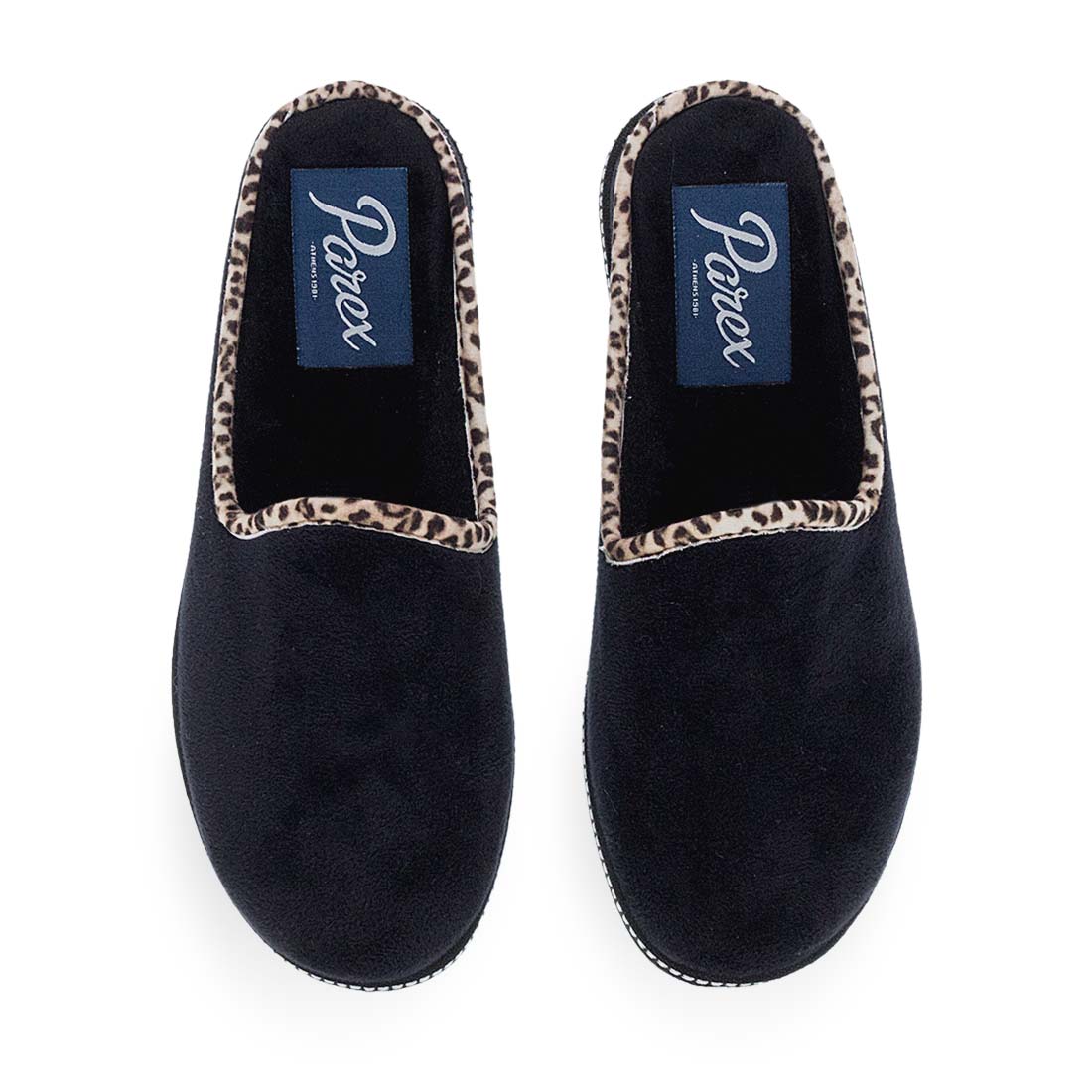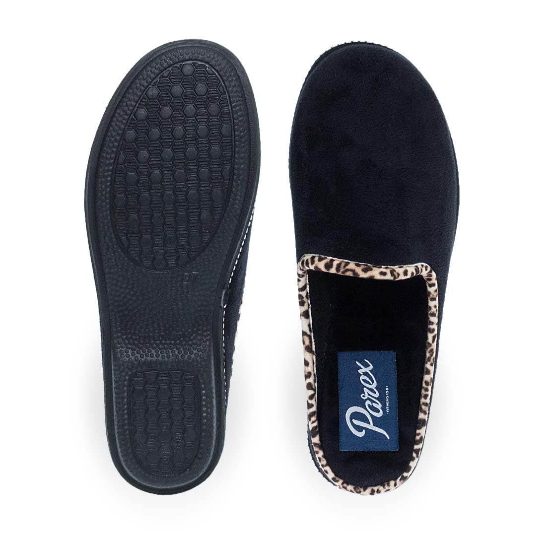 Γυναικείες παντόφλες σπιτιού Parex. Γυναικεία παντόφλα Parex σε μαύρο και μπεζ χρώμα με animal print λεπτομέρεια. Ελαφριά και άνετη, ιδανική για καθημερινή χρήση στο σπίτι. Λειτουργικό design που προσφέρει ζεστασιά και στυλ.