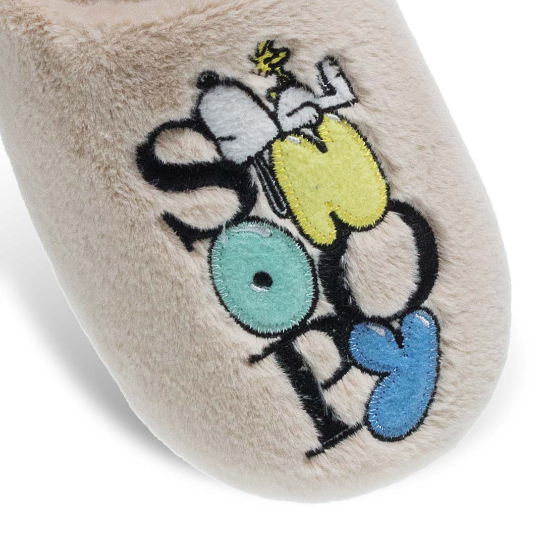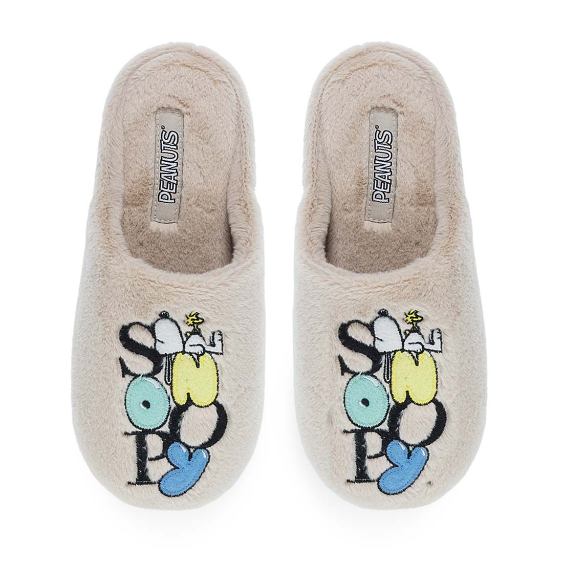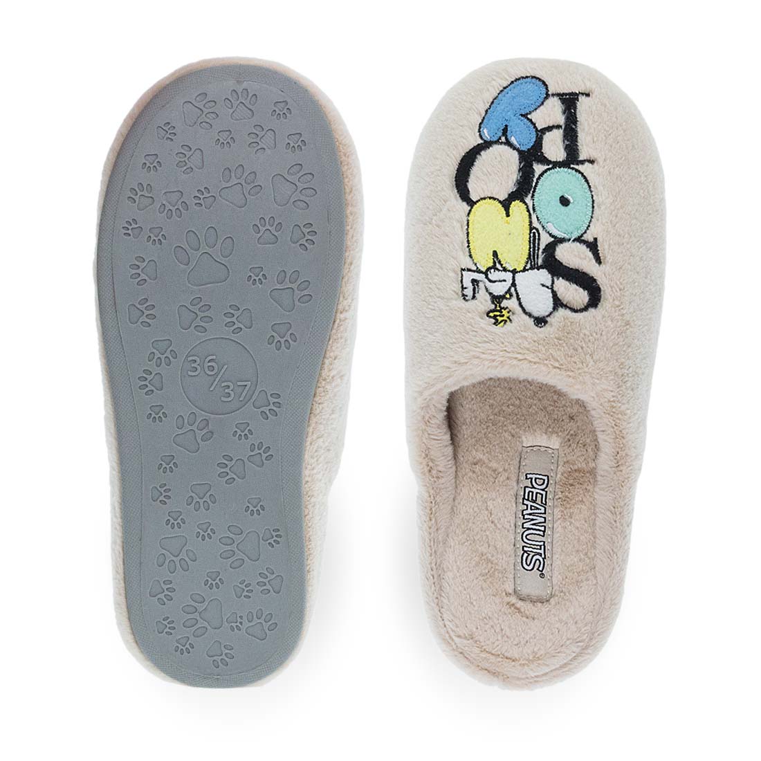 Γυναικείες παντόφλες σπιτιού Peanuts. Παντόφλες Parex Peanuts Snoopy σε μπεζ και γκρι με πολύχρωμο λογότυπο. Ιδανικές για casual στιλ στο σπίτι.