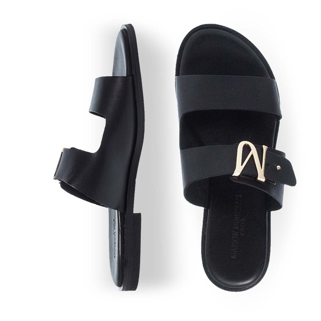 Δερμάτινα σανδάλια από το brand Maison Minrelle με εντυπωσιακό μεταλλικό στοιχείο στο επάνω μέρος με το αρχικό του λογότυπου. Φαρδιές φάσες στο επάνω μέρος. Διαθέτουν μαλακό δερμάτινο πέλμα και σταθερή σόλα. Αυτά τα γυναικεία σανδάλια δεν θα θέλετε να τα αποχωριστείτε όλο το καλοκαίρι.