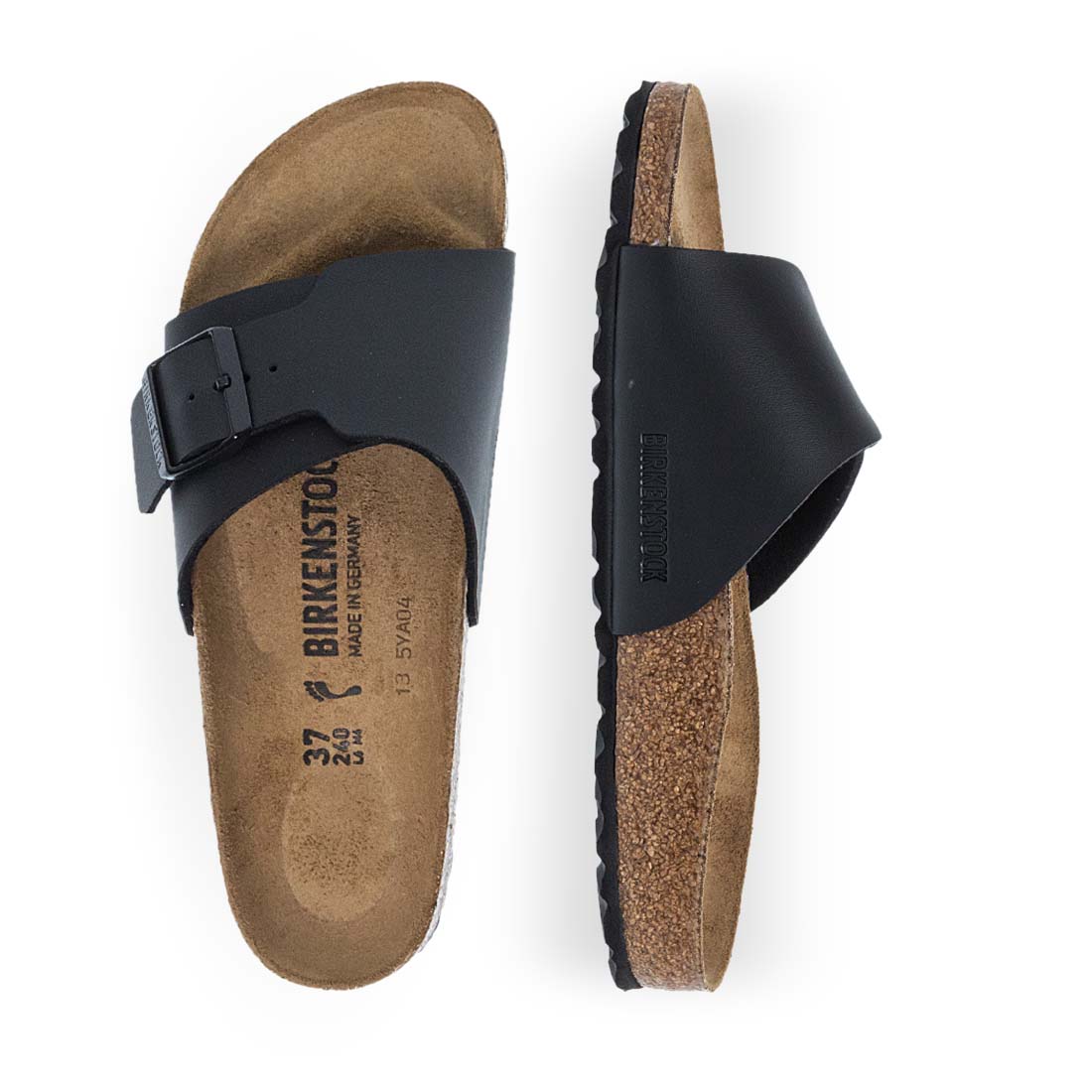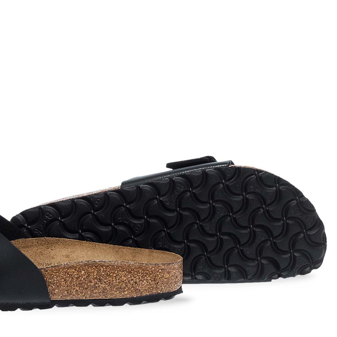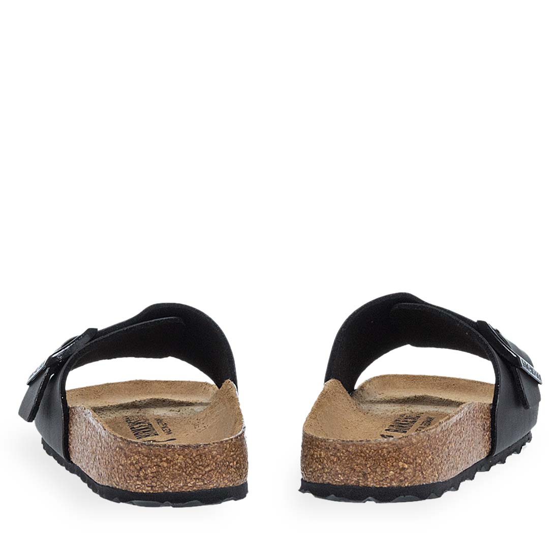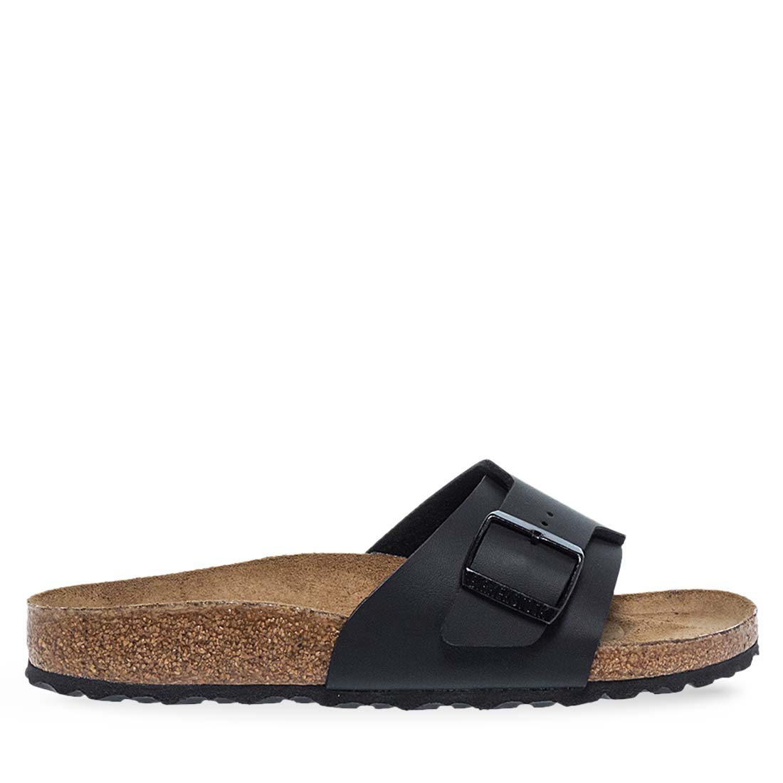 Γυναικεία σανδάλια από το brand Birkenstock. Μαύρο δερμάτινο σανδάλι Birkenstock με πλατύ λουρί και εργονομική σχεδίαση. Regular fit.